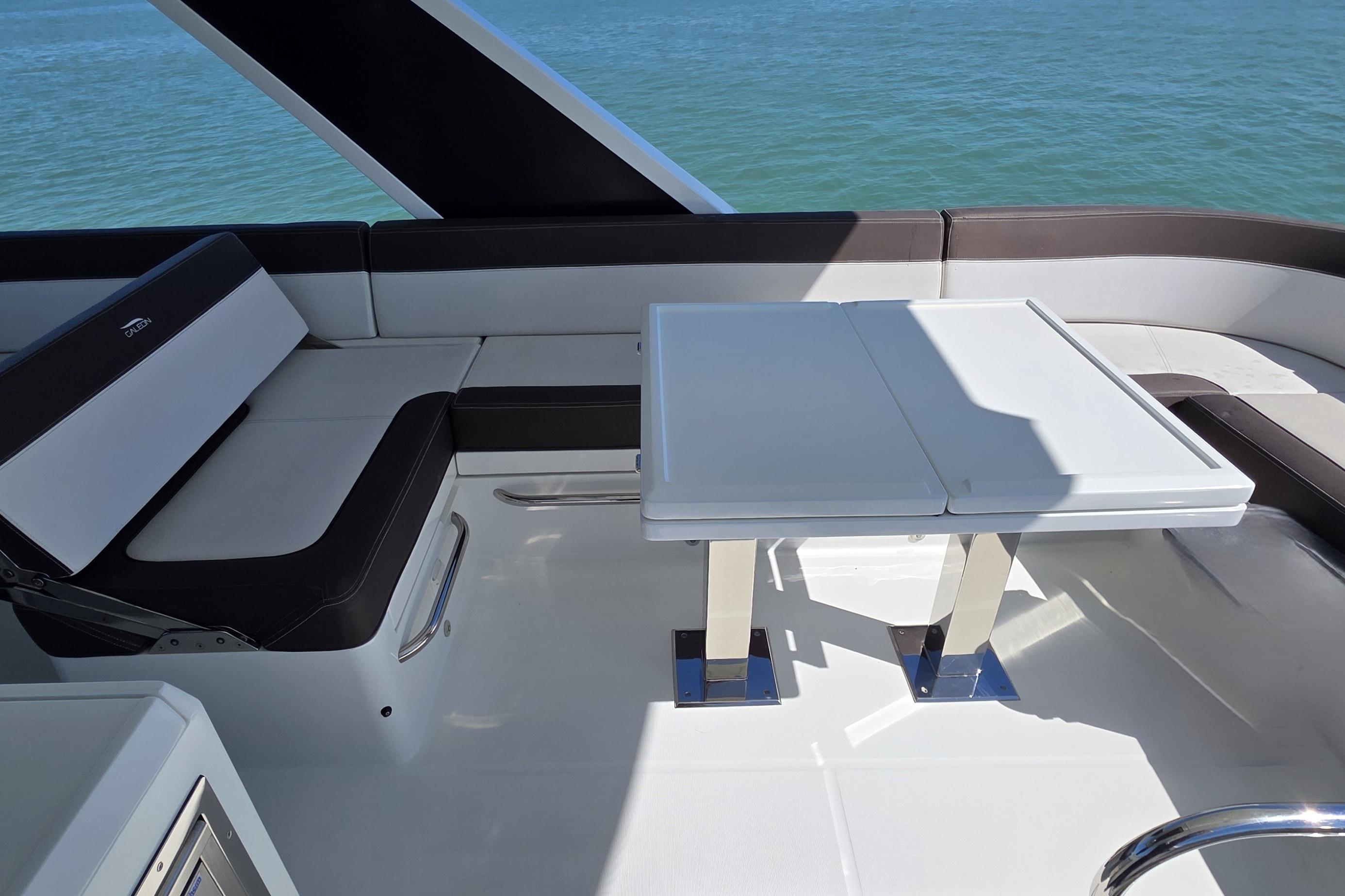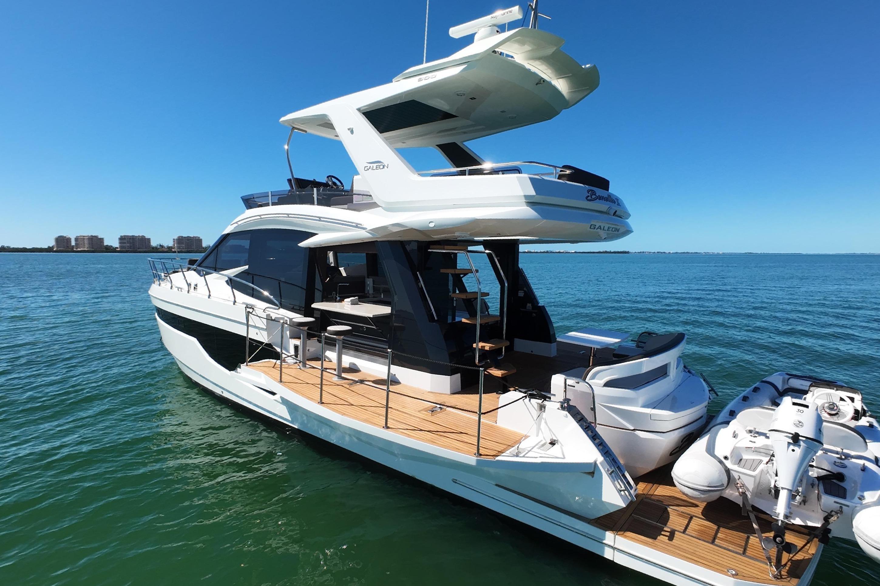 The Galeon 500 Fly's primary mission is to entertain. The innovative fold out bulwarks on the port and starboard sides creates beautiful balconies expanding the beam to 20’ adding 90 sq.ft. to the main deck to include an outdoor bar and lounge area. The aft cockpit settee and a telescoping table sit upon a rotating swivel that rotate a full 360 degrees so that it can face forward or aft toward the hydraulic swim platform or at any angle in between. When the table is lowered, the settee converts into a sun pad. In addition, there is a tender garage under aft garage door for storage or for a tender. On the flybridge, guests can take advantage of high-level features like a wet bar, Kenyon Grill, ice maker, sundecks, seating for 12 people and a folding table to accommodate large gatherings not to mention a second, fully redundant state-of-the-art helm station. Take advantage of this meticulously maintained Yacht. This boat is fully loaded with every available option and has spent much of its life on fresh water. Bottom just painted. Only two owners and never chartered. The owner has spared no expense on keeping this vessel in excellent condition. Additionally, this vessel has a Passport Preferred warranty thru September 2027.The Volvo engines only have 405 hours and 780 hours on the 15kw Onan generator.
