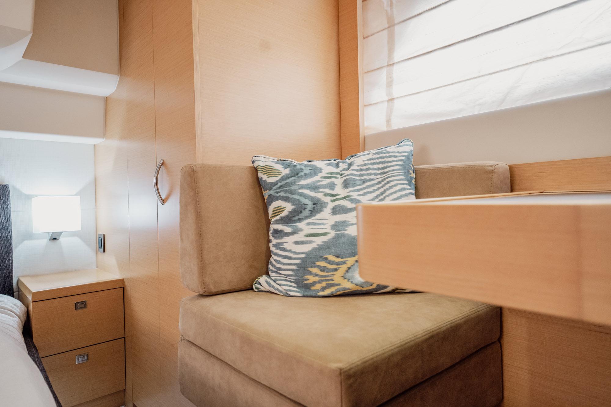 Owner’s Suite Design: Full-beam master stateroom with private stairway, walk-around queen berth, large panoramic windows, 32" flat screen TV, BOSE audio, and en-suite head with stall shower—unrivaled privacy and luxury for a 50’ yacht.