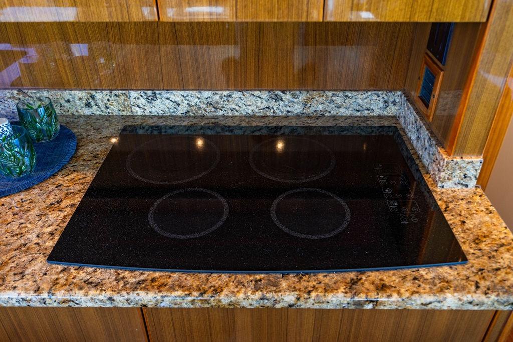 Just forward on the salon main deck level we have a fully equipped galley to port and a dinette to stbd. The galley counter tops are brown speckled granite. She has a 4 burner electric cooktop, deep stainless steel sink, and microwave oven.