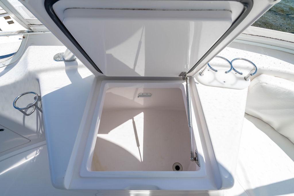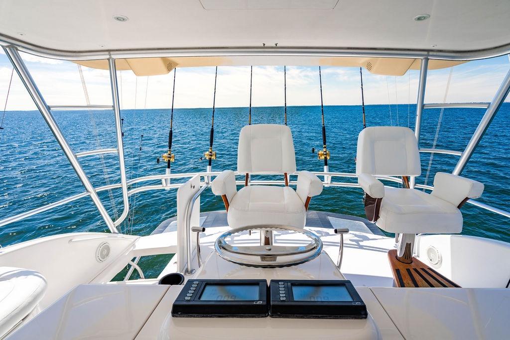Fly bridge is easily accessible from starboard side cockpit ladder. The 56 Viking features the largest and best laid out flybridge in her class. She has excellent visibility with ample seating and storage.