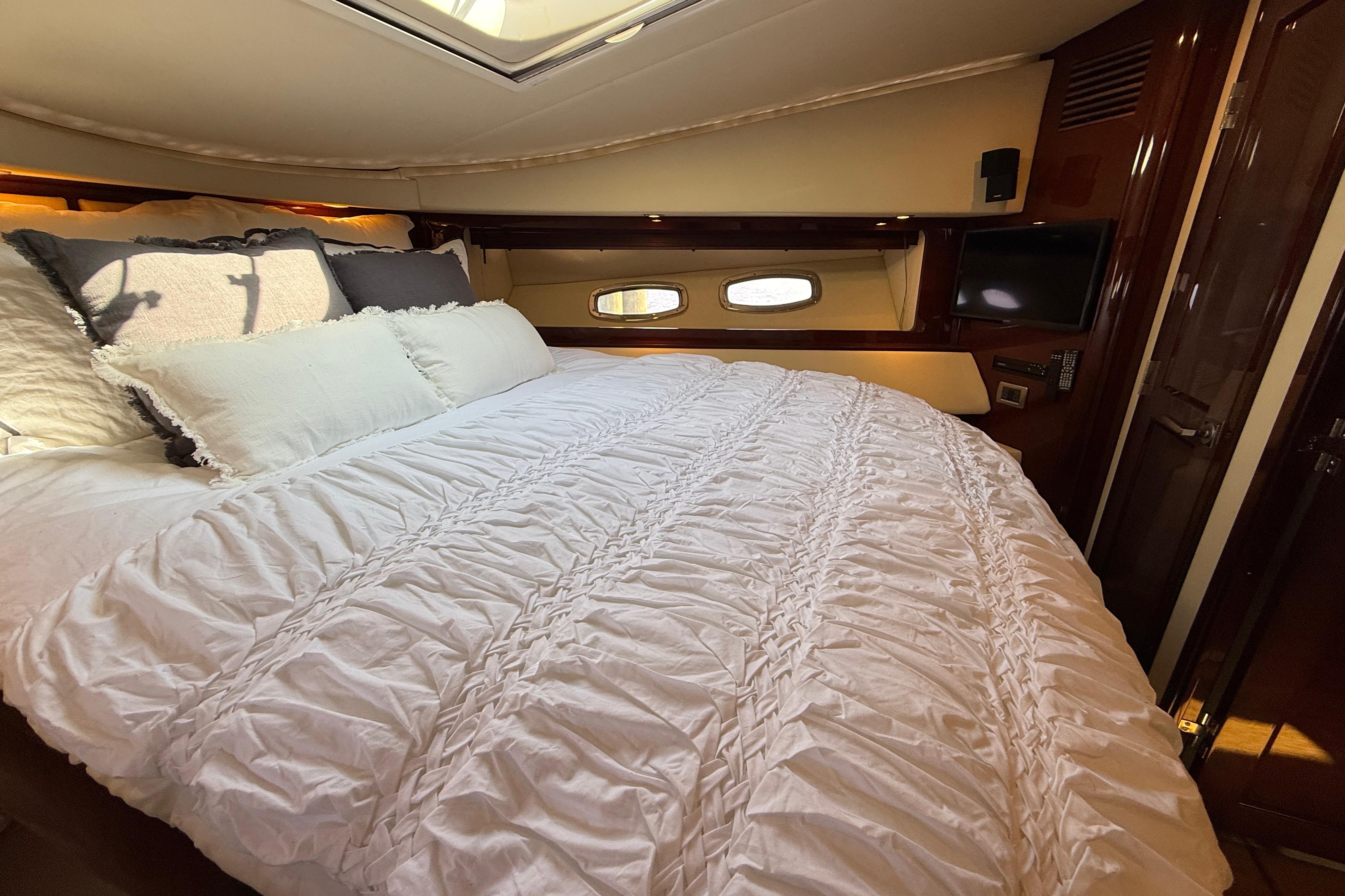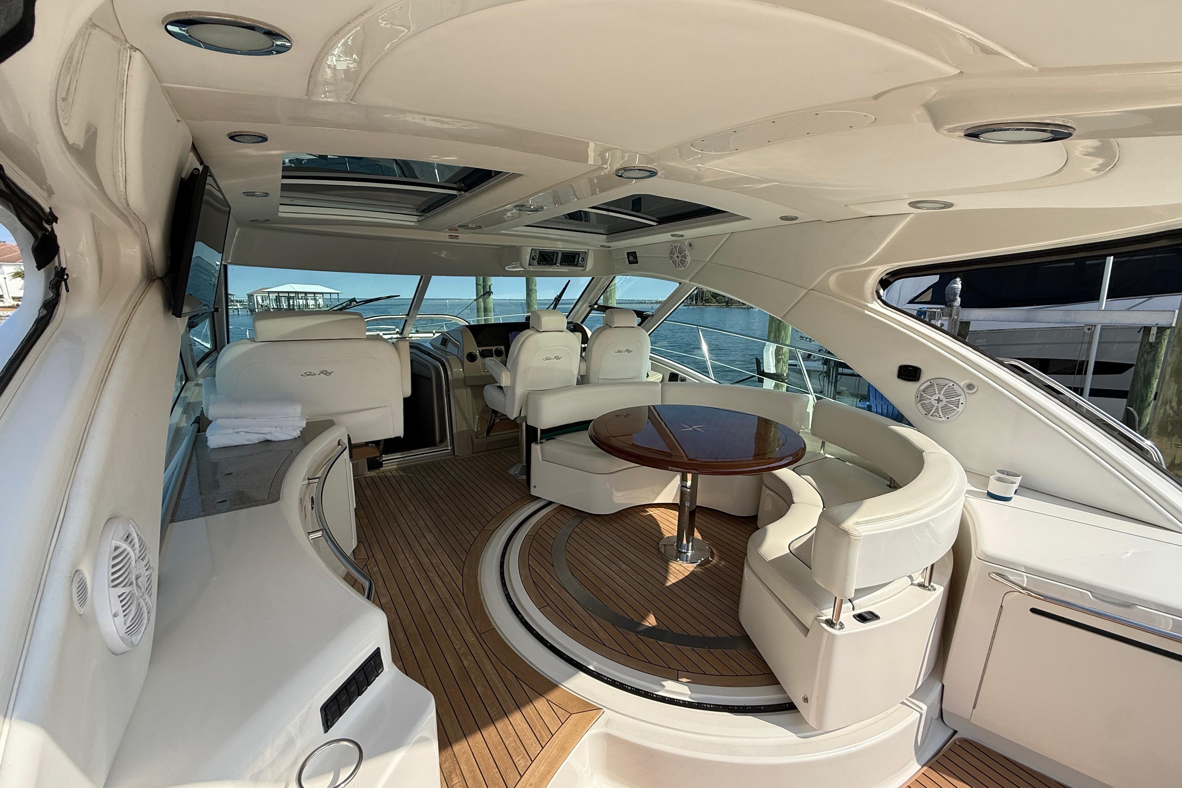 Introducing the stunning 2008 Sea Ray 550 Sundancer, a remarkable cruiser that embodies luxury and performance. With an impressive overall length of 60 feet, this vessel is designed for both comfort and style. The opulent interior is a gorgeous blend of dark cherrywood cabinets, ultra-leather seating and Corian counters which is a match for the finest European yachts of the day. The Sundance's features are impressive beginning with a semi enclosed helm deck with teak flooring, panoramic views and two retractable sunroofs. Below, the salon features an L-shaped leather sofa across from a luxuriously appointed galley with stainless steel appliances and serving counter. The forward VIP stateroom has an island queen berth, dresser, and en suite head with a stall shower. The full beam master suite features a walk around queen berth, dresser, and en suite head with shower. The huge cockpit has an innovative twin- sectional lounge that slides around a table on tracks. Other feature are a cockpit galley with grill, ice maker and refrigerator. The helm has two air conditioner/ heat units for added comfort. The sleek fiberglass hull ensures durability while enhancing its aesthetic appeal and is black in color. Equipped with two powerful MAN diesel engines, each delivering 800 horsepower, the 550 Sundancer promises exhilarating performance on the water. With just over 1500 hours of use, these engines have been well-maintained, are up to date while ensuring reliability for your adventures. The boat has both bow and stern thrusters to make docking easy and enjoyable. The electric windlass adds convenience to your anchoring experience, making it easier to enjoy your time on the water. Whether you're cruising or entertaining, the Sea Ray 550 Sundancer, aptly named "Positive Vibes," is the perfect choice for those seeking a blend of elegance and functionality.