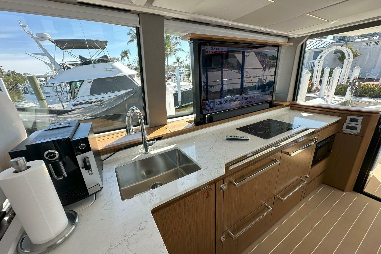 - 55" TV mounted on hi-lo actuator in starboard galley, concealed when not in use; includes soundbar and remote subwoofer