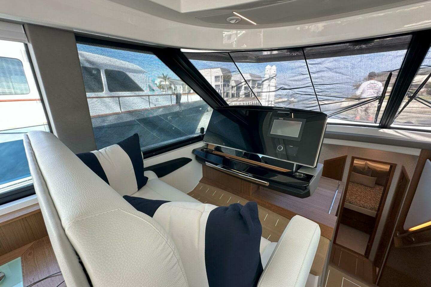 - Two Stidd® 1200W double helm chairs; starboard chair electrically adjusts fore and aft and includes armrest with built-in joystick and Garmin® GRID remote