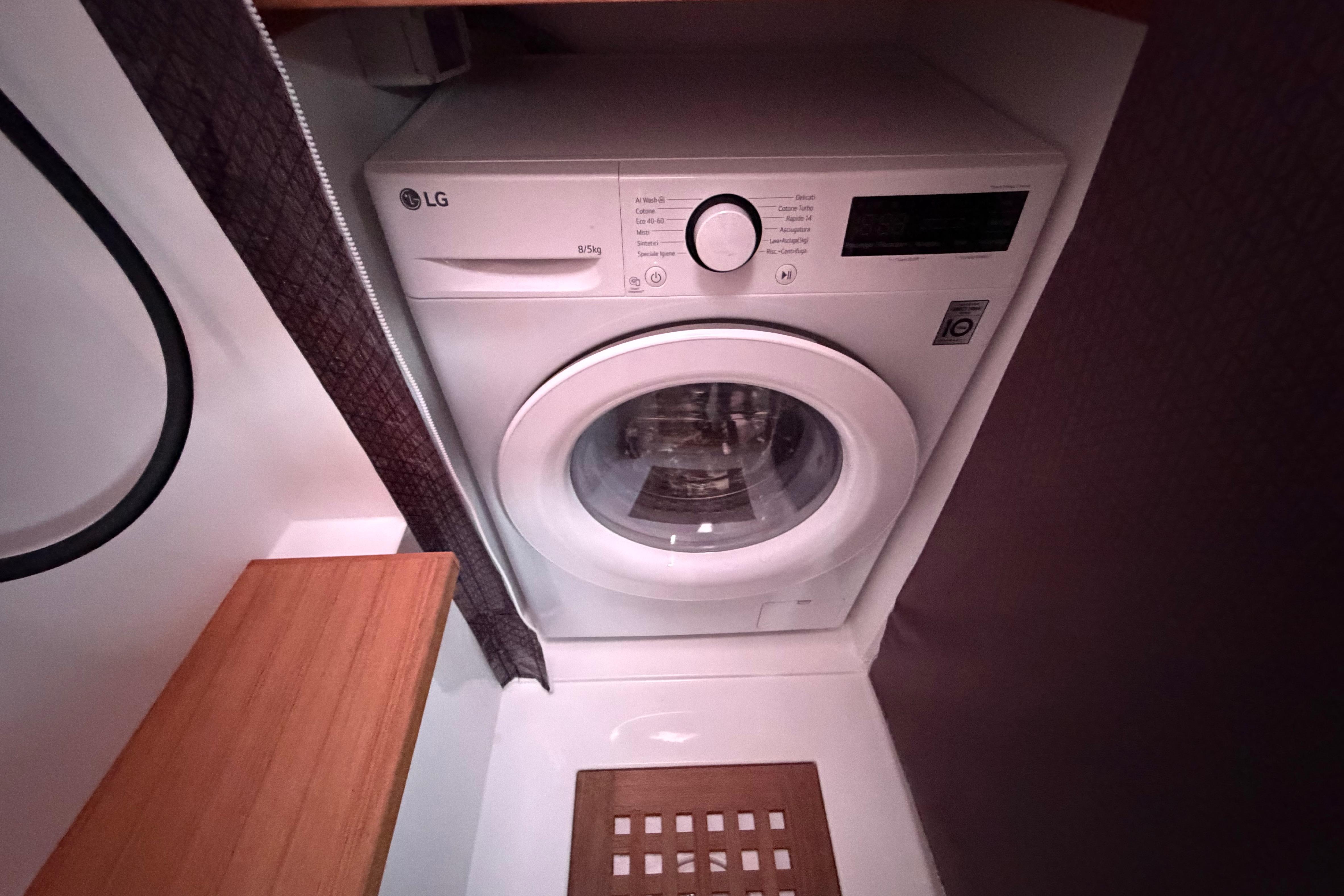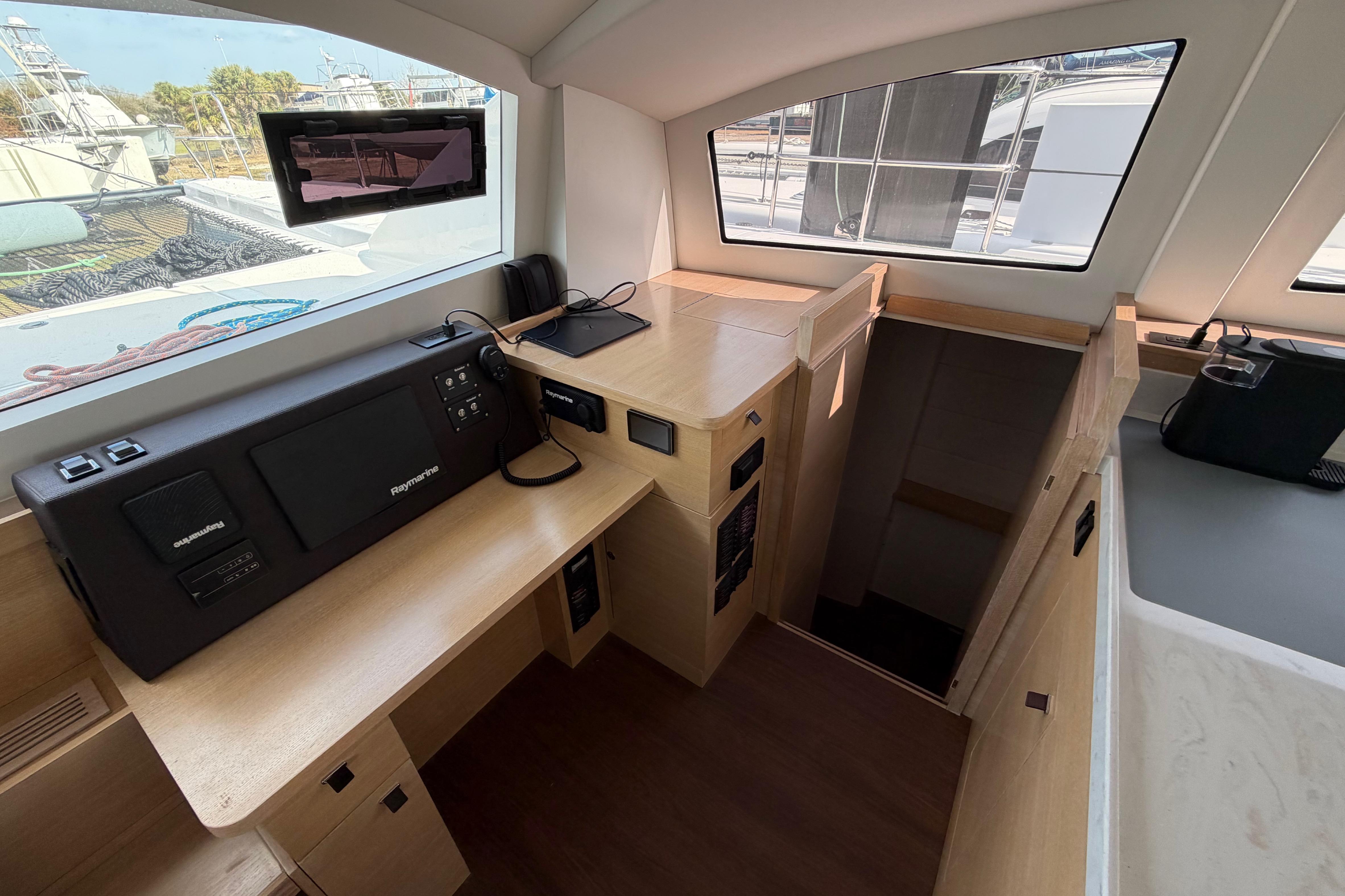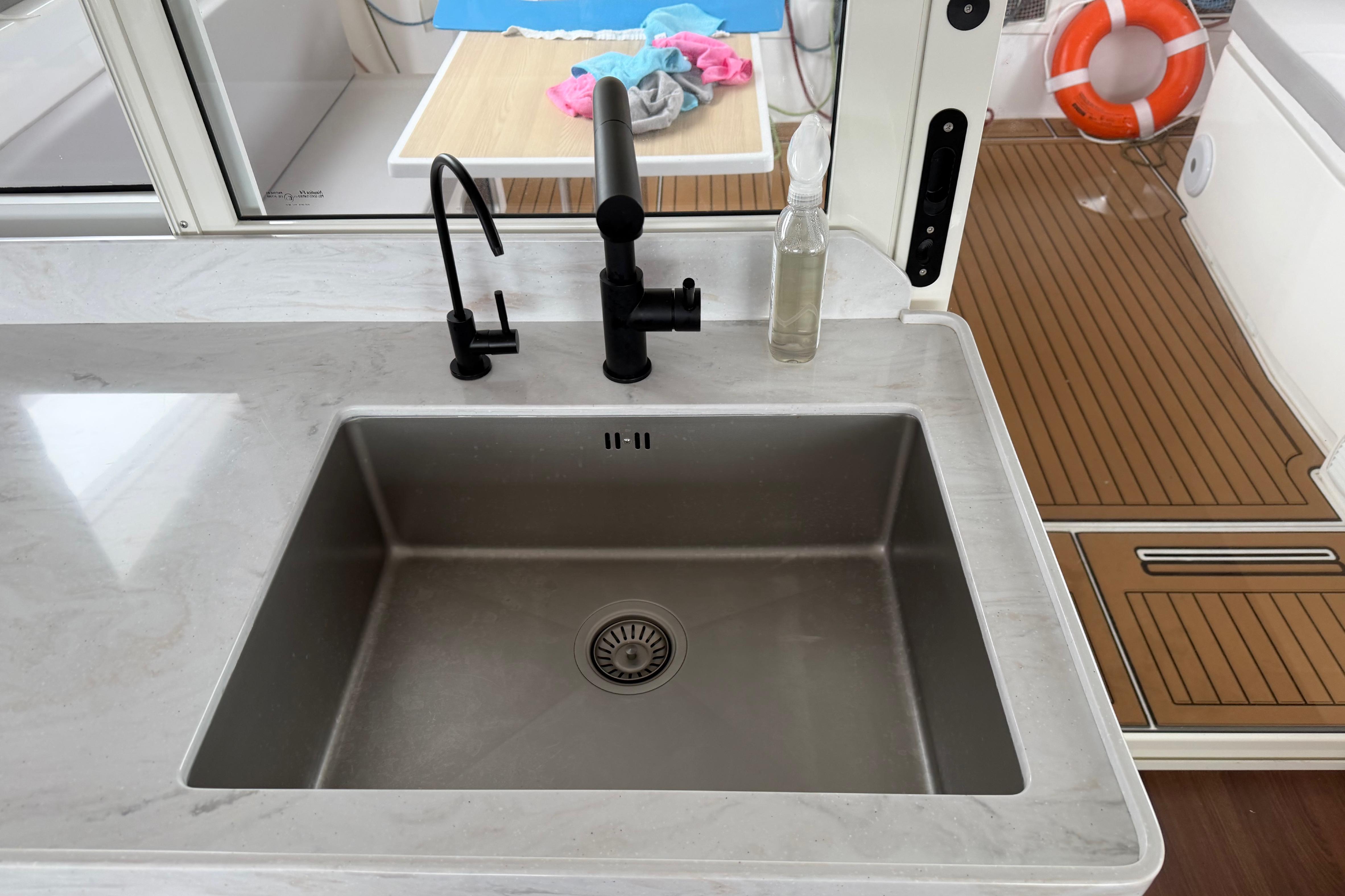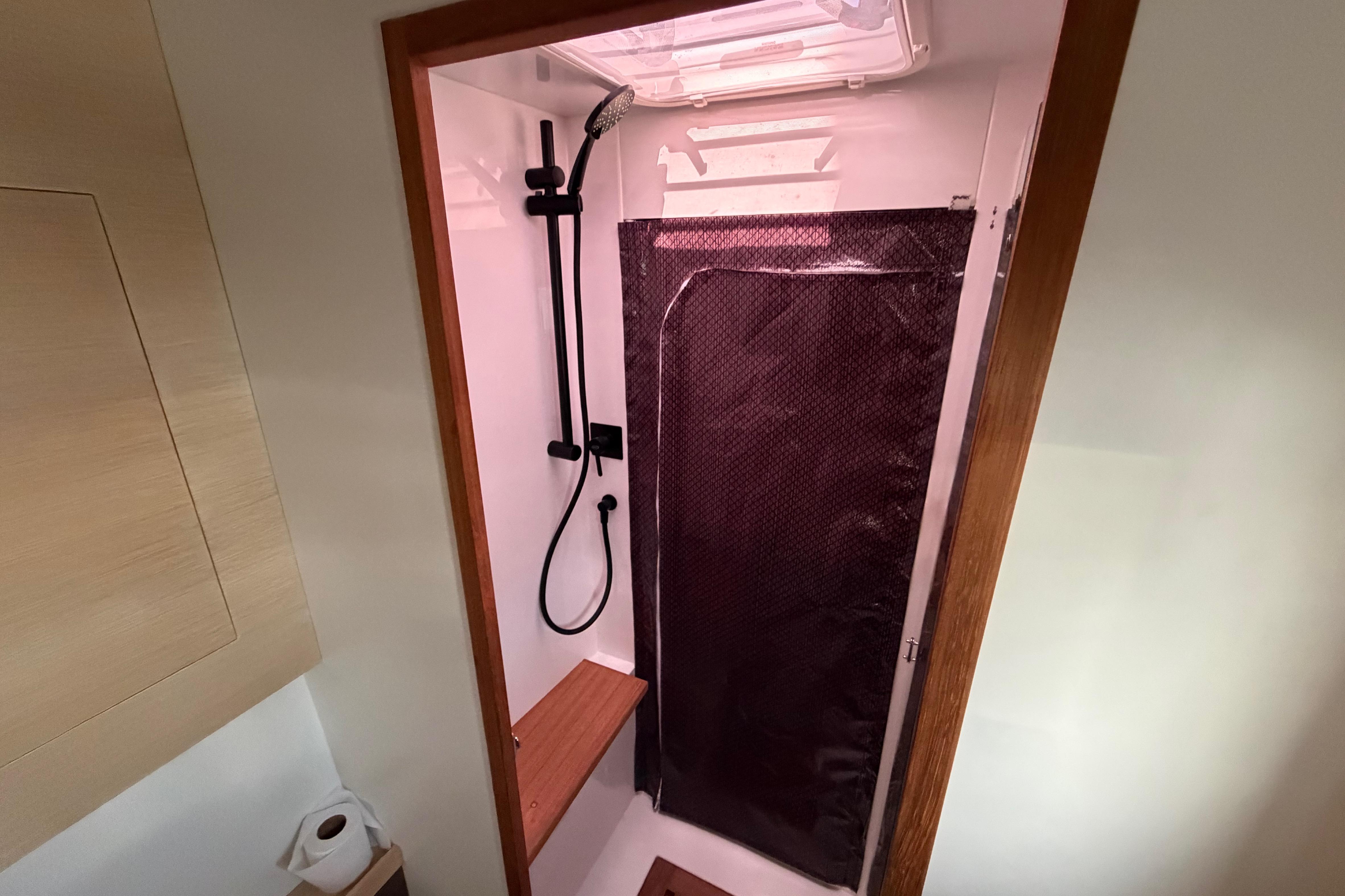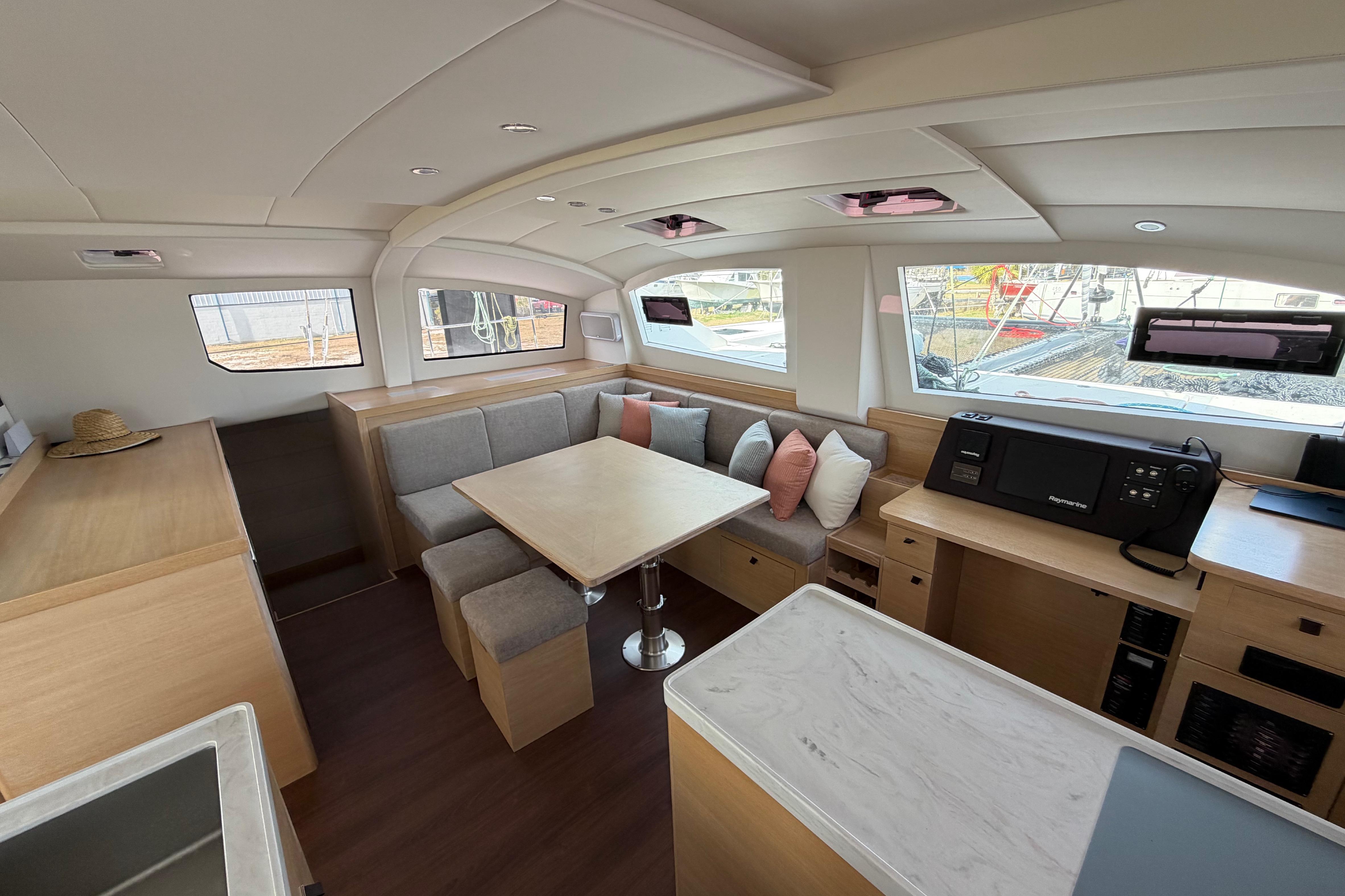 Aurora’s interior is finished in natural white oak throughout — floors, ceiling panels, bulkhead trim — and is beautifully accented with eco-leather headliners and custom upholstery. The saloon and cockpit share a single level connected by a full-length panoramic sliding glass door, creating one expansive open-plan living space that works equally well at anchor or underway. The galley is positioned to starboard in the saloon with a four-burner hob, large stainless steel undermount sink, fridge, freezer, additional fridge unit, and microwave. The starboard hull houses the owner’s suite aft with an en-suite head and separate stall shower. The port hull features an aft guest cabin and a forward cabin with a shared head and shower — the Club arrangement that provides the best balance of entertaining space and overnight capacity.