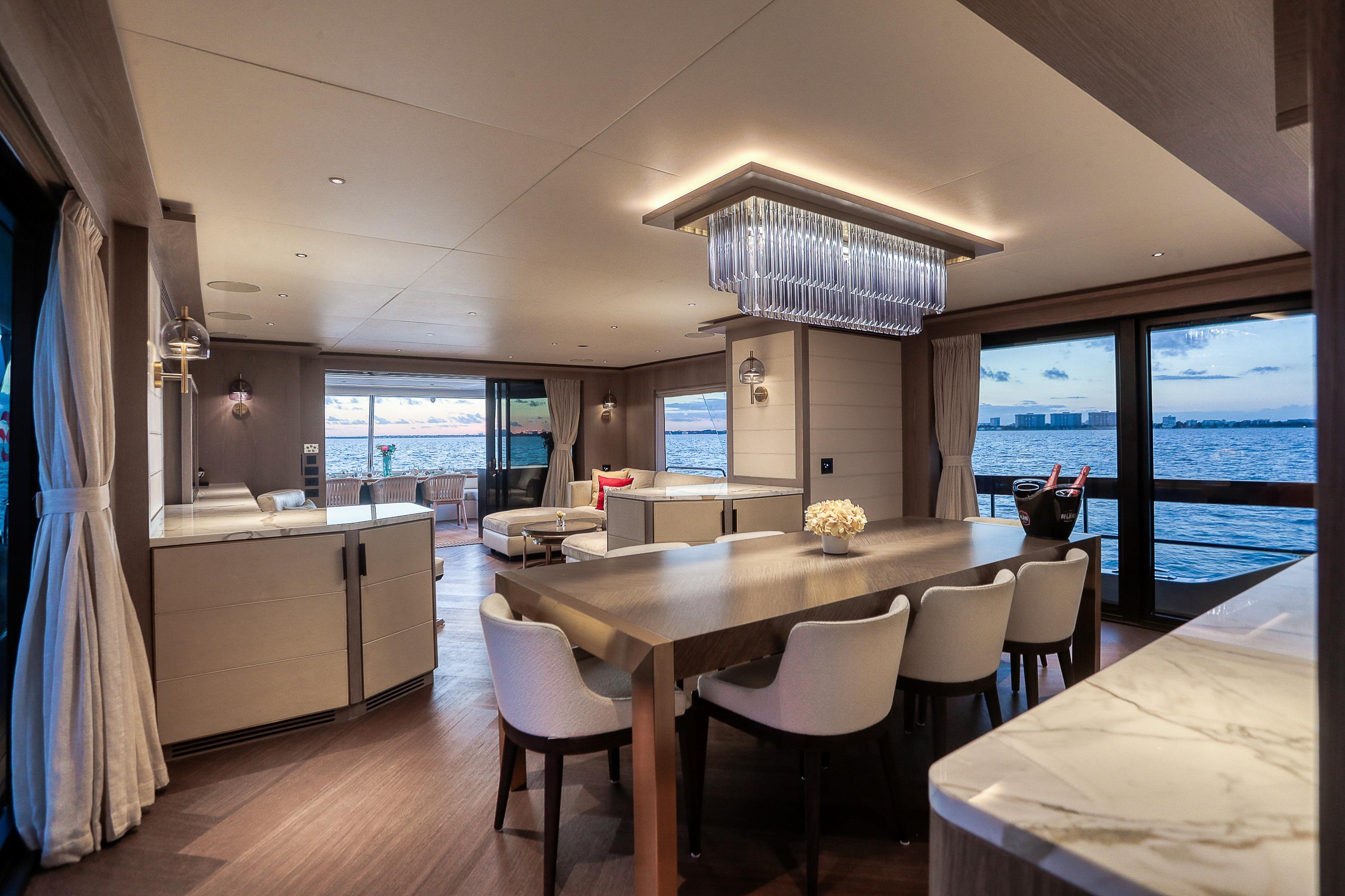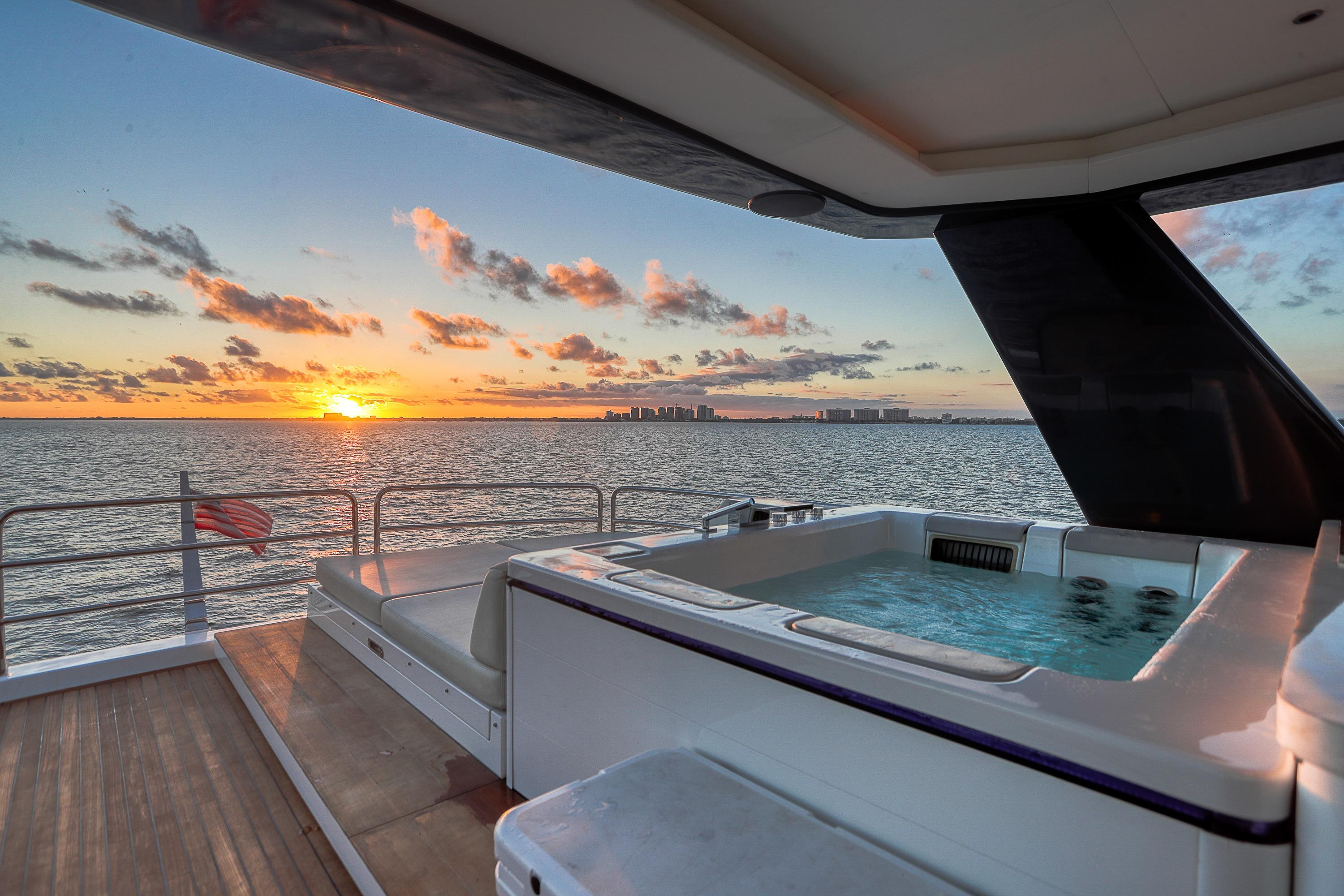 The expansive flybridge is larger than you would find on some 100 footers! Some of the features include a large bar with 4 swivel bar stools and a flip down TV, Refrigerator, Ice Maker, Dining Table with backlit marble inlay, Wolf LP Gas Grill with food prep area and slide out Yeti Cooler, 4-Person Hot Tub with LED Lighting, and a very large aft Sunpad with Storage beneath.