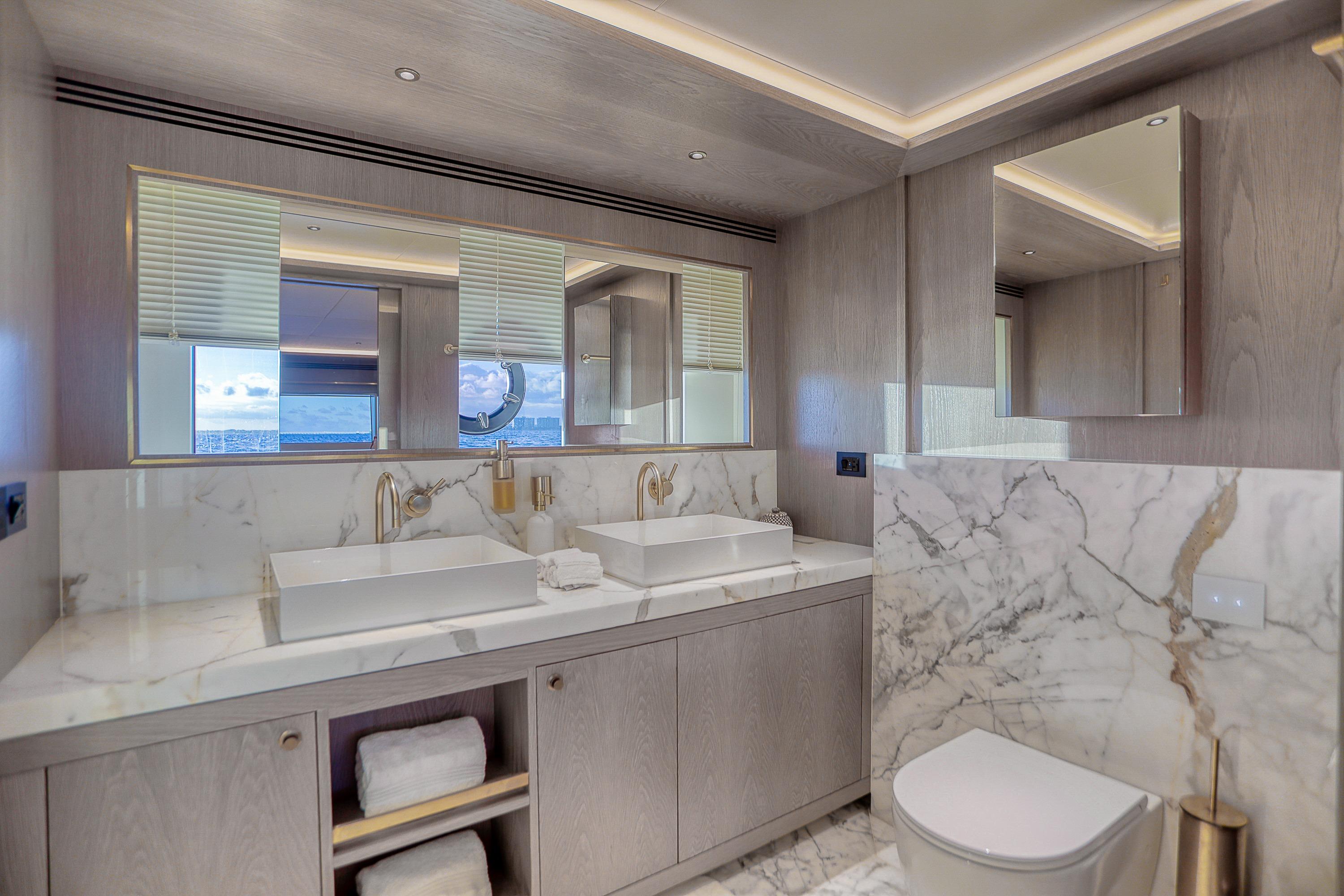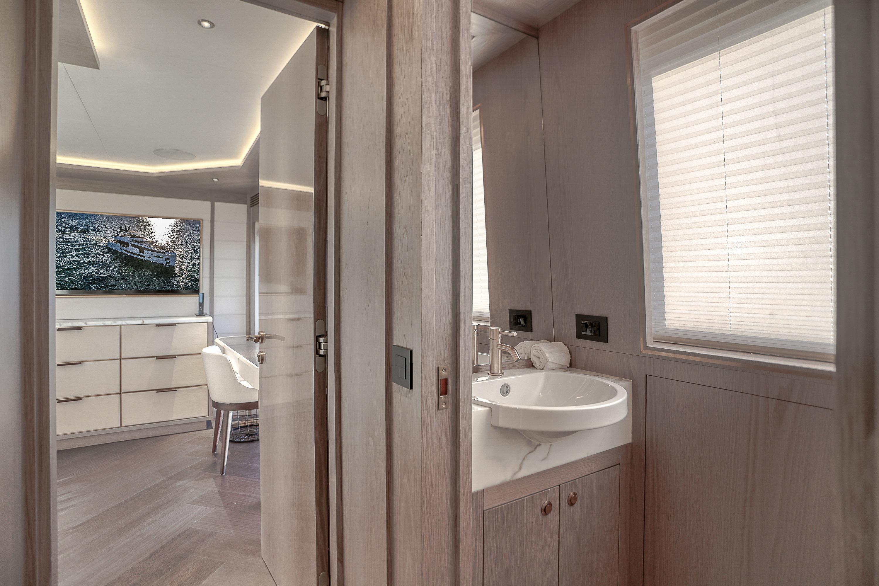 The Sirena 88 Raised Pilot House hull was designed by renowned naval architect German Frers with her interior designed by the Dutch design studio Cor D. Rover. Her 5 state room (Plus 2 Crew Staterooms) layout must be seen to appreciate. The main deck master cabin is forward of the spacious main salon and interior dining table. Forward of the owners cabin is the spa like master head. To port is a shower/steam room with wrap around tile seating. To starboard is a staircase that leads to the private plunge pool on the bow. There are two very large VIP guest cabins forward and aft, and two twin cabins below decks all with well appointed en suite heads.