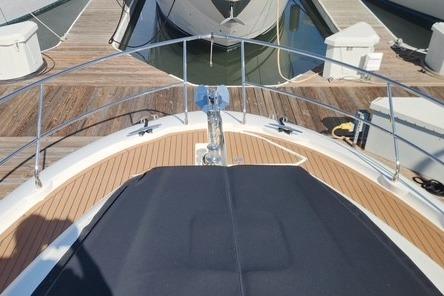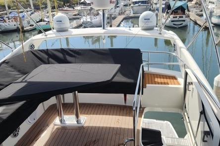 Her exterior features are equally impressive, including a hydraulic swim platform, underwater lights, teak-laid cockpit, and wide side decks for safe movement fore and aft. The expansive flybridge is a true highlight, offering generous sun loungers, ample seating, a wet bar, and a fully equipped upper helm—perfect for entertaining or relaxing underway.