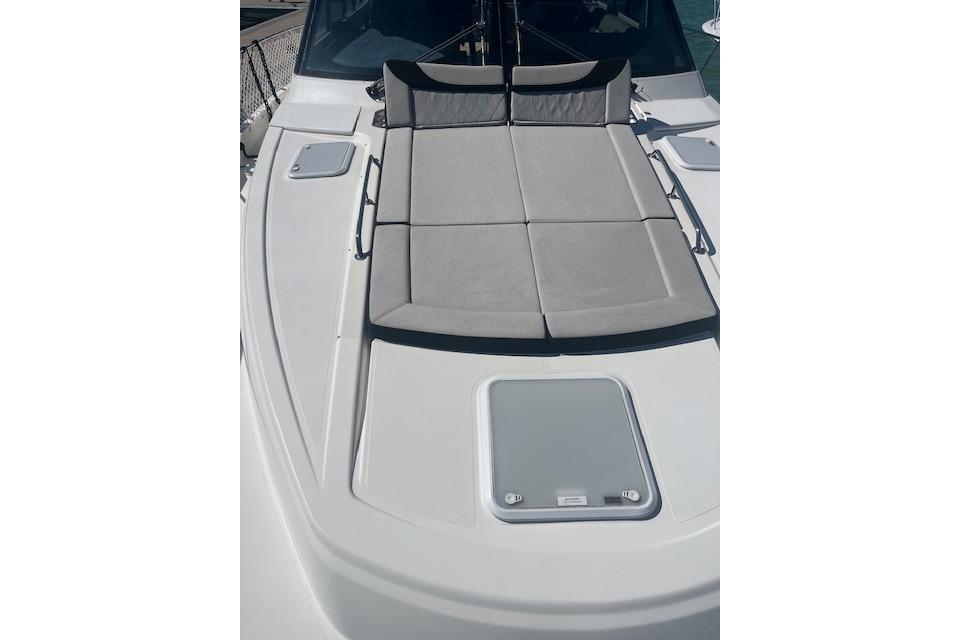 The helm is fully equipped with engine displays, bow and stern cameras, bow anchor camera, night vision camera, bow thruster, windlass anchor controls, spotlight switch, Seakeeper display, and motorized dual antennas. Port and starboard joystick docking stations are also located at the aft of the vessel for effortless maneuvering.