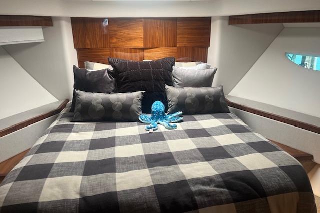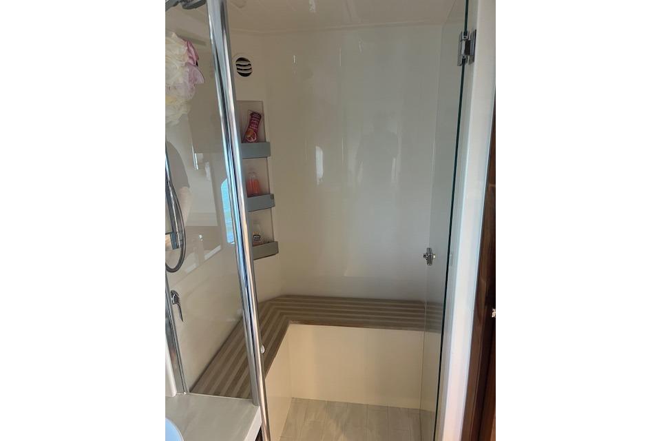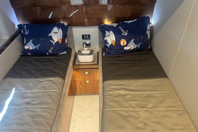 Below deck, the accommodations are thoughtfully arranged for owners and guests alike. To port, a versatile lounge converts into an additional berth. The full-beam master stateroom features a walk-in closet, additional walk-in storage with engine room access, large hull windows, a spacious ensuite head with bidet seat, and a large TV. Forward are two guest staterooms to port and starboard, each with twin berths and TVs, followed by a forward VIP stateroom with a private ensuite and TV. In total, the yacht offers three staterooms and three heads.
