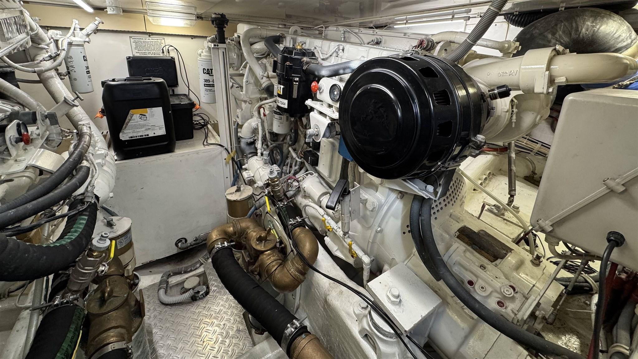 The salon - galley - dinette layout is spacious and practical. There is room to relax or entertain in comfort with a full complement of standard features and amenities. The second cabin is unique, with side by side twin berths instead of the more common over and under berths. Unusual in a boat of this size is the elevated cocktail area forward of the dinette, and the possibility of a washer & dryer stack in the companionway. On the practical side, much attention was paid to the organization and layout of the engine room. The fuel tank was put amidships to minimize the effect of fuel load on trim. It also acts as an effective insulator of noise and engine room heat for the forward cabin area. Careful layout of major components makes maintenance very easy.