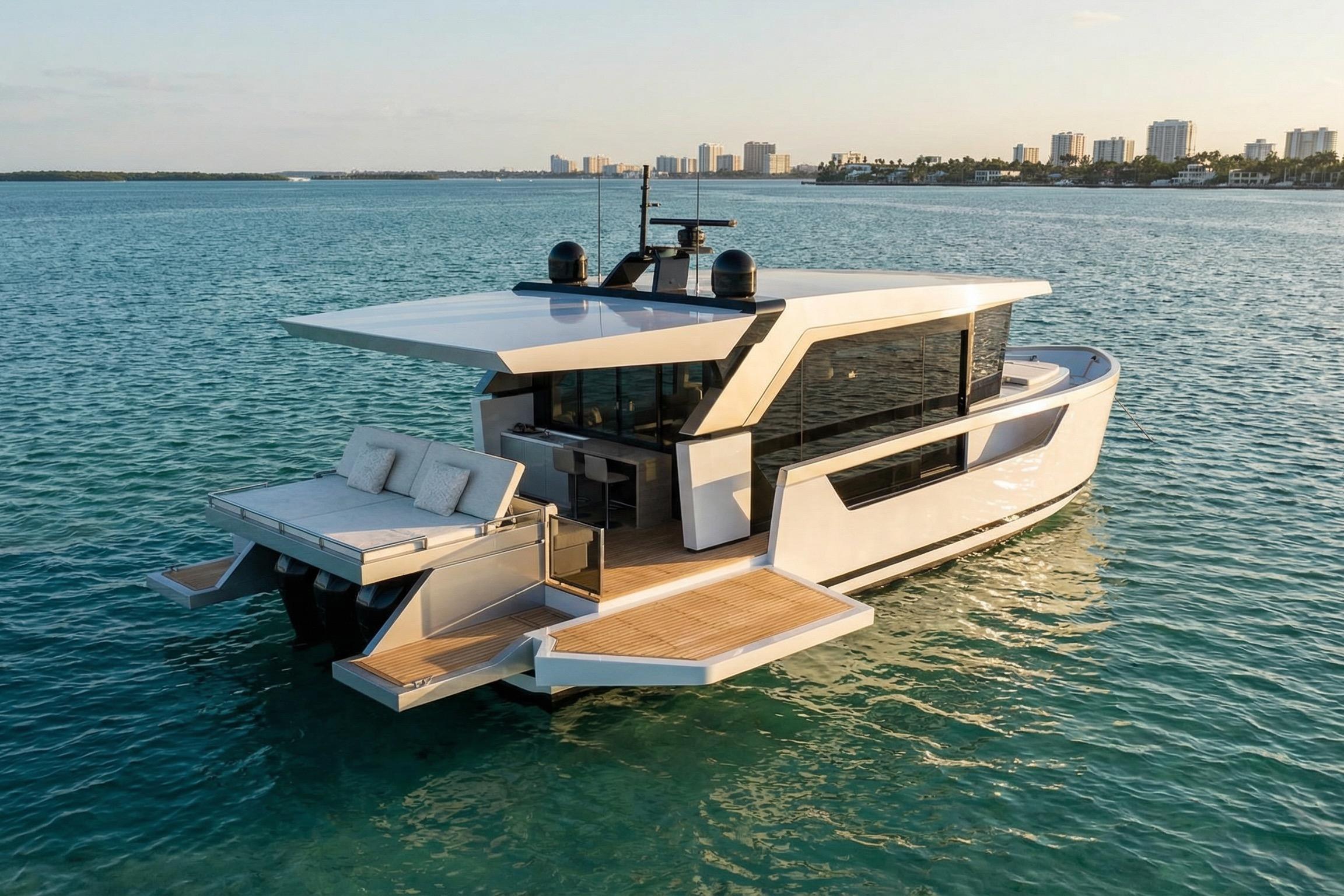 Folding side platforms expand the cockpit beam at anchor, creating a true waterside terrace. Three sliding glass doors, port, starboard, and aft, transform the enclosed salon into an open air entertaining environment with seamless indoor outdoor flow.