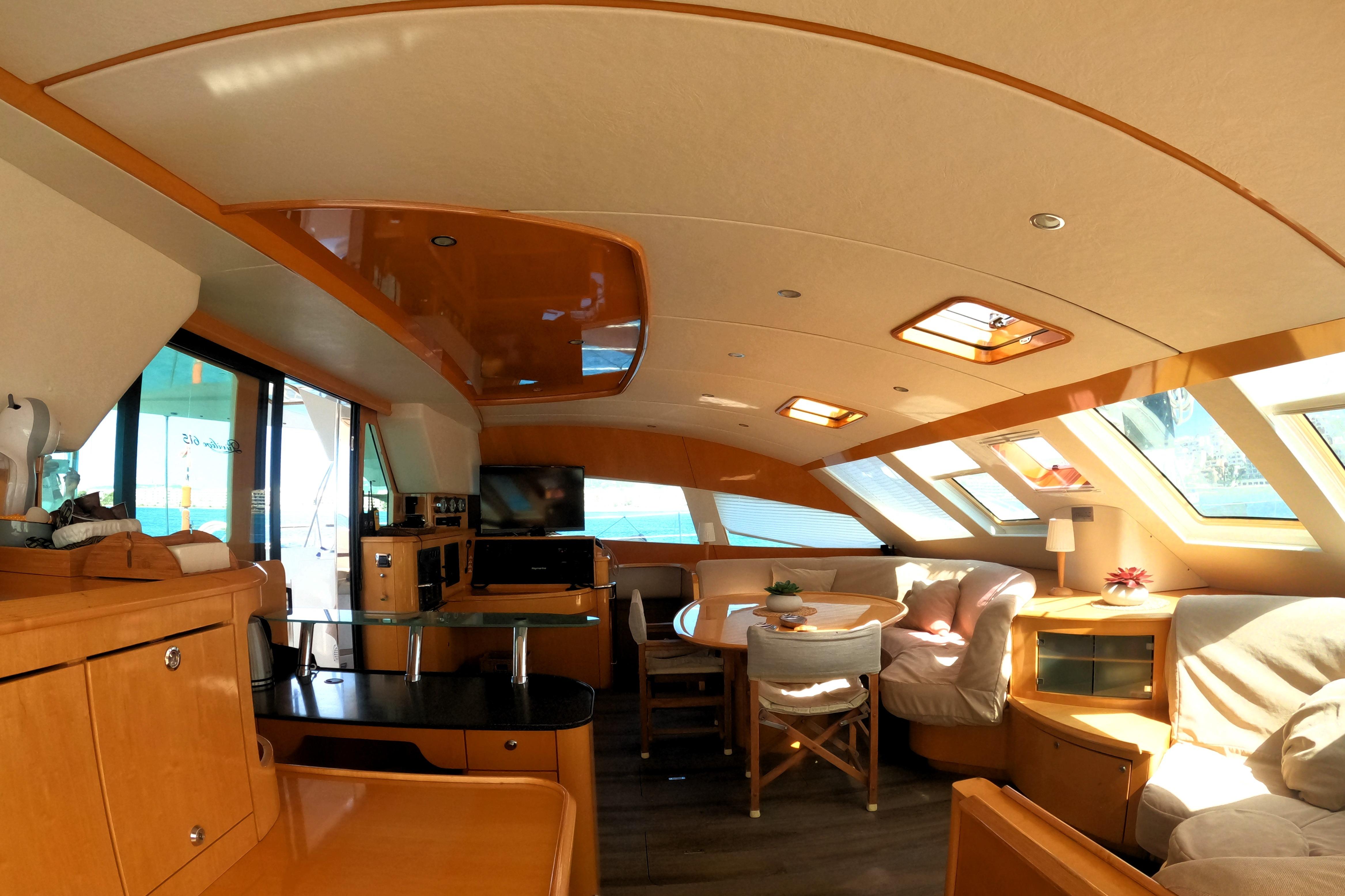 El salón, muy amplio, cuenta con dos zonas de sofás, una con gran mesa comedor, además hay mueble bar y mesa de cartas. La cocina esta abajo en el lado de estribor. Cocina super completa con 2 neveras, 1 congelador, horno, microondas, lavavajilla, dos fregaderos, cocina de gas de 4 fogones + placa eléctrica de 2 fogones. Además cuenta con mucho espacio de estiba tanto en la cocina como en el salón, teniendo el salón 5 cofres de estiba enormes con estantes. Todo el interior es de combinado el techo forrado de tela polipiel y las paredes de madera barnizada. Todos los acabados son de alta calidad.