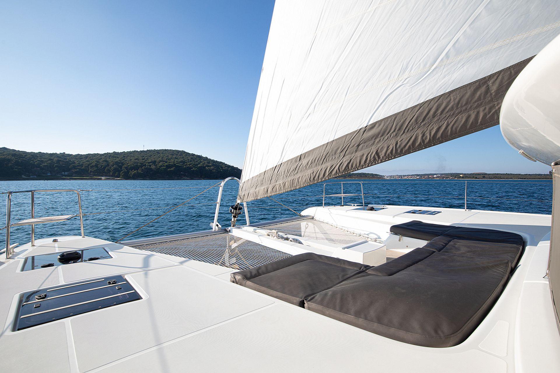 - Large storage/sail lockers in the bows of both hulls