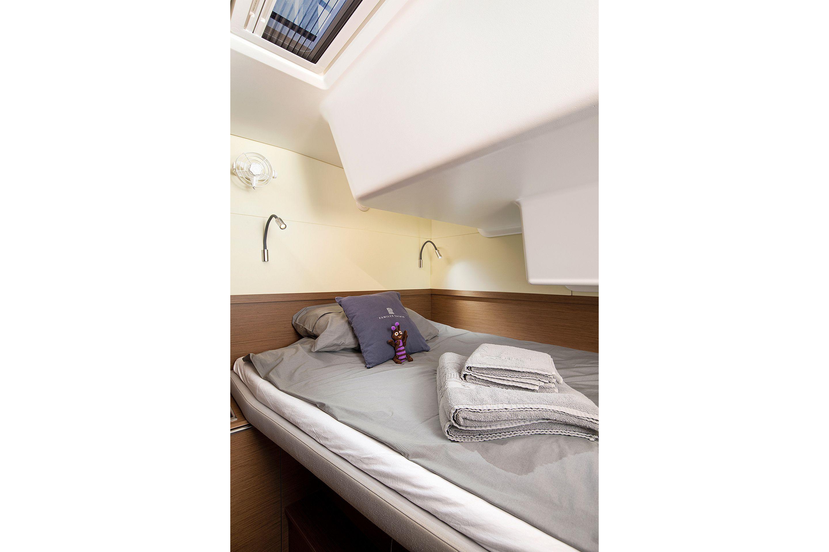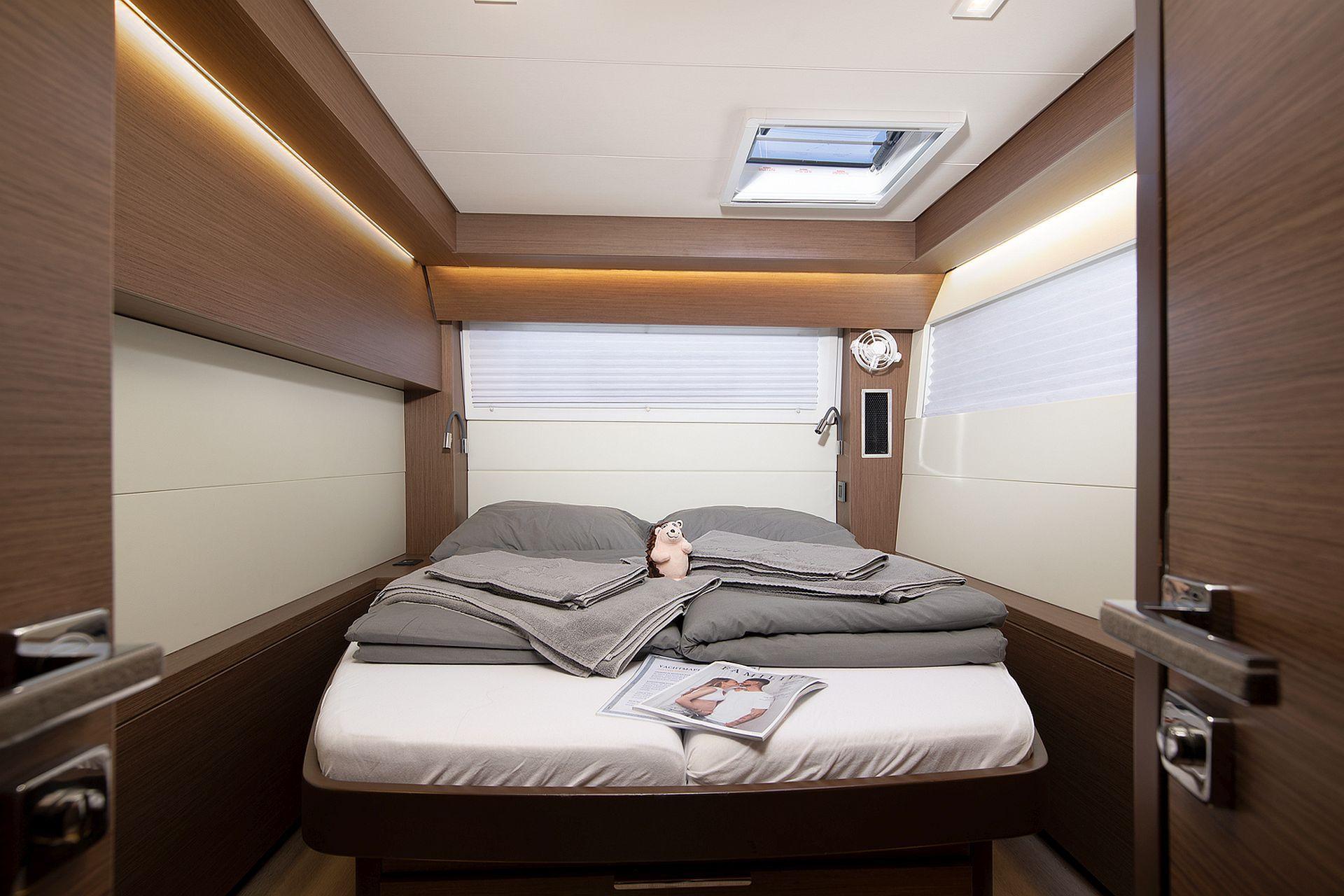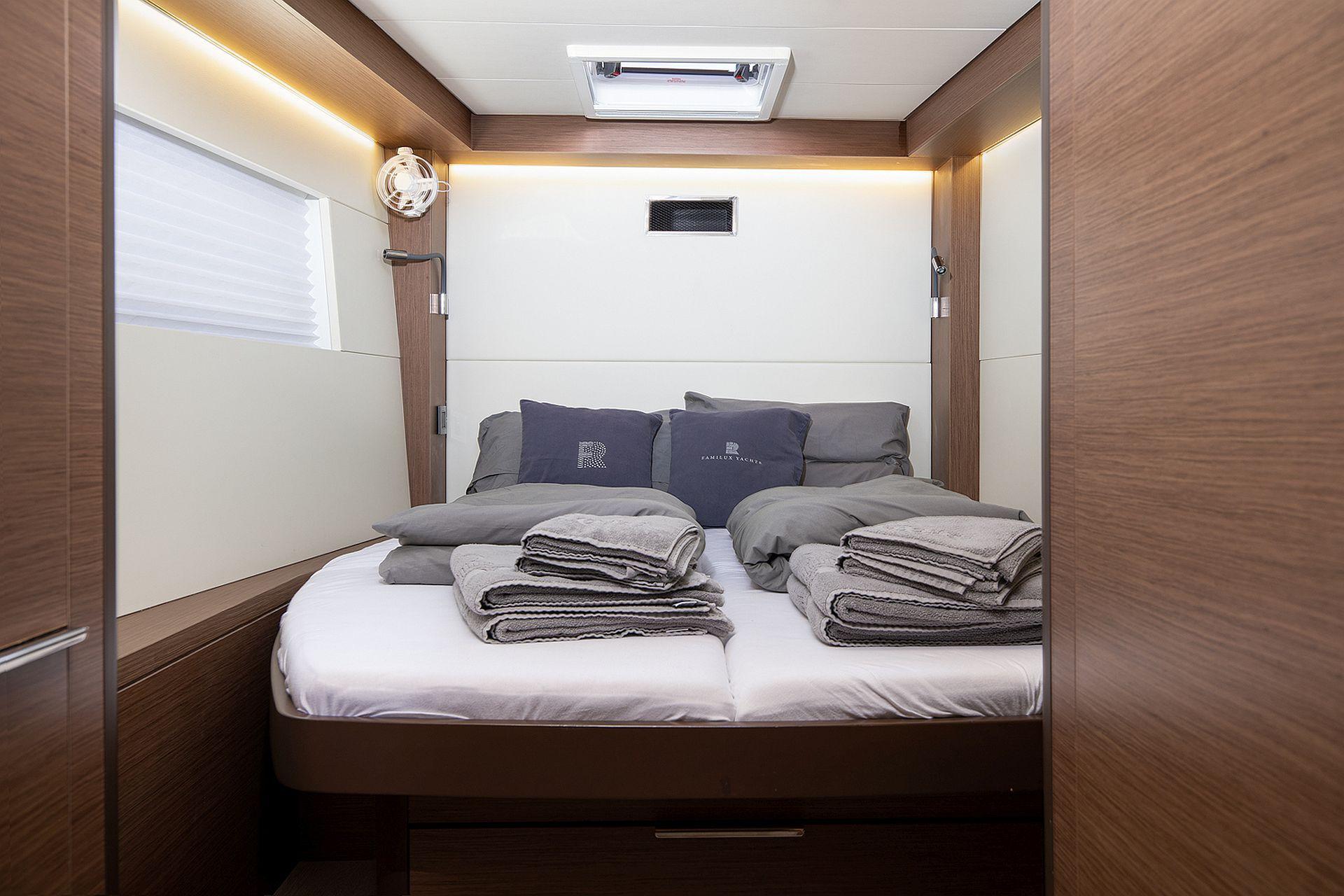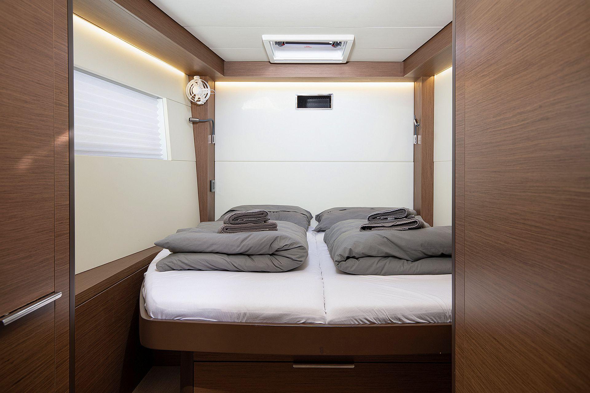 - Two forward cabins with double berth, locker, storage, hull window and deck hatch