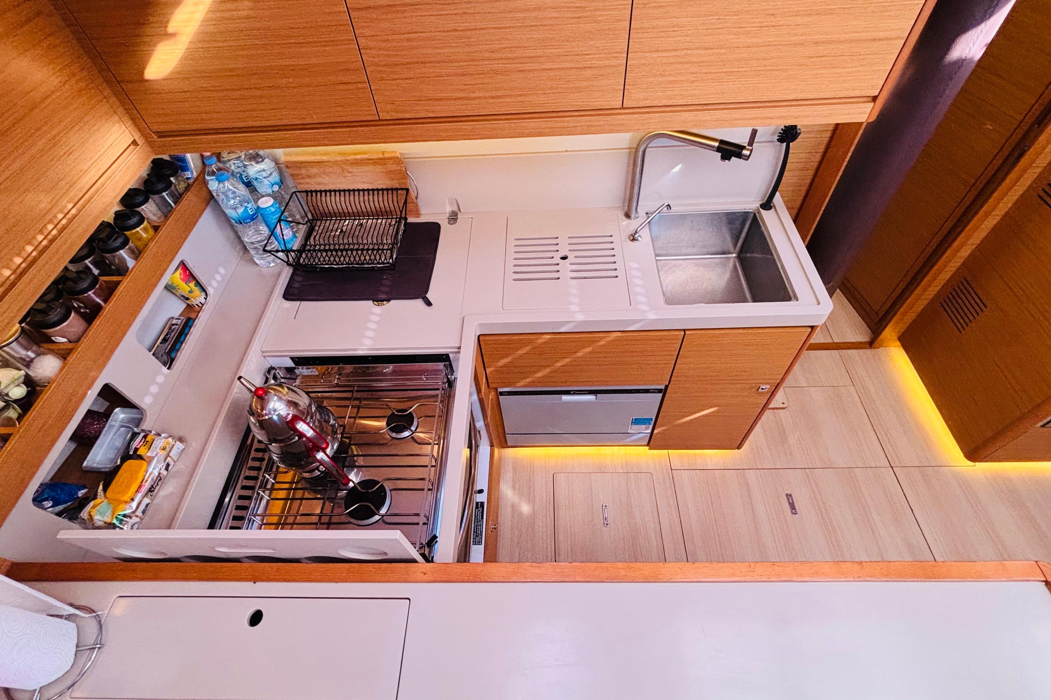 Energy independence is ensured by an 8.5 kW Fischer Panda generator and 350W total solar panel power, while a 120 L/hour capacity water maker offers maximum freedom on extended blue voyages. The air conditioning system and dishwasher create a living space that rivals home comfort, whether in port or on the open sea.
