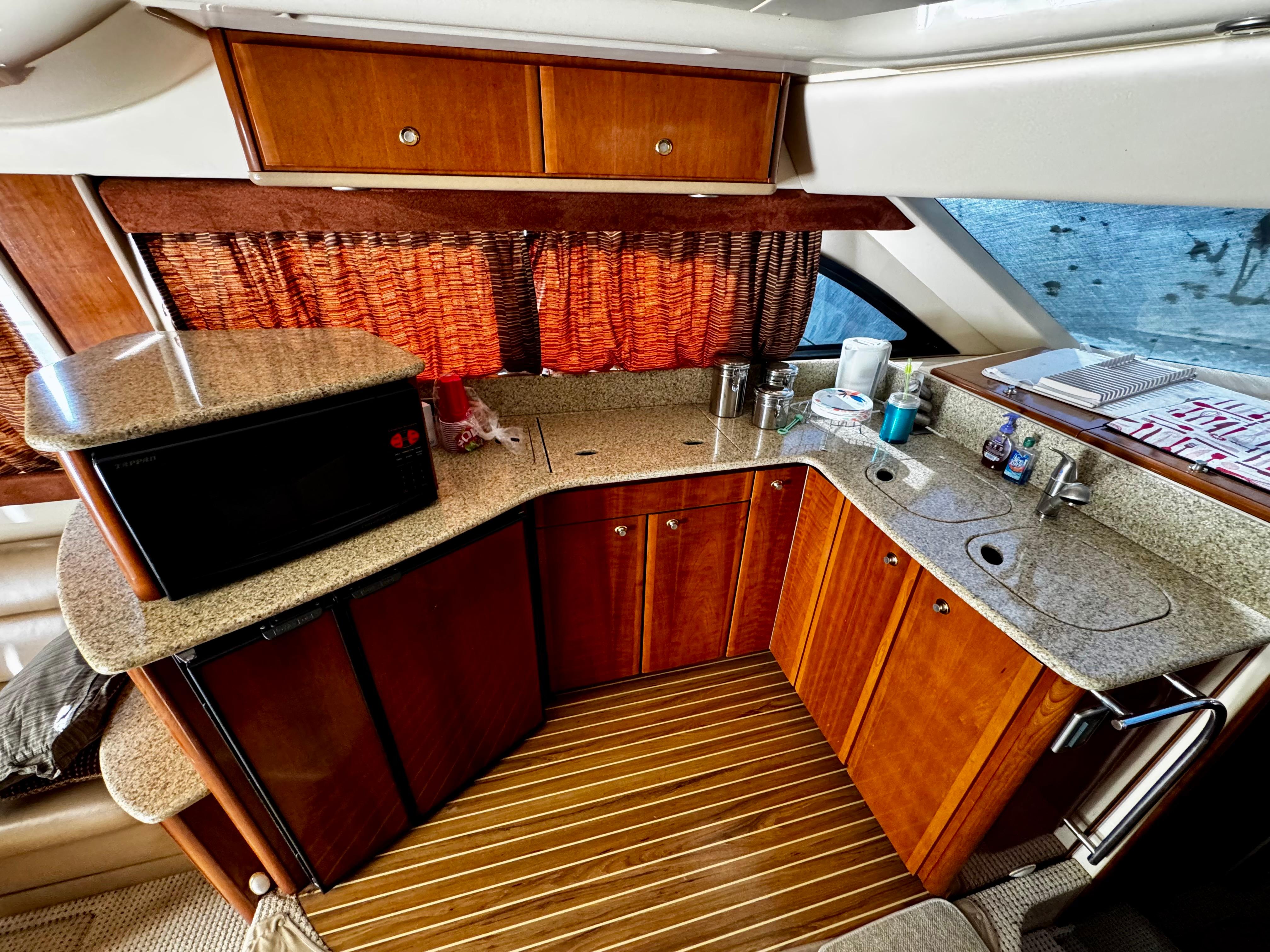 The full galley includes modern appliances, solid surface countertops, and plentiful cabinetry—making meal prep effortless while underway