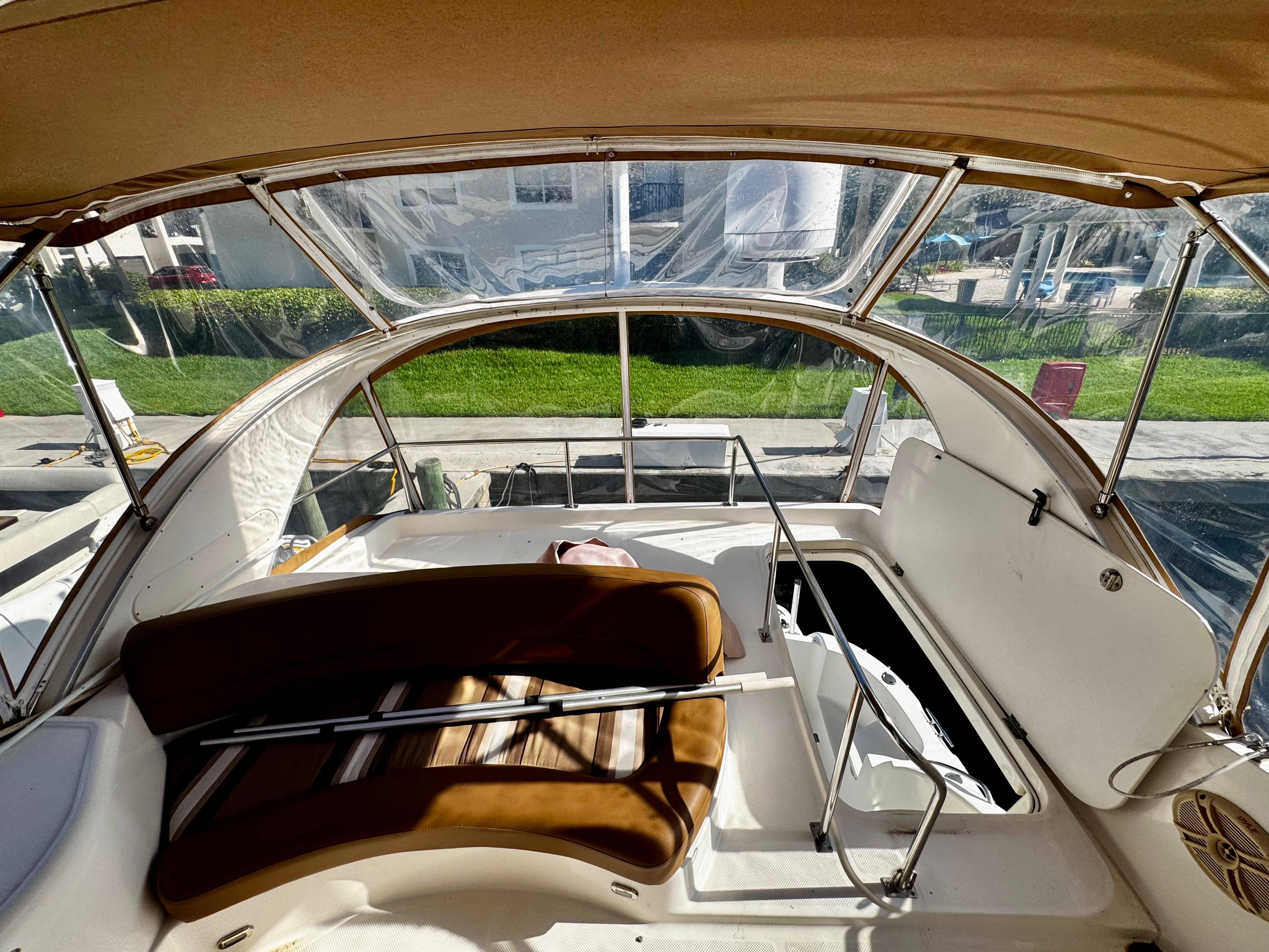 The flybridge is enclosed with a durable acrylic cover, which can be opened to allow airflow and sunshine while still offering protection when needed