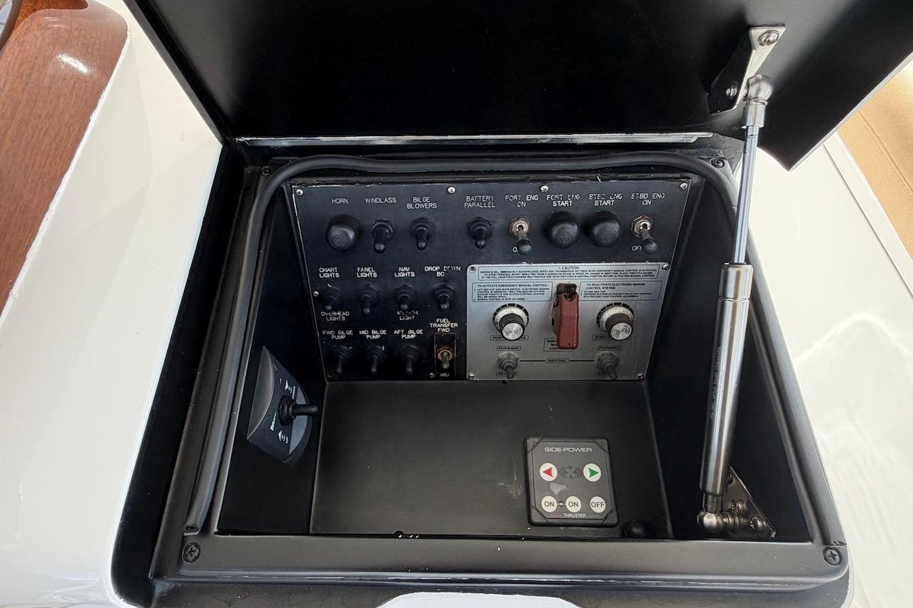 Custom teak helm pod with single lever electronic controls refinished in 2022