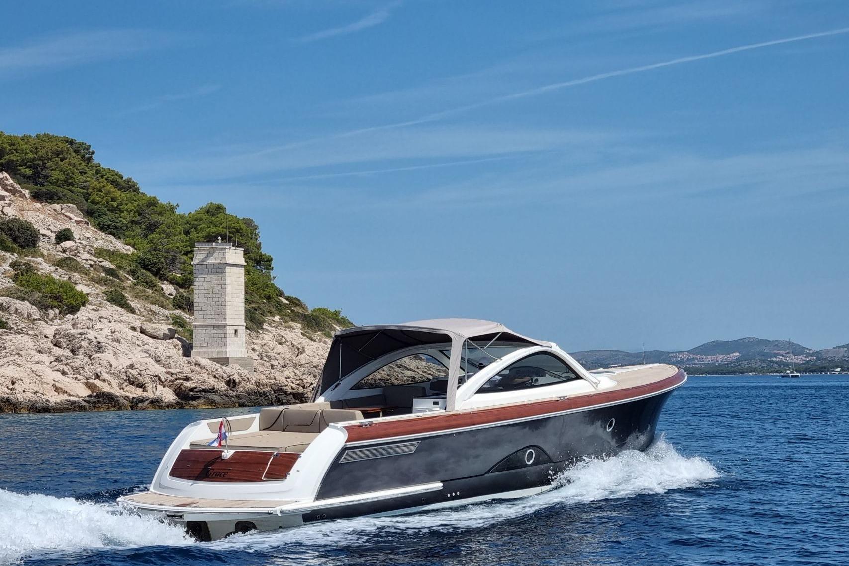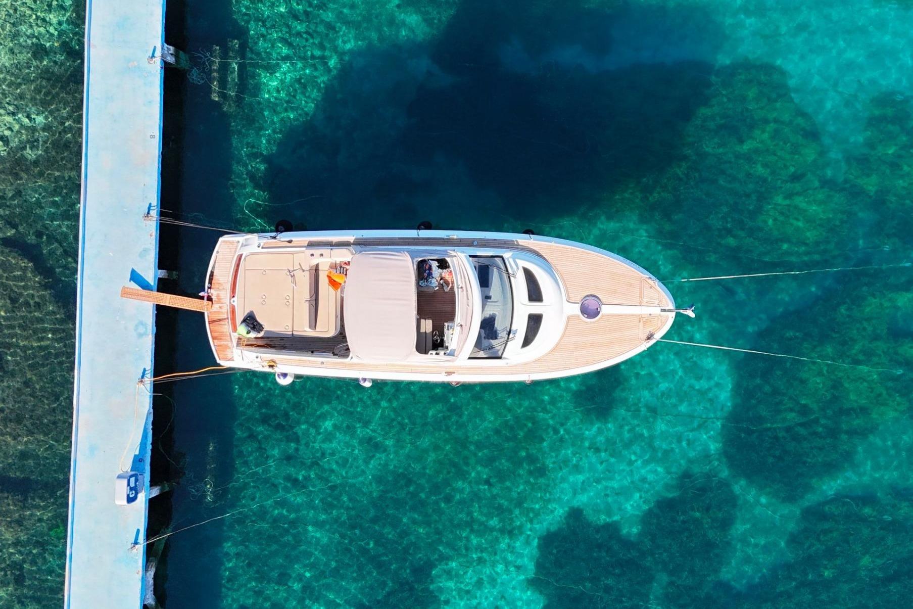 The yacht measures 13.42 metres in length and 3.99 metres in width. These dimensions have been used to best advantage for the practical living space. The huge cockpit with a completely flat floor offers much sitting room, a huge recliner and a fully equipped (outside) galley. The cabrio roof that also makes the yacht suitable for not so nice weather is stored on top of the windscreen.