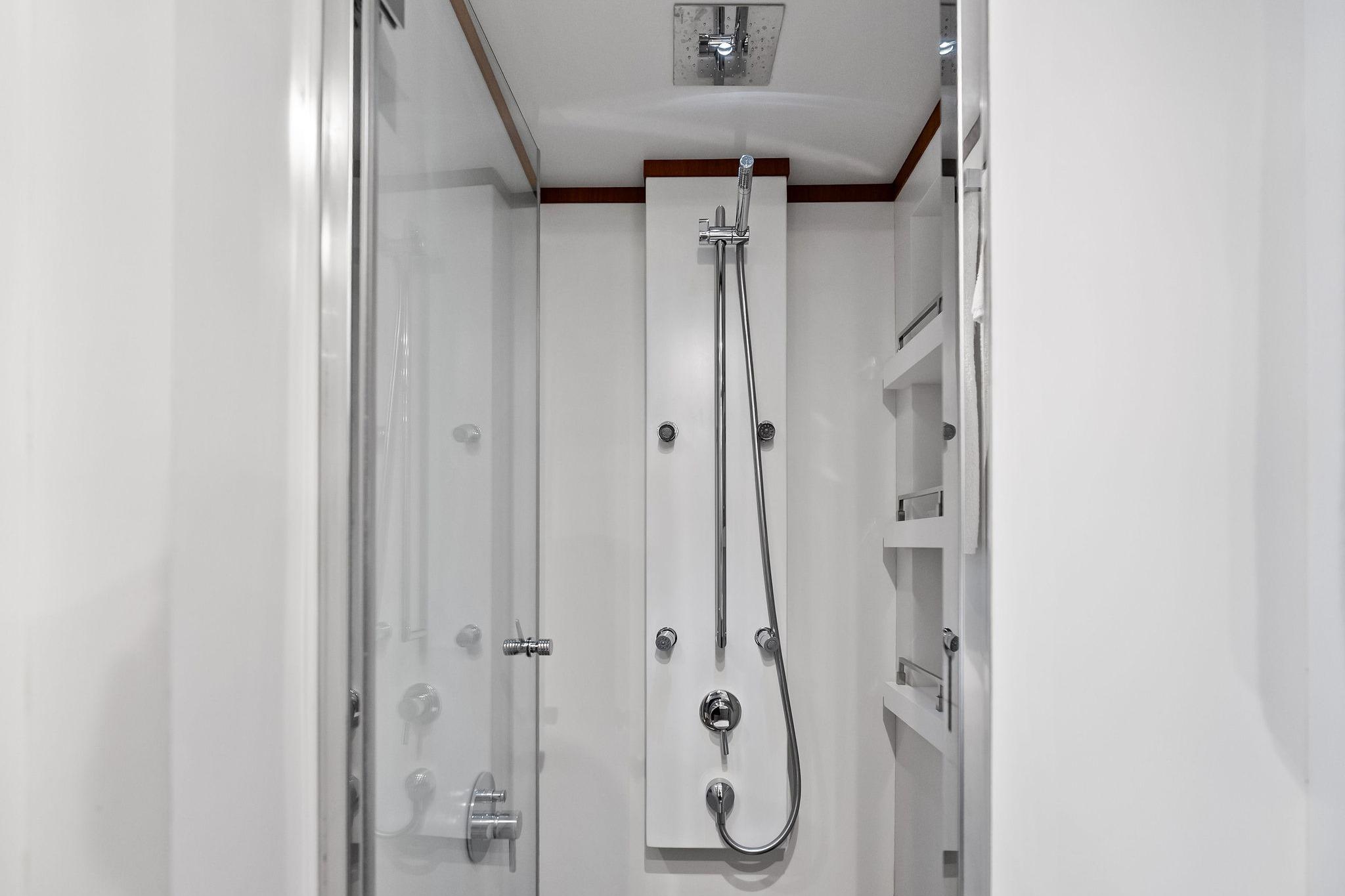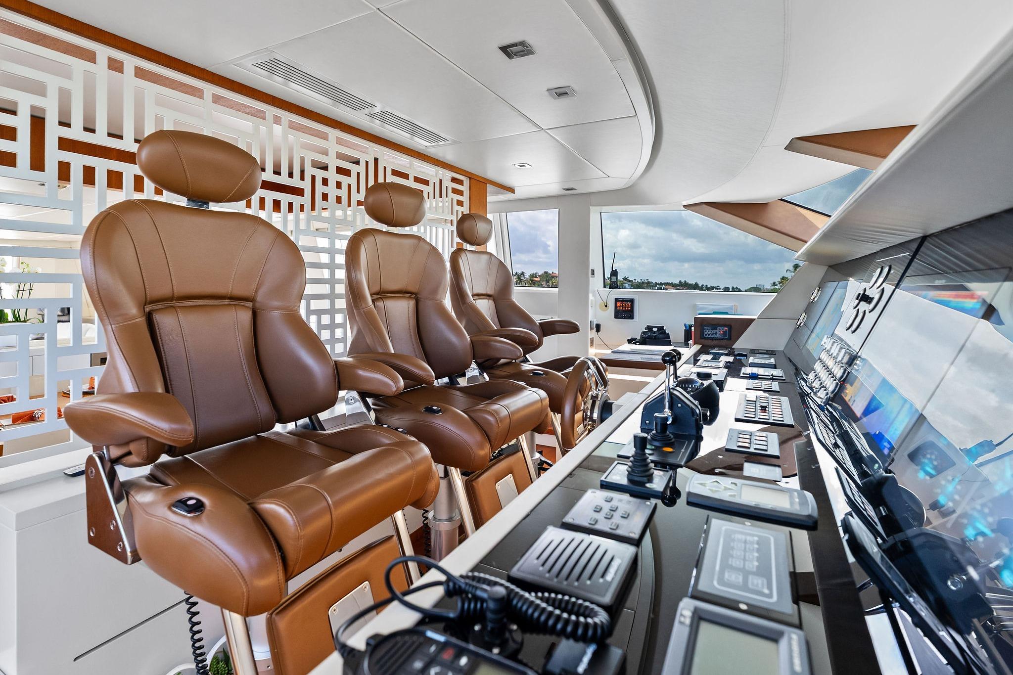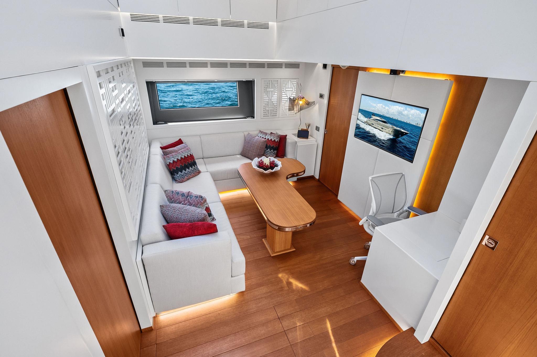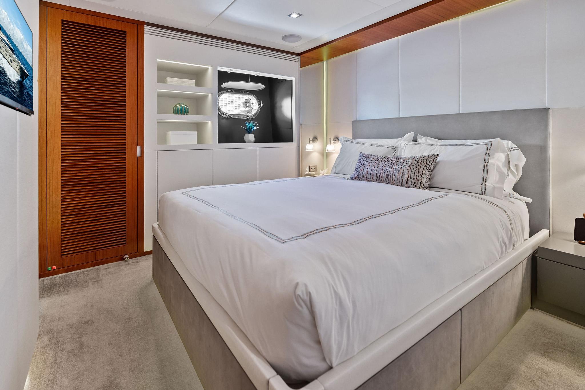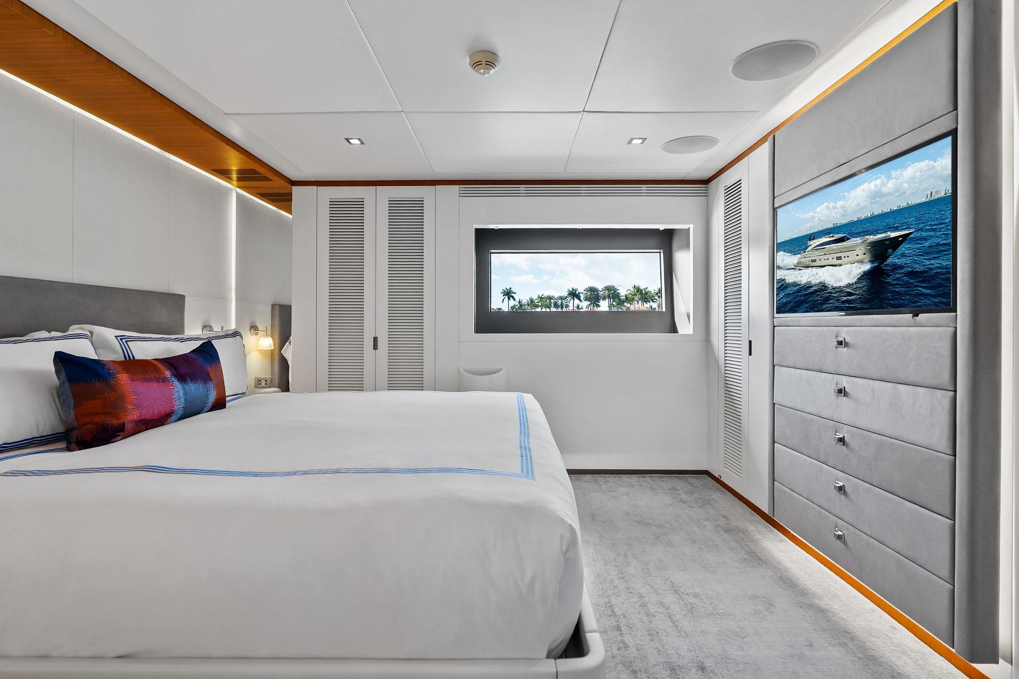 - Drop-down TV with swivel positioning for salon or aft deck viewing