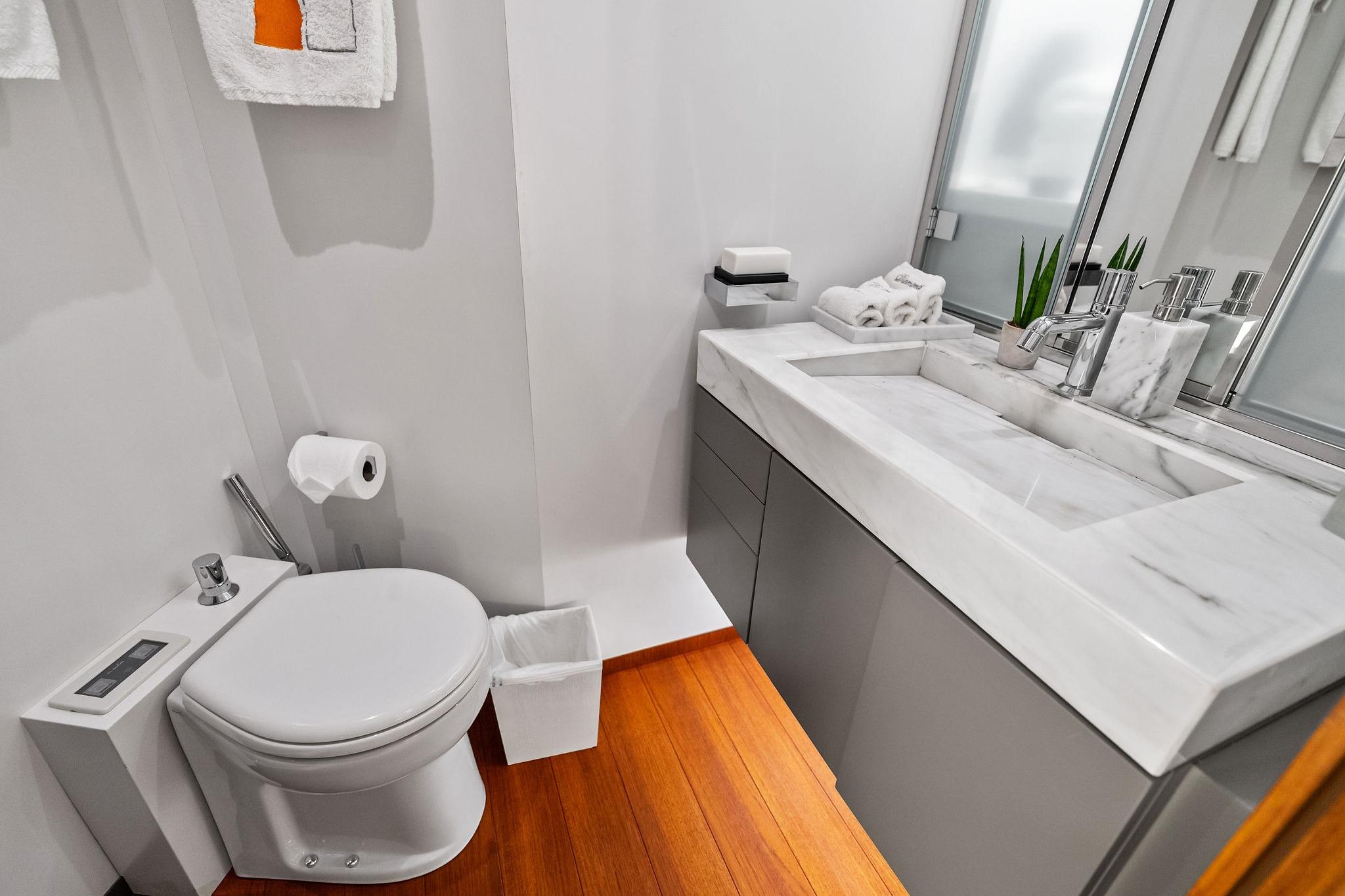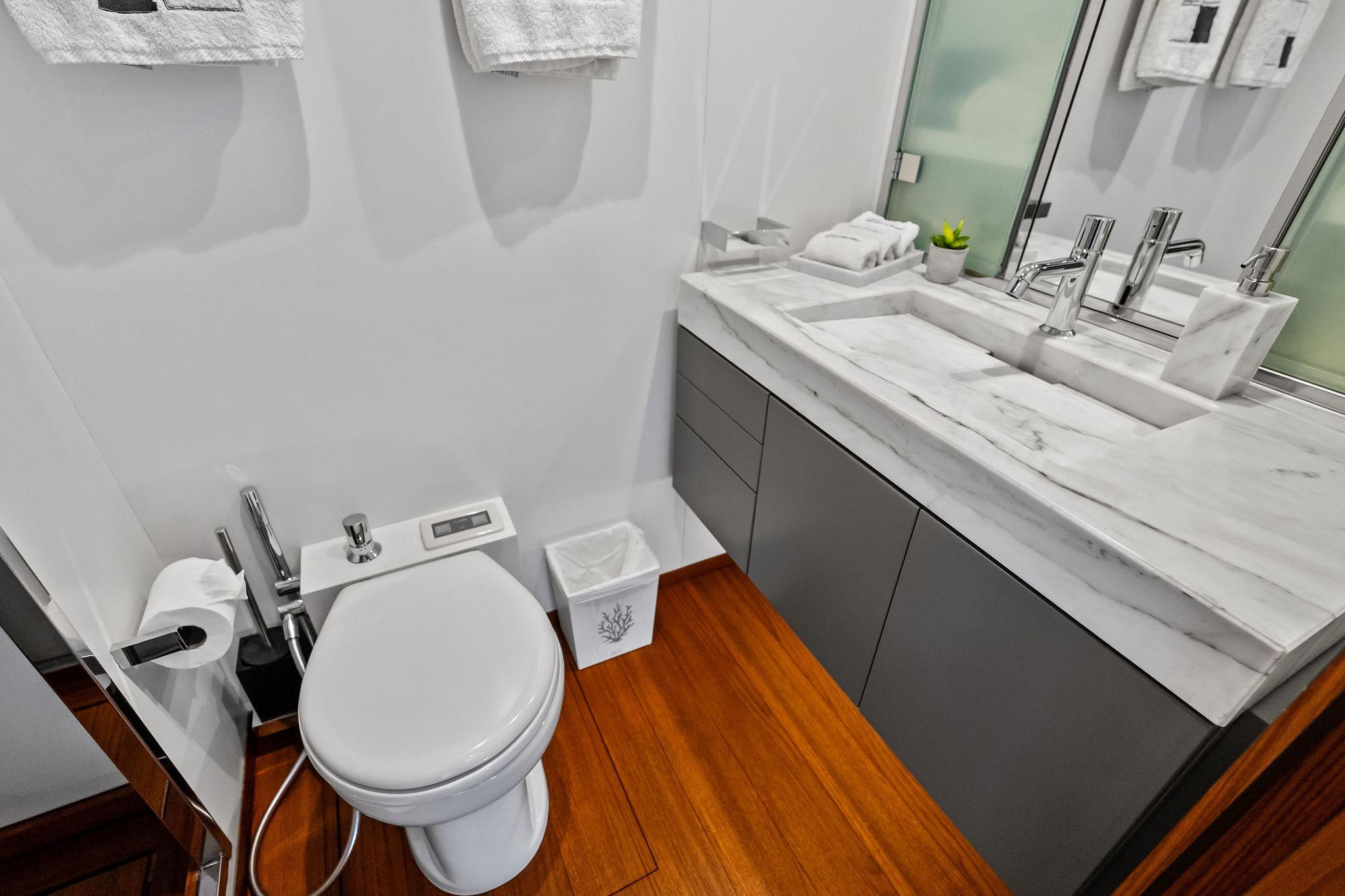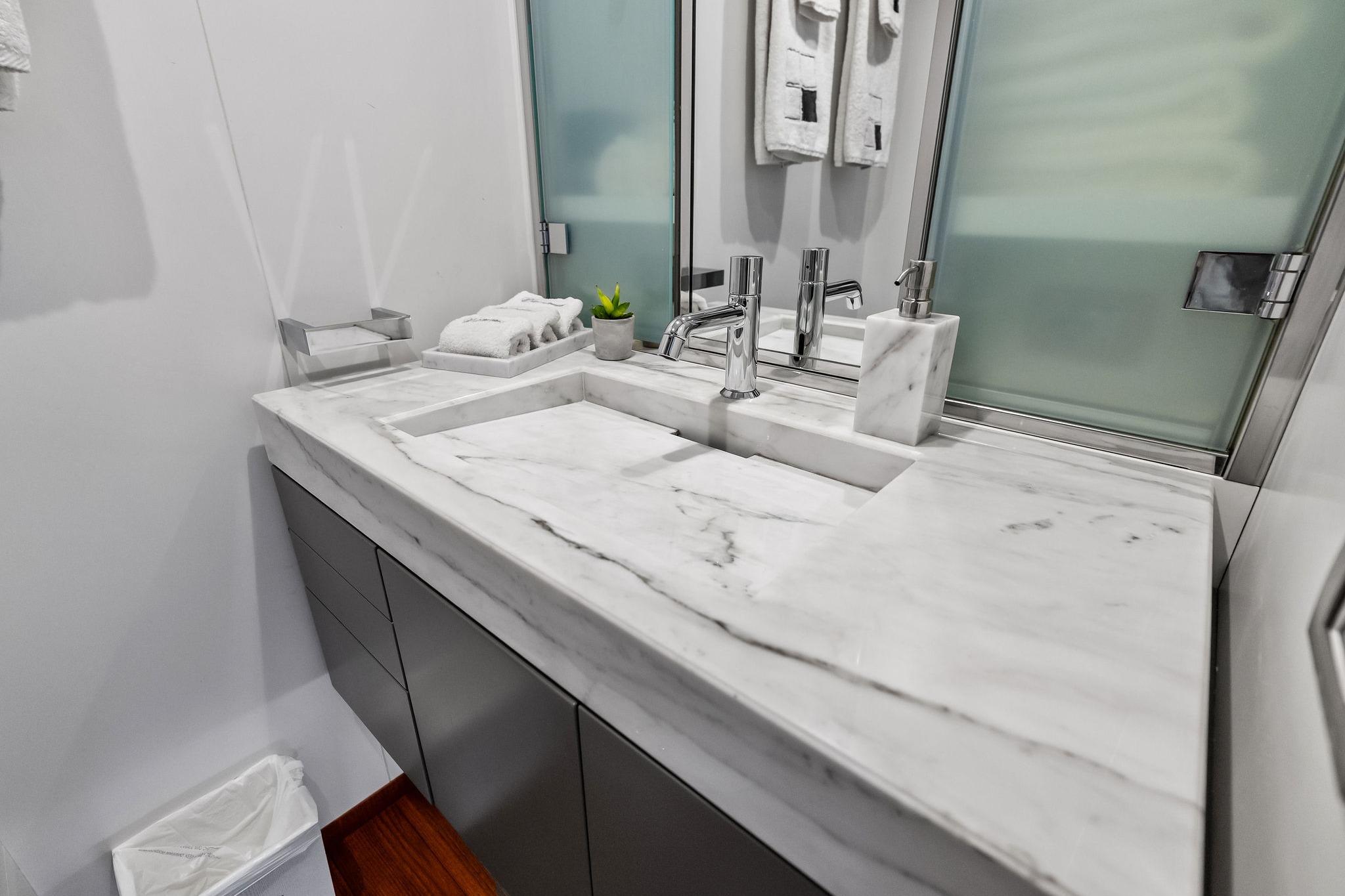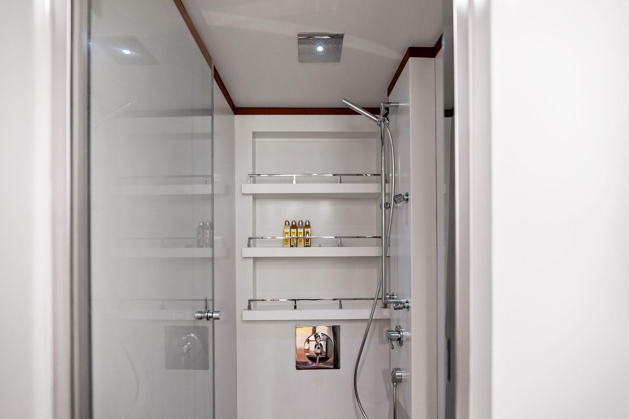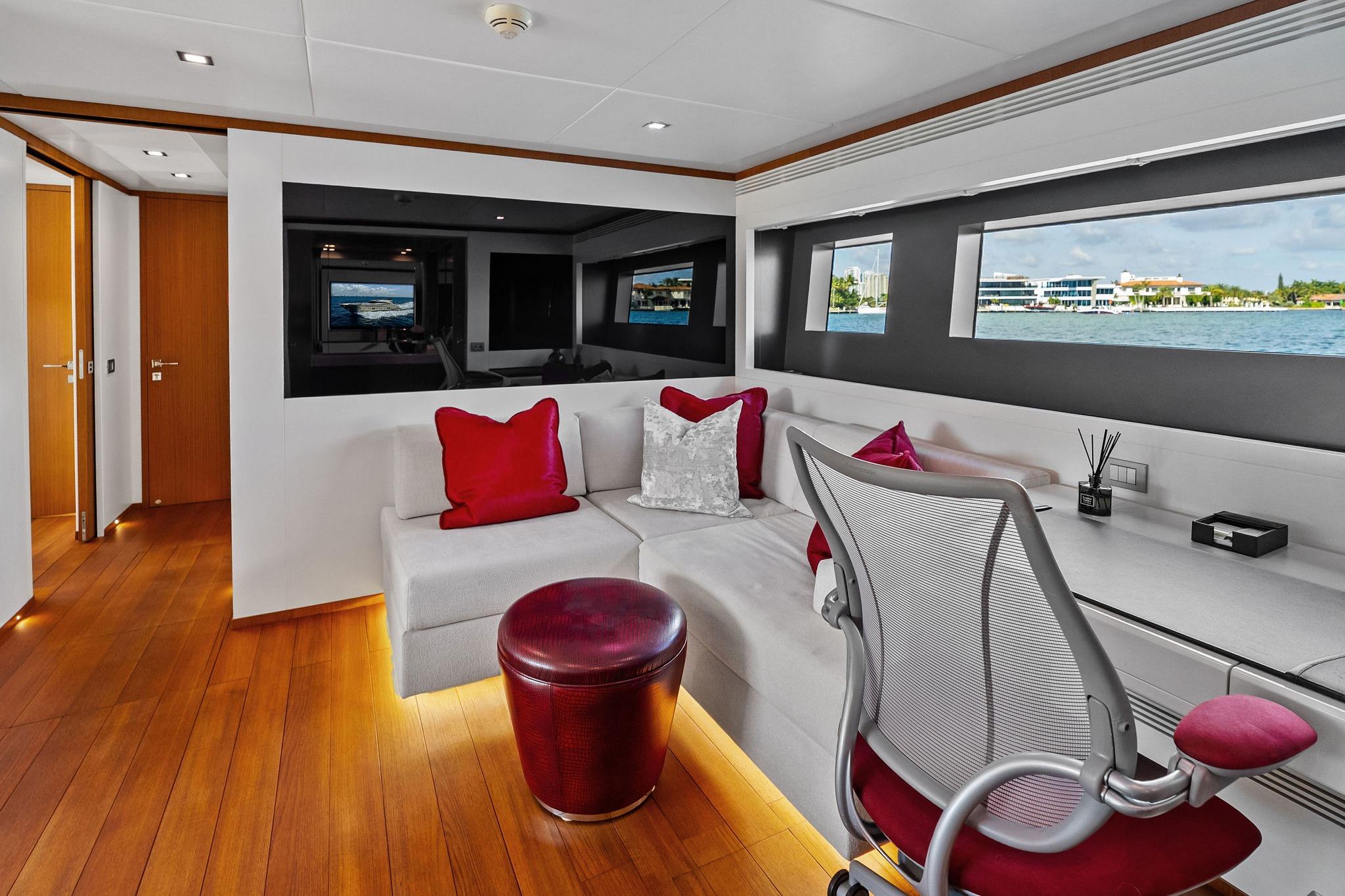- Drop-down TV with swivel positioning for salon or aft deck viewing
