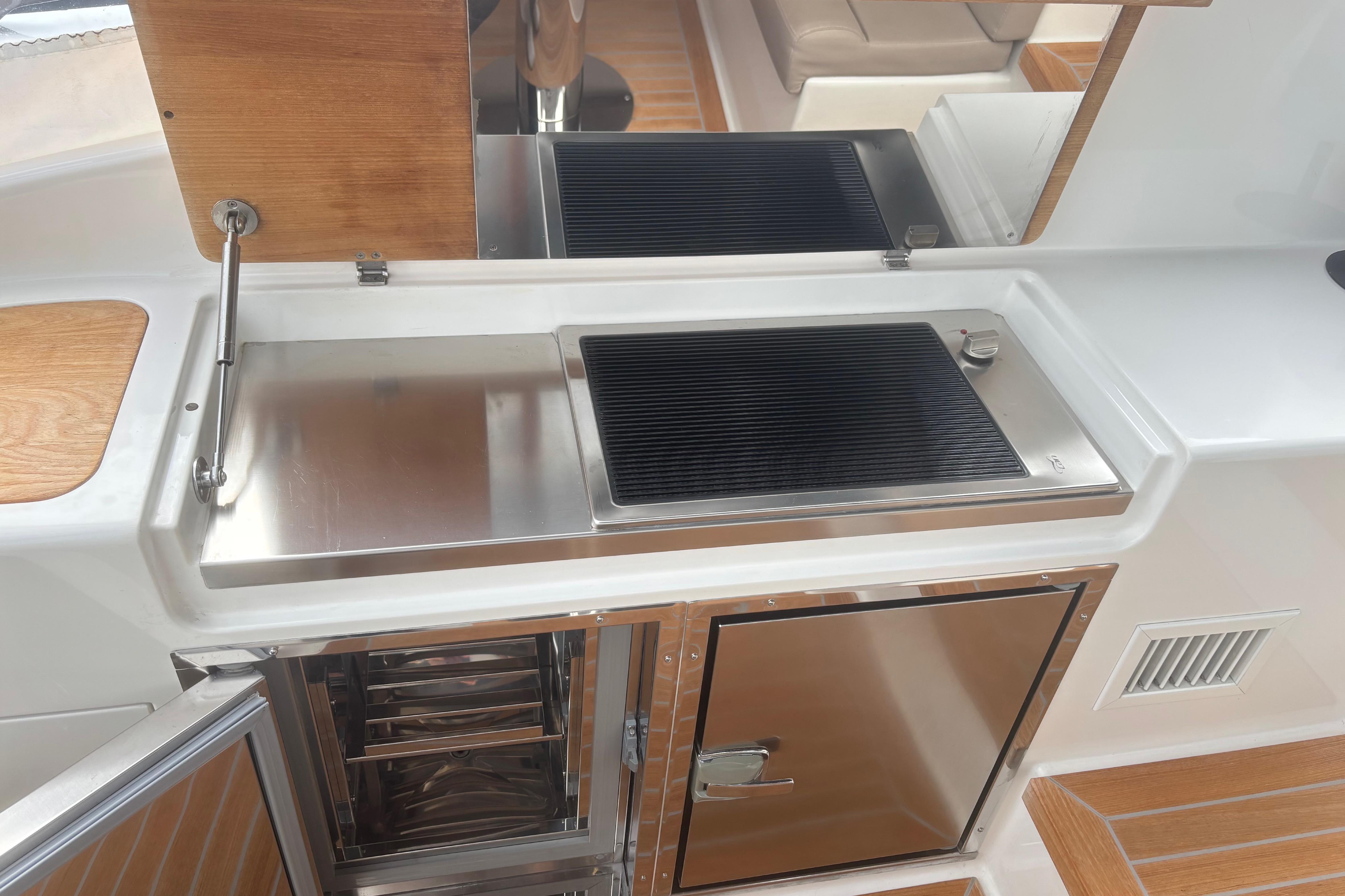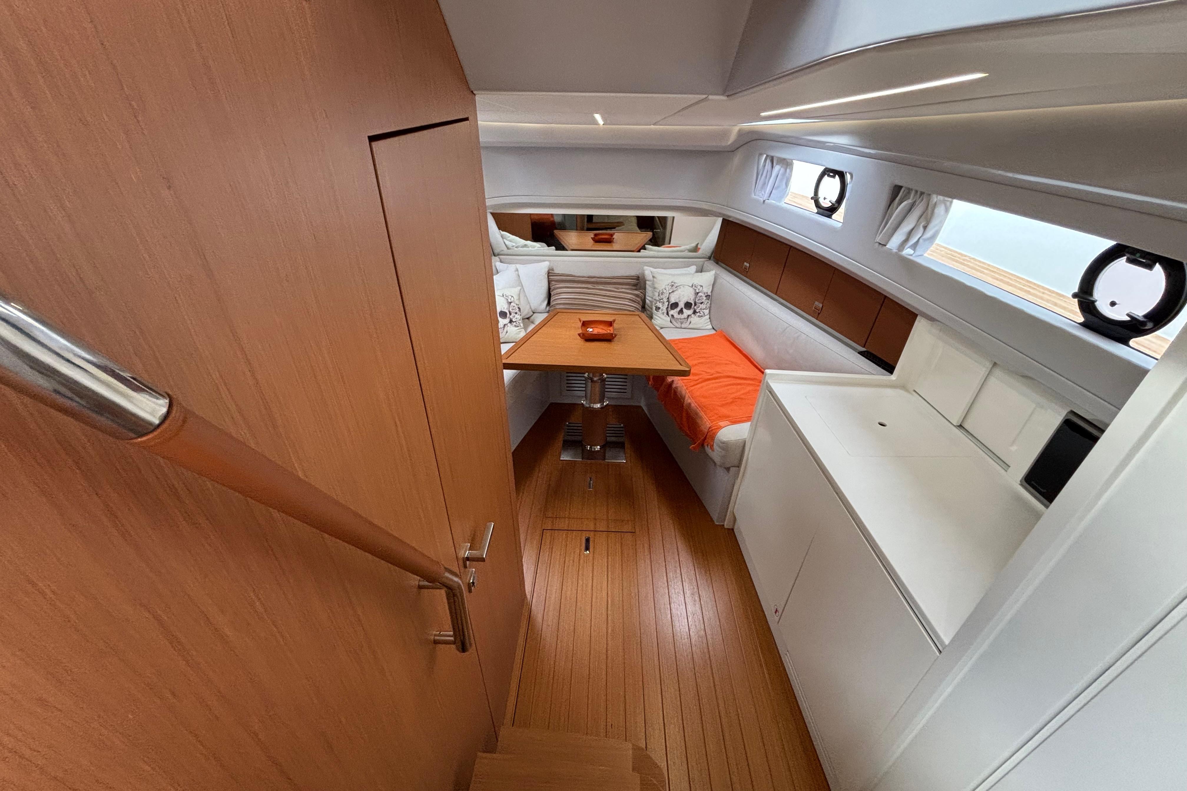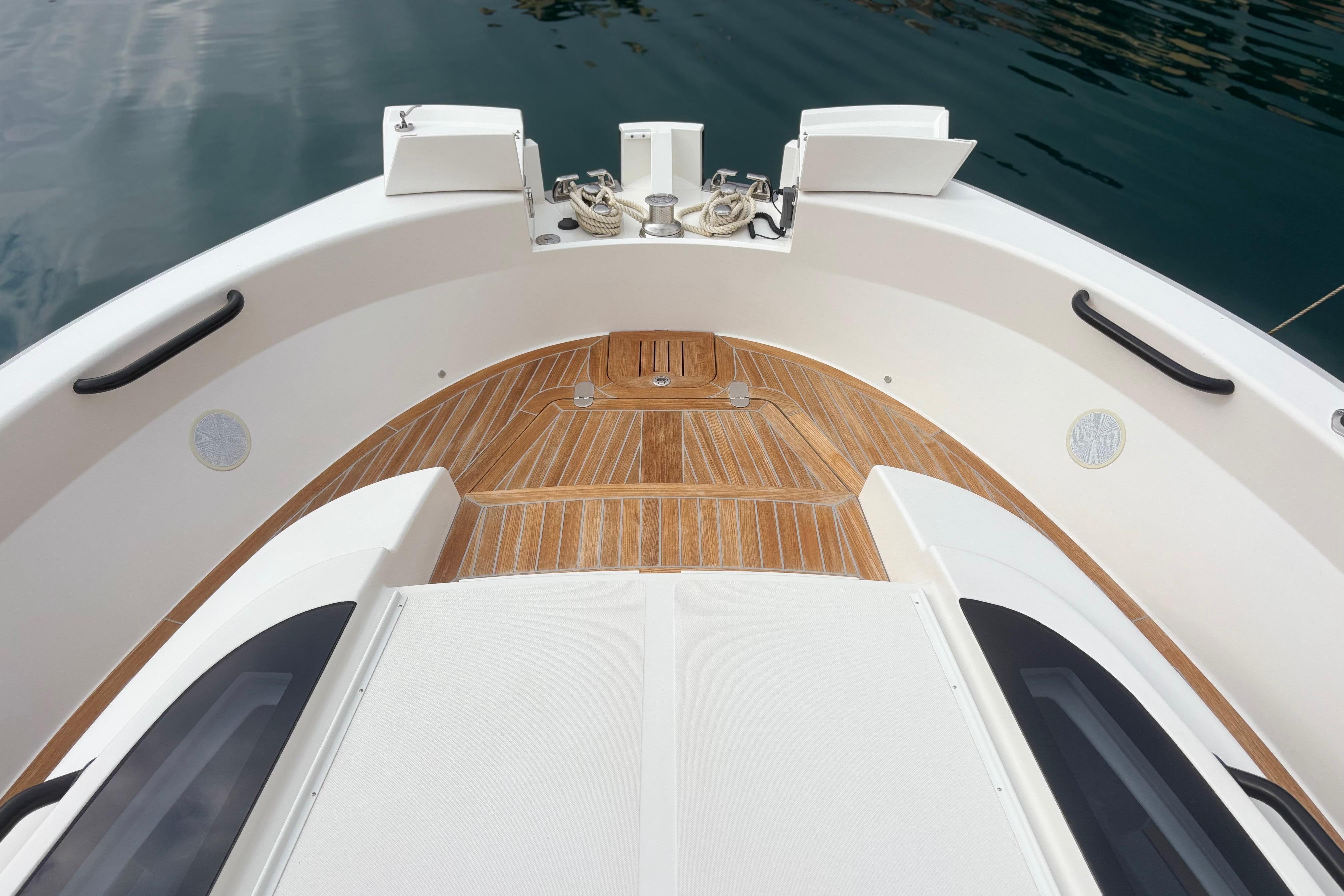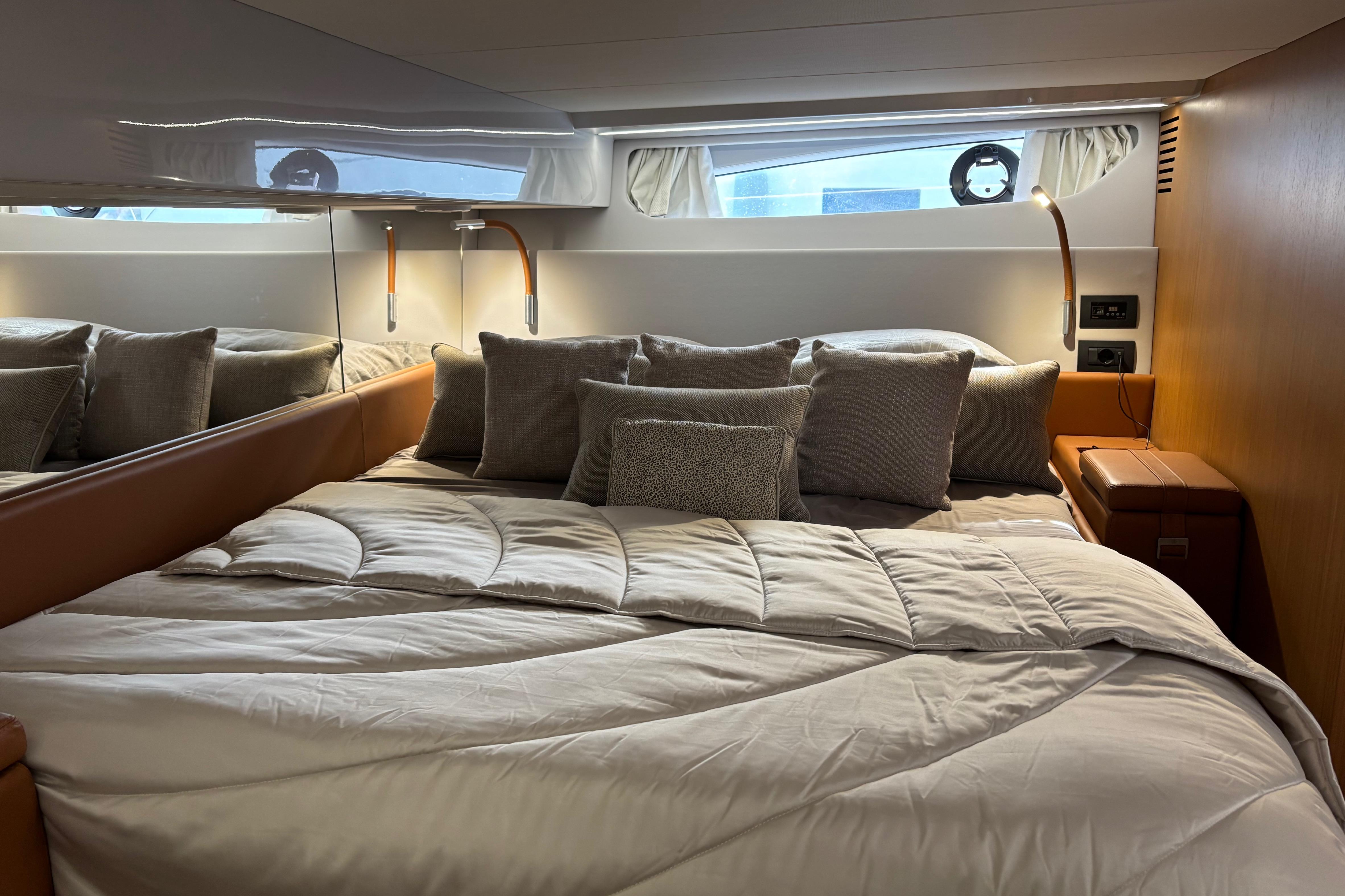 CAP MED a le plaisir de vous proposer ce superbe Bluegame BG42 de 2021, unité premium du chantier italien Bluegame (groupe Sanlorenzo), dessinée par Zuccon International Project. Véritable référence du segment open haut de gamme, le BG42 se distingue par son concept walkaround à circulation 360°, son cockpit protégé et ses volumes extérieurs exceptionnels, offrant un confort remarquable en Méditerranée comme en croisière côtière (CE Catégorie B). Propulsé par 2 x Volvo Penta D6 IPS 650 développant 480 CV chacun et totalisant seulement 130 heures, ce modèle combine puissance, rendement et stabilité. La transmission IPS associée au joystick Volvo assure des manœuvres d’une précision remarquable, complétée par un propulseur d’étrave Side Power 75 pour une maîtrise totale au port. Le système Interceptor optimise automatiquement l’assiette et améliore le confort dynamique en navigation, tandis que les moteurs bénéficient d’un suivi rigoureux avec révision tous les deux ans et mise à jour récente. L’autonomie énergétique constitue un véritable atout avec un groupe électrogène 7 kW permettant une alimentation 220V indépendante au mouillage comme en navigation, faisant fonctionner Climatisation BTU 16000, froid et équipements sans dépendre du quai. L’installation est renforcée par 2 panneaux solaires de 220W (2024), un régulateur Victron SmartSolar Bluetooth, un shunt Victron Bluetooth et un chargeur Victron Skylla 24V 80A trois sorties (2025) garantissant une gestion et une recharge optimales du parc batteries. Un dessalinisateur Idromar 130L/h (2025) assure une autonomie totale en eau douce pour les longues escales. Le nouveau boîtier Dometic (2025) gère automatiquement l’alimentation des trois réfrigérateurs en 220V ou 24V selon la source disponible, complété par un congélateur extérieur inox Frigonautica (2024). Le pont est entièrement optimisé pour la vie en extérieur avec passerelle hydraulique et plateforme arrière immergeable commandées par tableaux inox Opacmare (2025), fermeture complète du cockpit par bâches Crystal transparentes (2024) et toiles d’ombrage latérales, Bimini avec toiles d’ombrage montées sur pôles carbone couvrant les zones avant et arrière, chauffage extérieur Webasto 5 kW pour un confort toutes saisons, télécommande sans fil Lewmar pour compteur de chaîne facilitant les manœuvres de mouillage, ainsi que winchs électriques à l’avant et à l’arrière pour des opérations d’amarrage précises et sans effort. L’intérieur, repensé par Studio Souchon — cabinet de design collaborant également avec Sanlorenzo — offre une atmosphère raffinée avec finitions soignées, table de carré amovible électrique, éclairage adaptatif, cabine optimisée pour réduire la sensation de roulis grâce à son orientation, et détails en alcantara apportant une touche yacht de luxe. Unité parfaitement entretenue, prête à naviguer, configurée pour la grande croisière avec autonomie renforcée et niveau d’équipement rarement proposé sur le marché.