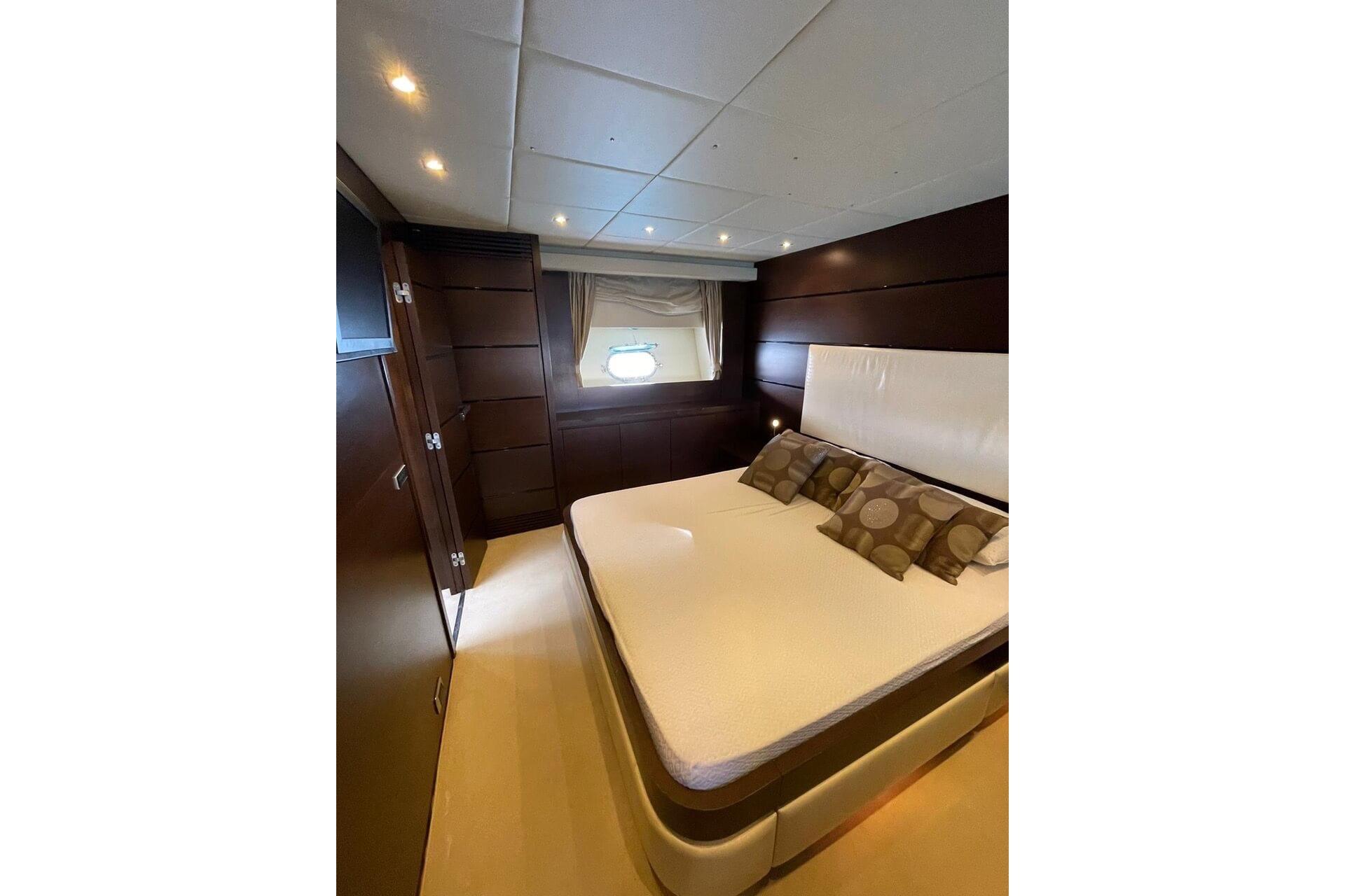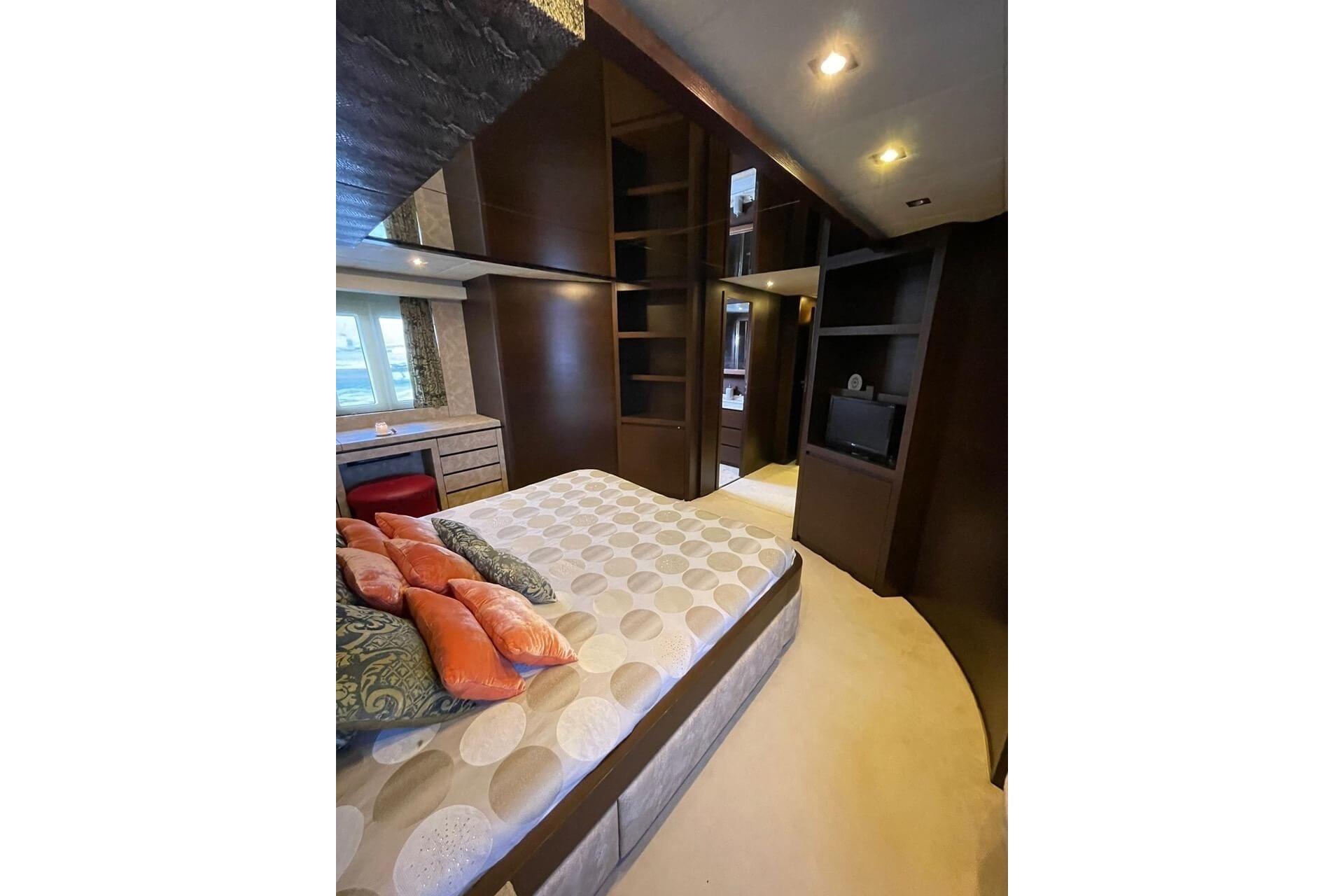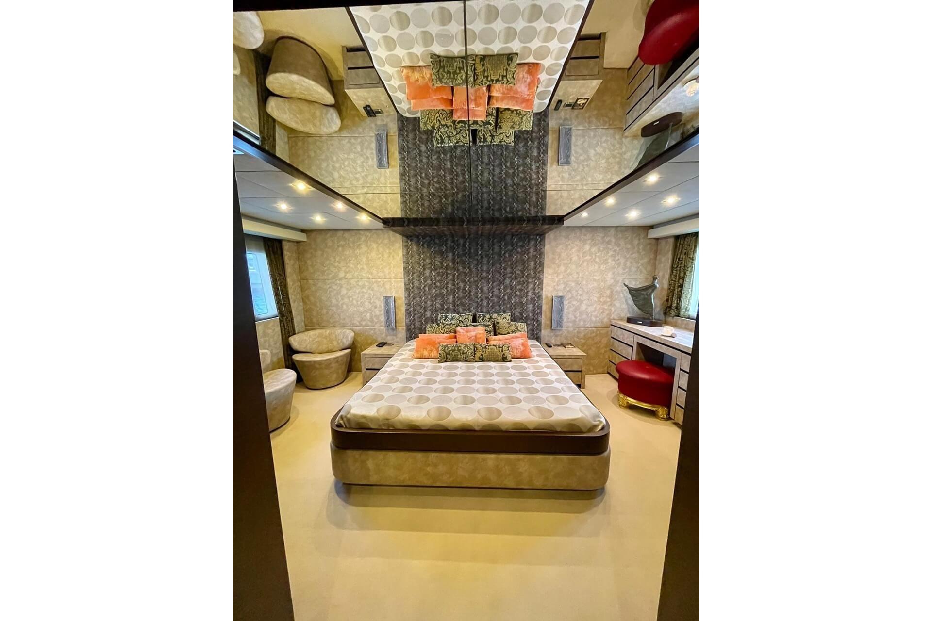 Spacious full-beam Master cabin with vanity, 20” LCD TV, stereo, refrigerator, and en suite bathroom