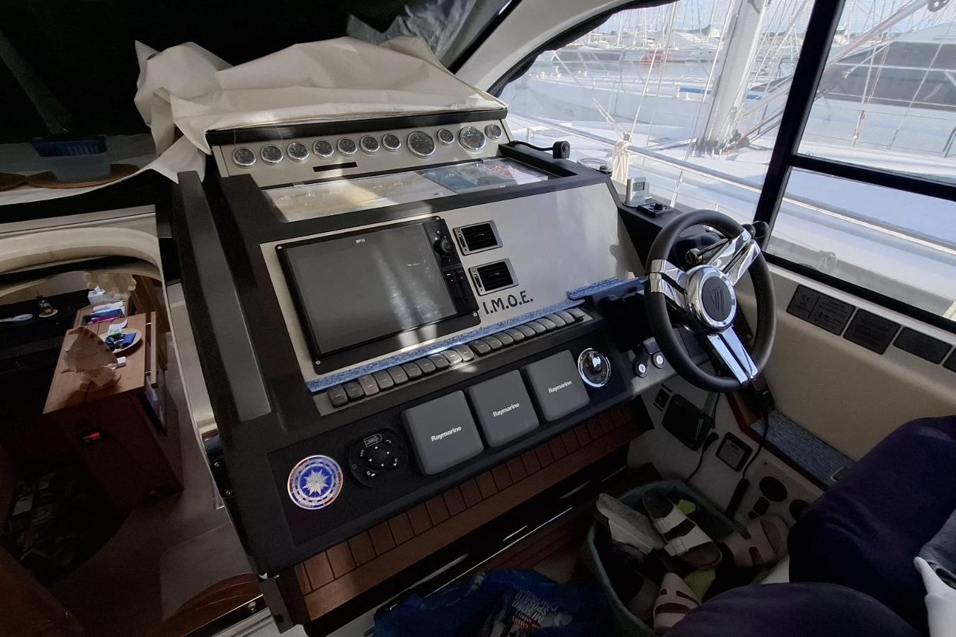 Gli interni offrono tre cabine ben distribuite, con cabina armatoriale a prua, cabina ospiti e ulteriore cabina doppia, oltre a dinette trasformabile. La disposizione è studiata per garantire privacy e vivibilità, con due bagni completi di doccia. La cucina interna è affiancata da un’area di servizio nel pozzetto, ed è dotata di frigorifero interno ed esterno, congelatore, piastra in vetroceramica, microonde e lavatrice. L’aria condizionata assicura comfort anche nei mesi più caldi.