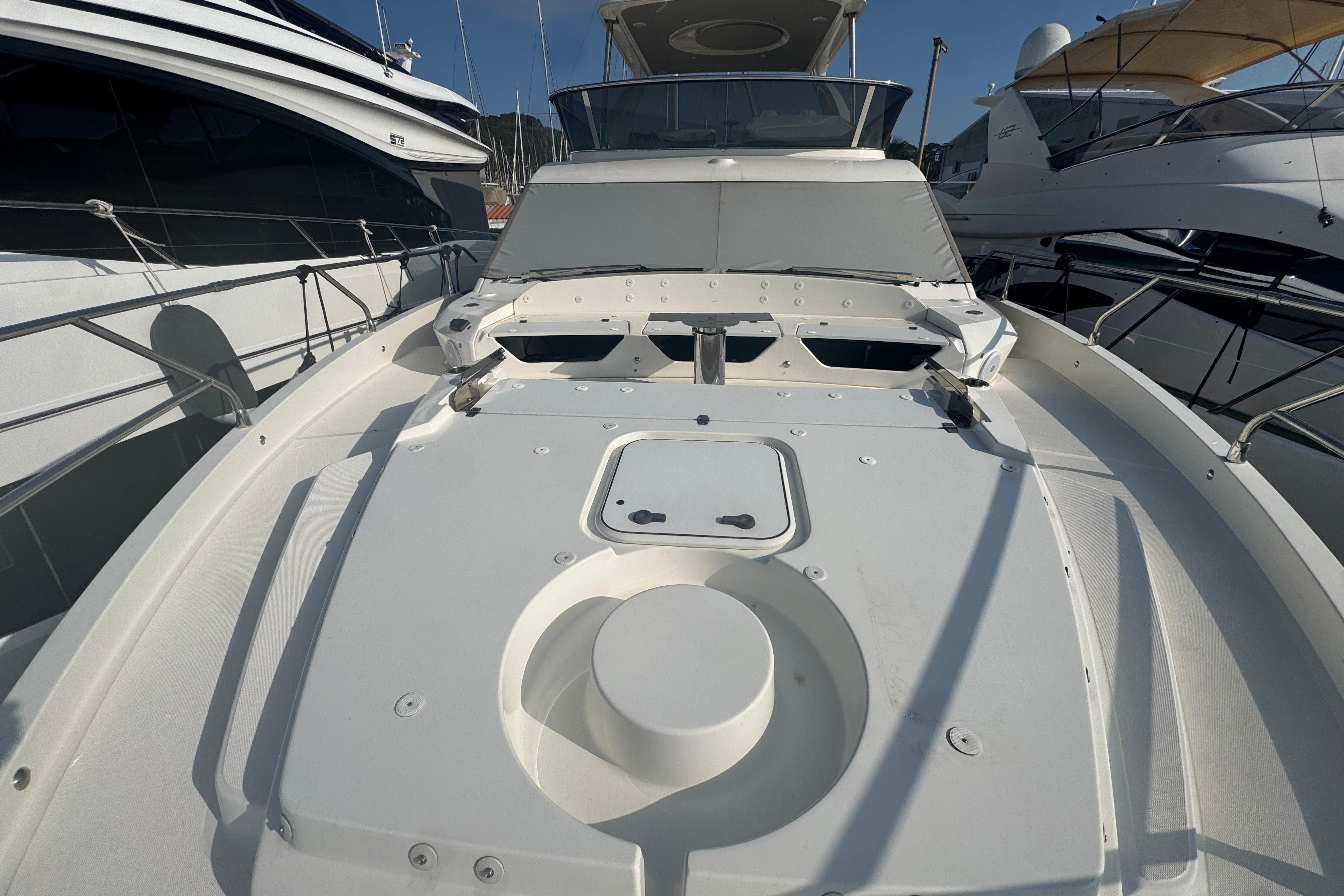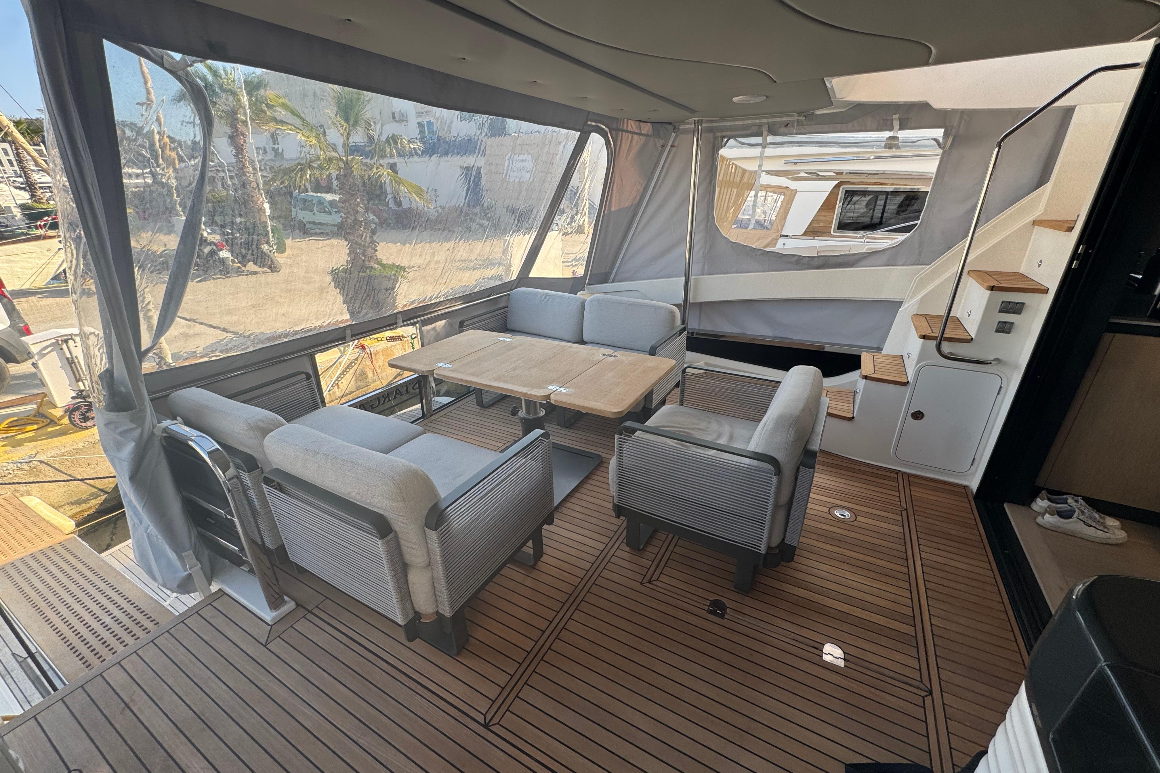 Le flybridge exceptionnel du 52 FLY offre une plateforme luxueuse pour admirer la mer depuis un point de vue privilégié. Le poste de pilotage , équipé de sièges ergonomiques et de grands écrans multifonctions permettant de contrôler du bout des doigts tous les systèmes de bord, est agrémenté de banquettes pour que le propriétaire-capitaine puisse profiter de la compagnie de ses invités, même aux commandes. Avec sa table à manger , sa cuisine et son bar , le flybridge est un lieu de vie privilégié à bord, où l'on peut savourer des moments de détente absolue sur sa terrasse arrière aménagée.