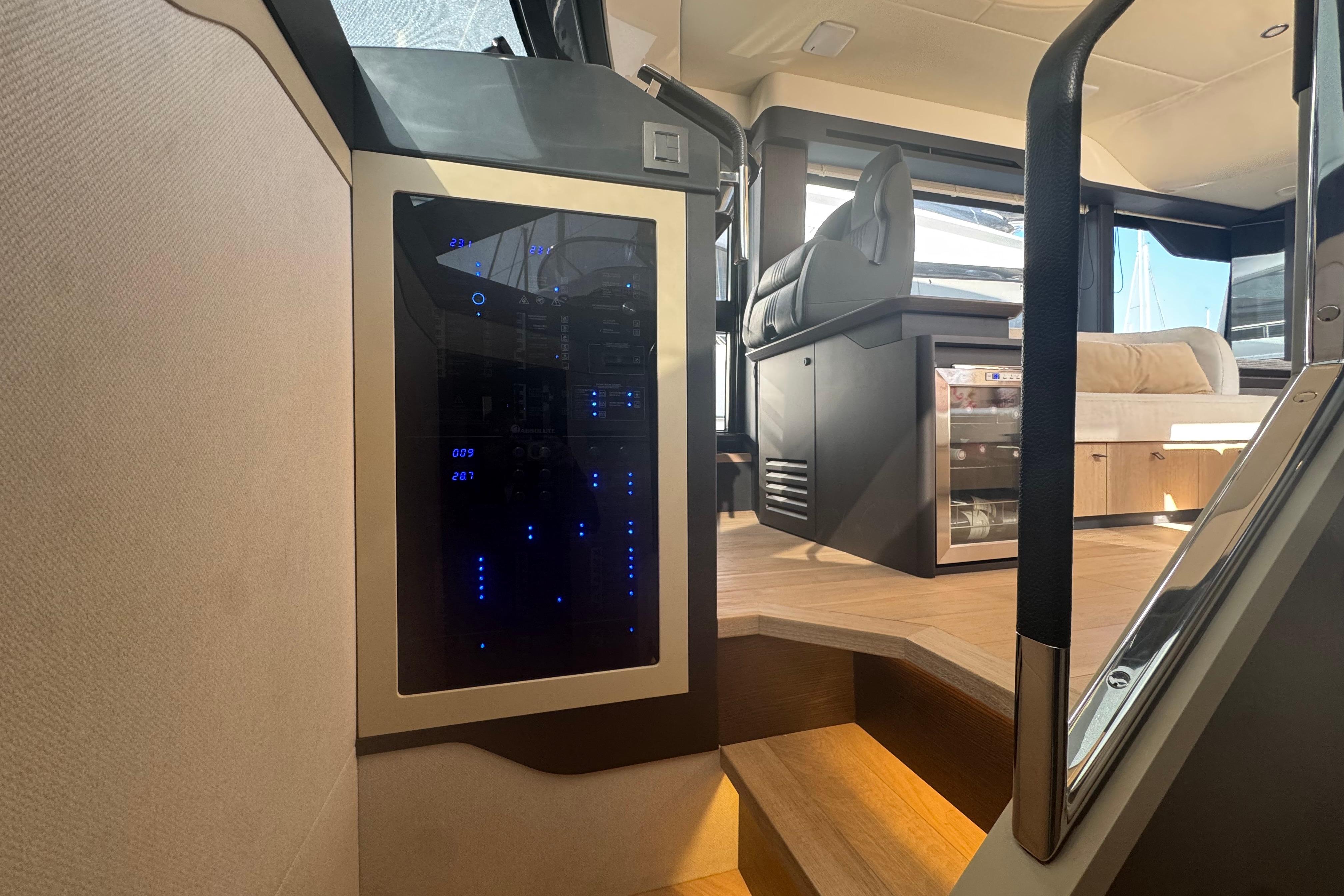 Le poste de pilotage principal , en contact direct avec le carré, bénéficie d'une visibilité optimale et est équipé d'un système d'infodivertissement de pointe et d'un affichage complet des informations relatives à tous les systèmes de bord. Une porte judicieusement placée permet un accès rapide du poste de pilotage principal à la passerelle latérale, facilitant ainsi les manœuvres portuaires.