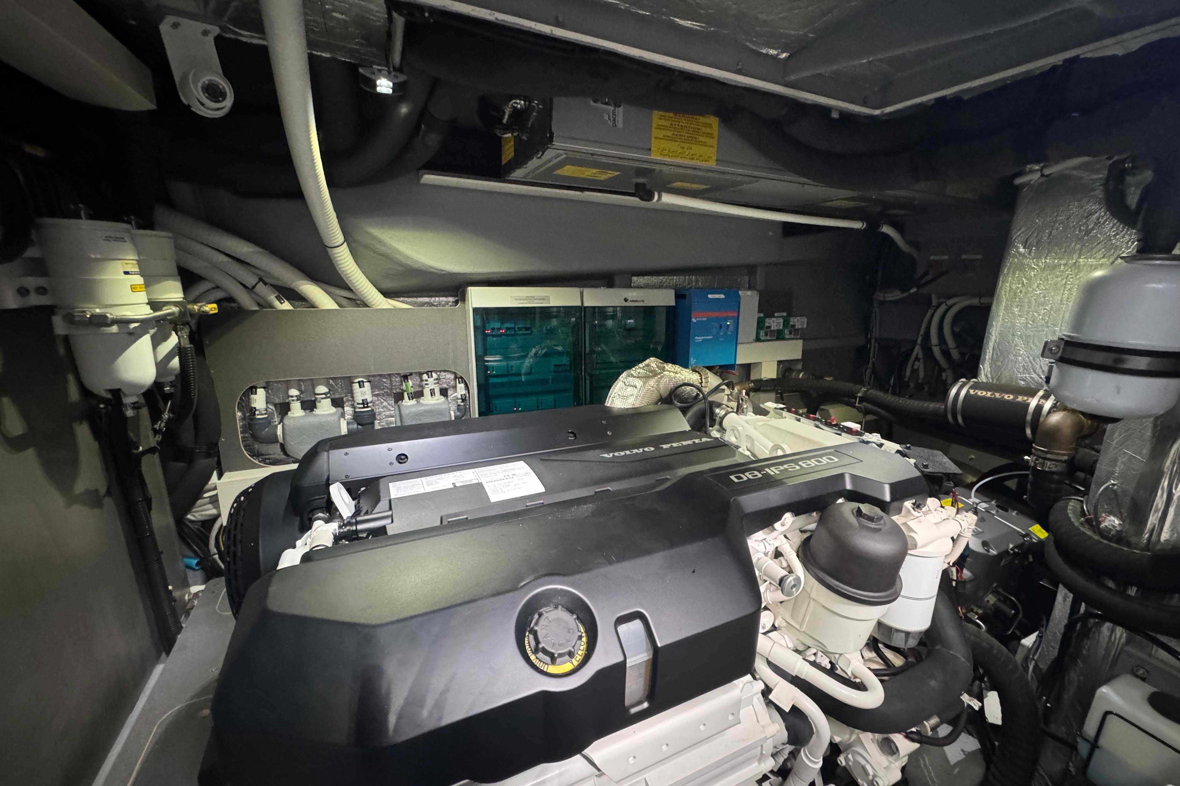 L'utilisation de larges baies vitrées , une marque de fabrique d'Absolute, est particulièrement visible dans le carré , d'où l'on bénéficie d'une vue panoramique à 360°. Outre la climatisation, une ventilation naturelle est assurée par les fenêtres coulissantes verticales à commande électrique. La cuisine est entièrement équipée et, fait rare pour un bateau de cette taille, on trouve également un garde-manger spacieux .