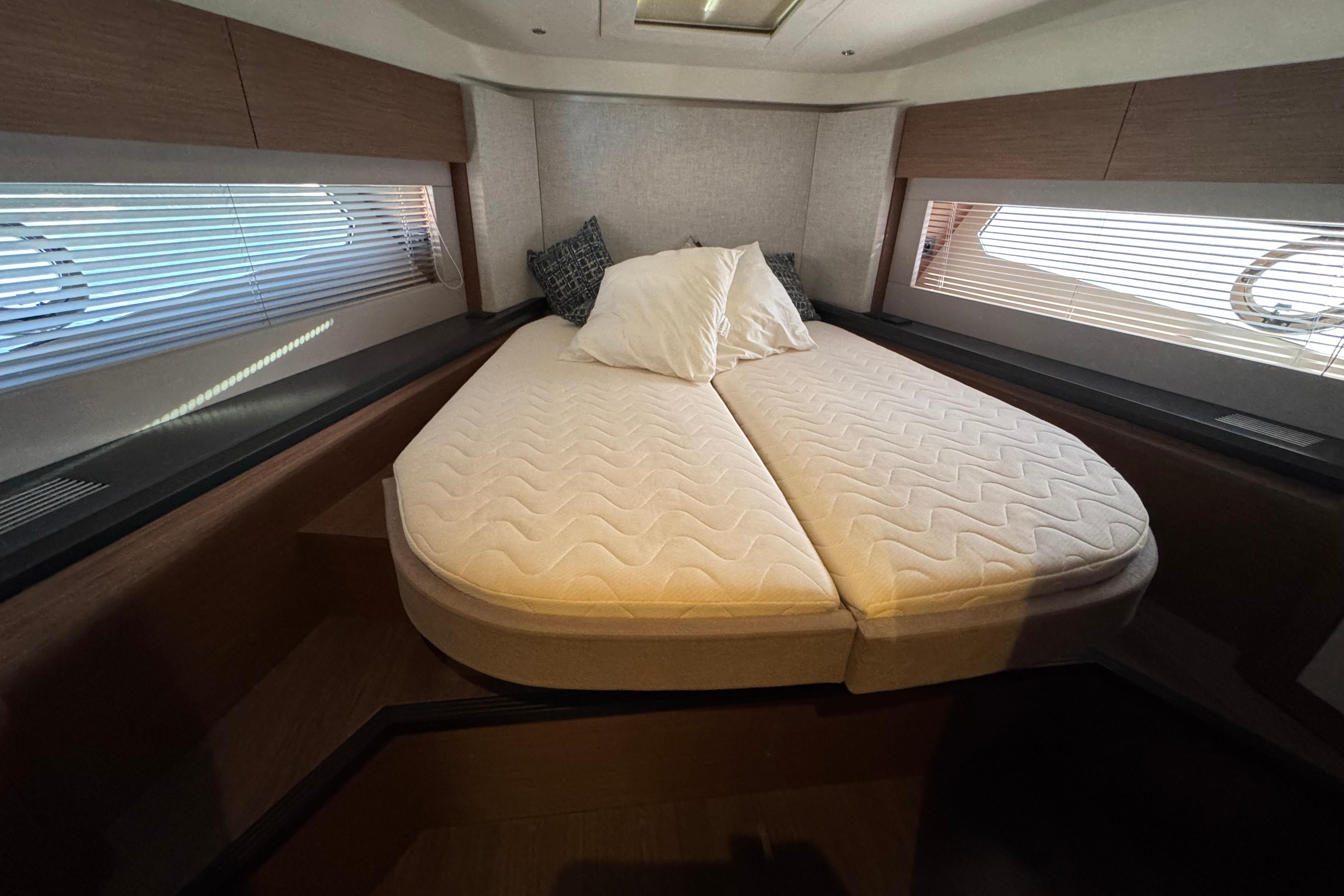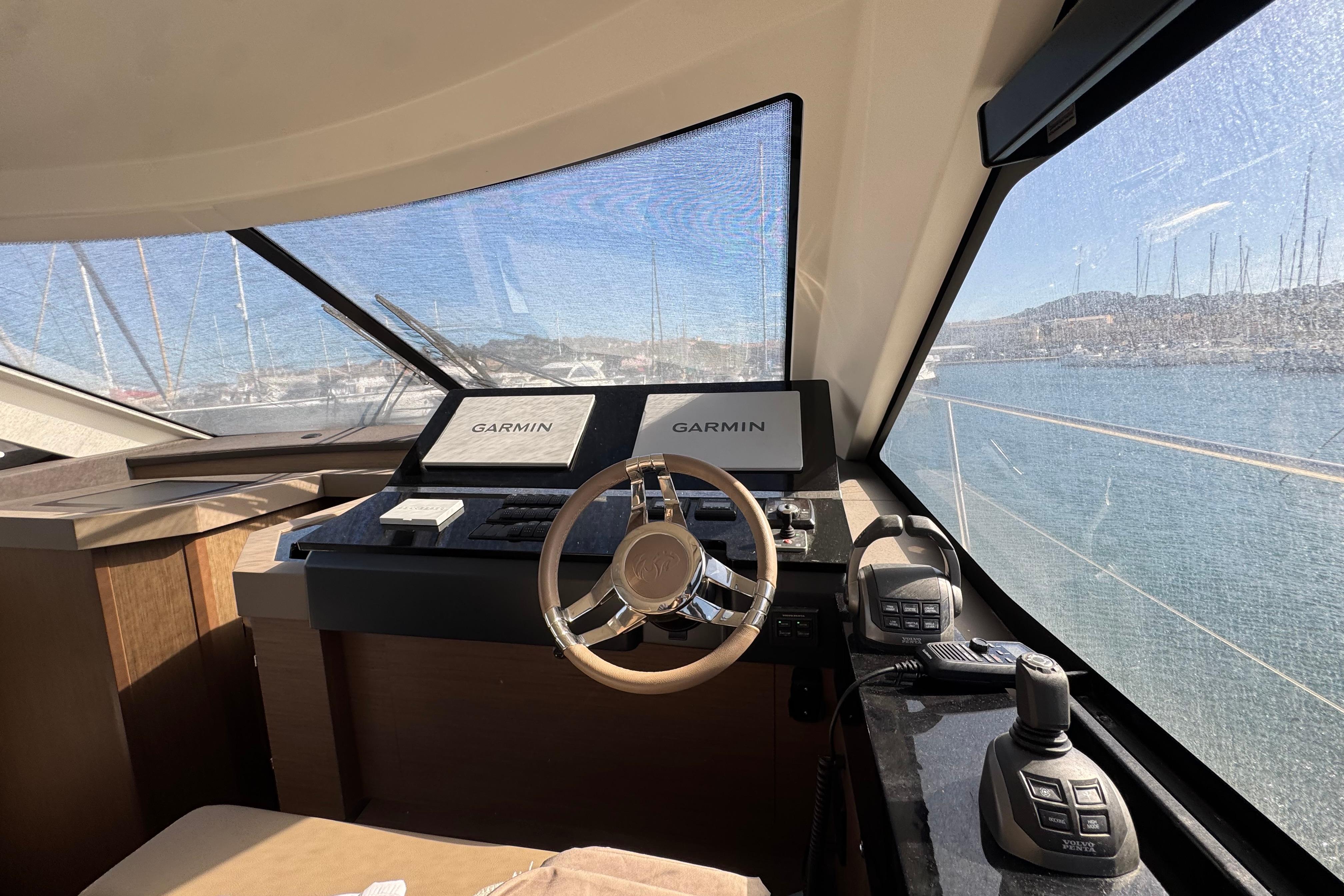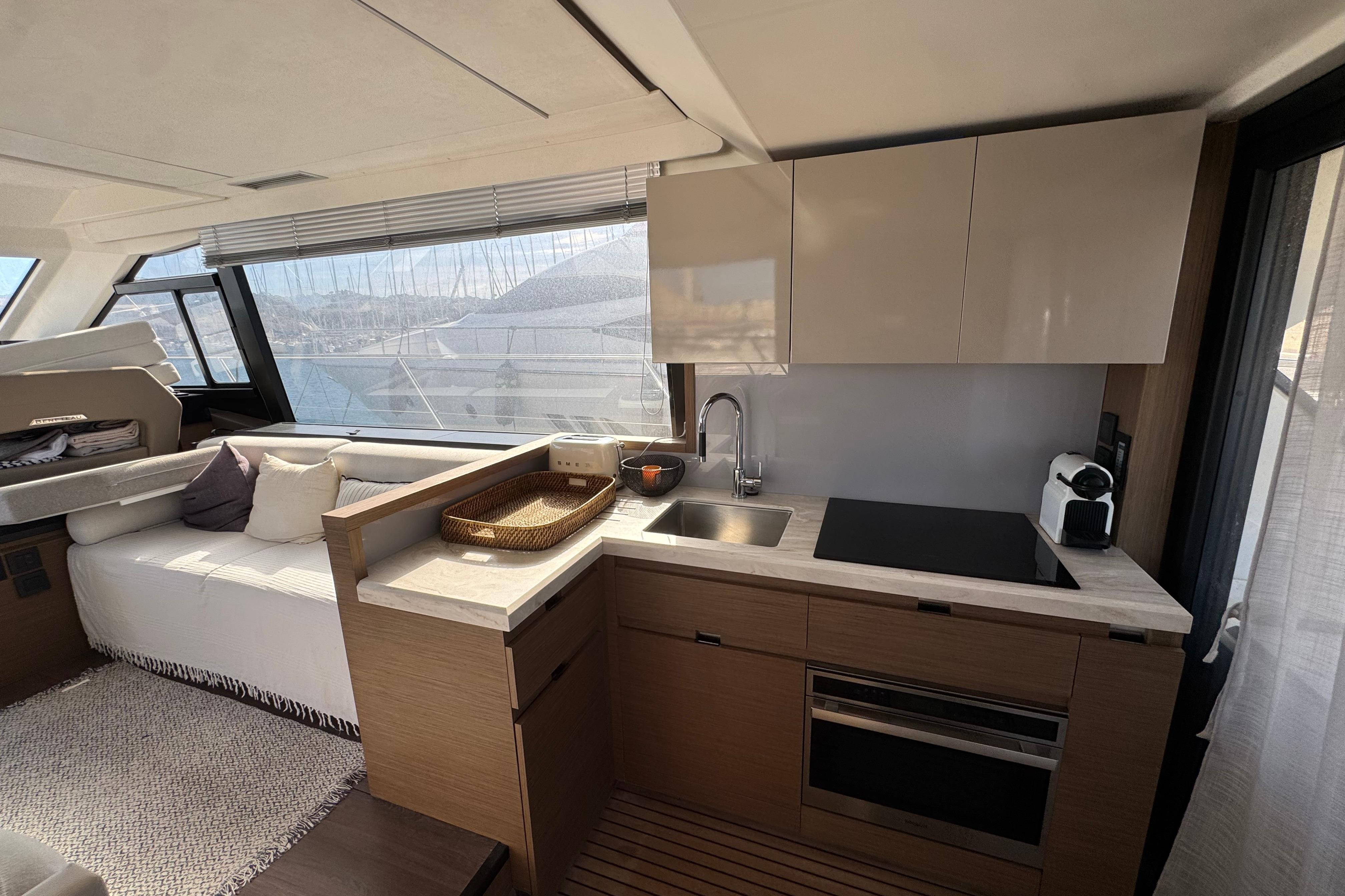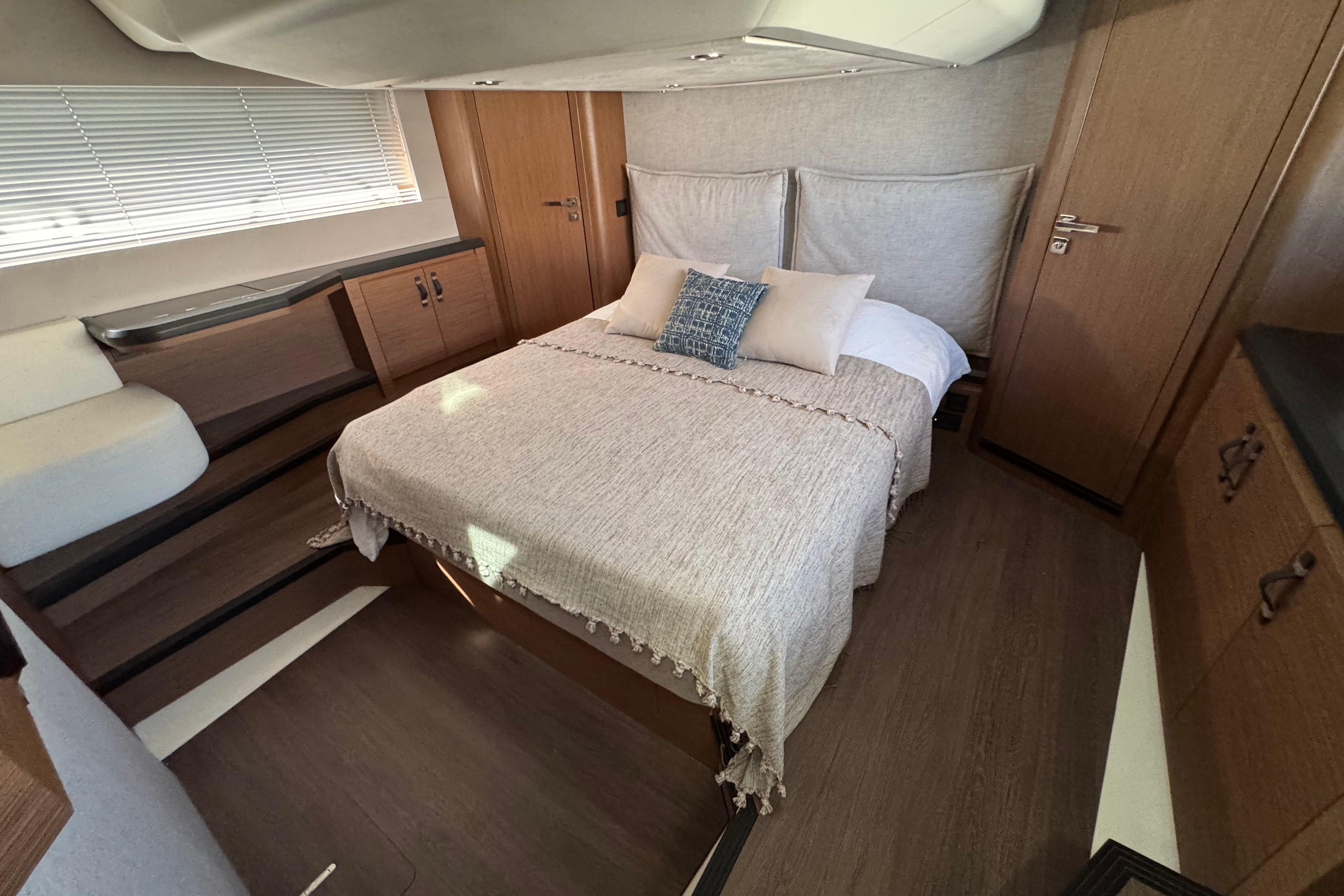La nouvelle carène en V évolutif offre davantage de volume intérieur. Le très grand carré comme les somptueux espaces nouvellement configurés du fly, l’immense suite propriétaire, les trois cabines et les deux salles d’eau s’harmonisent dans un univers volontairement plus sobre, boiseries et vaigrages clairs, au diapason des tendances contemporaines les plus actuelles.