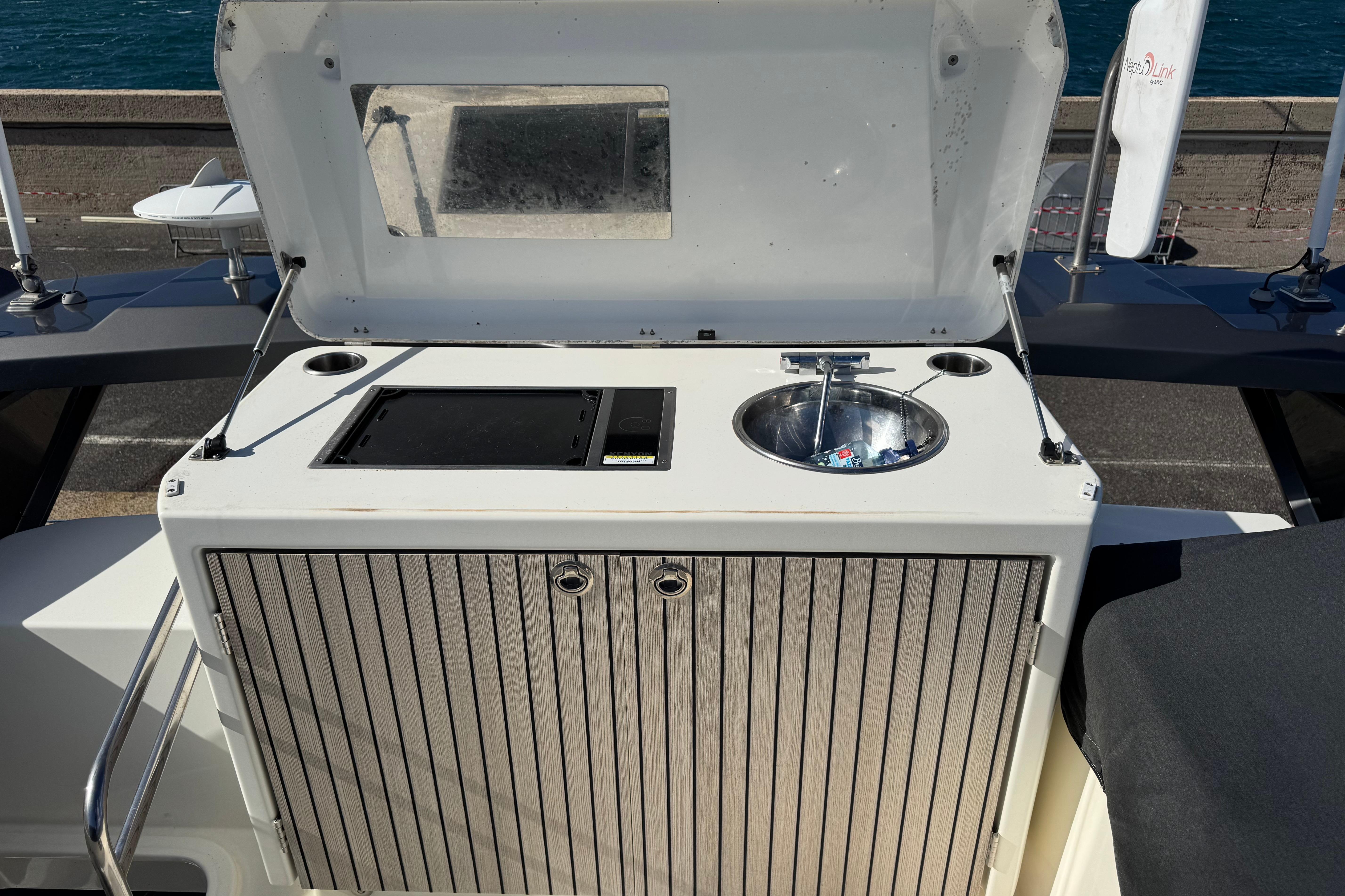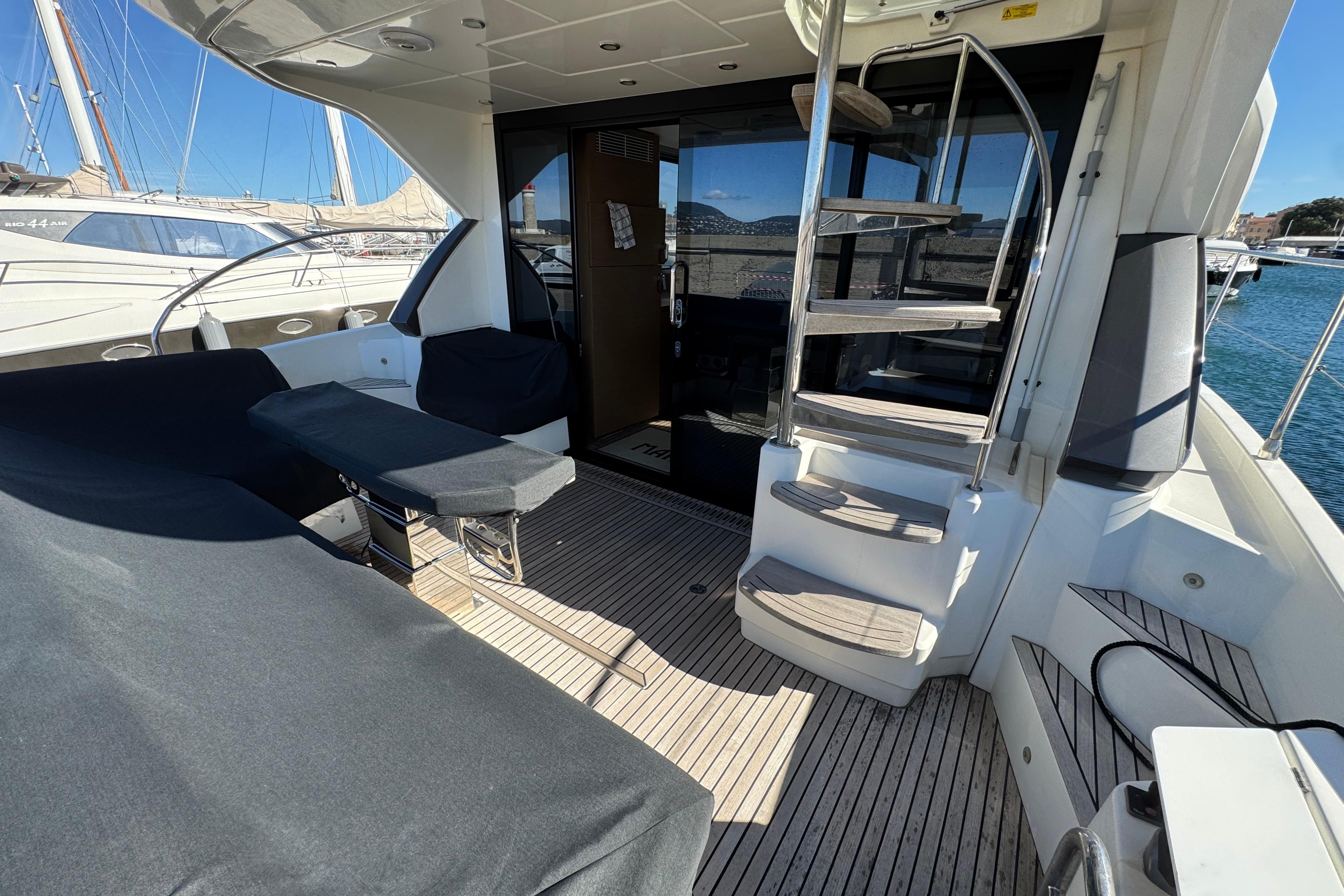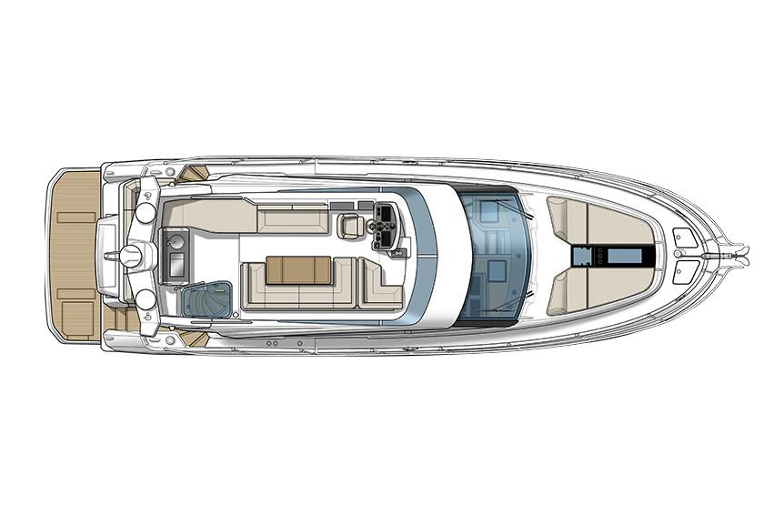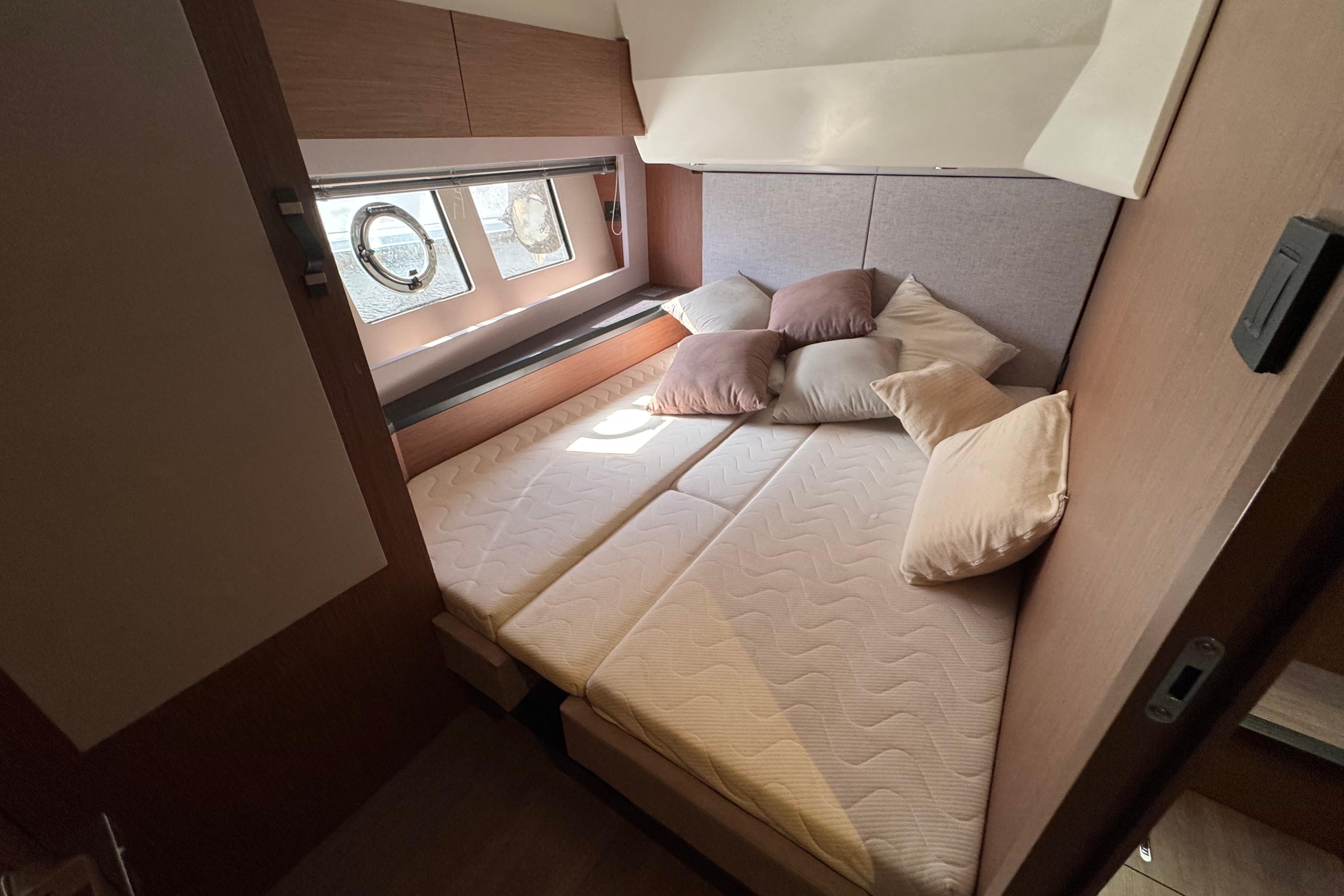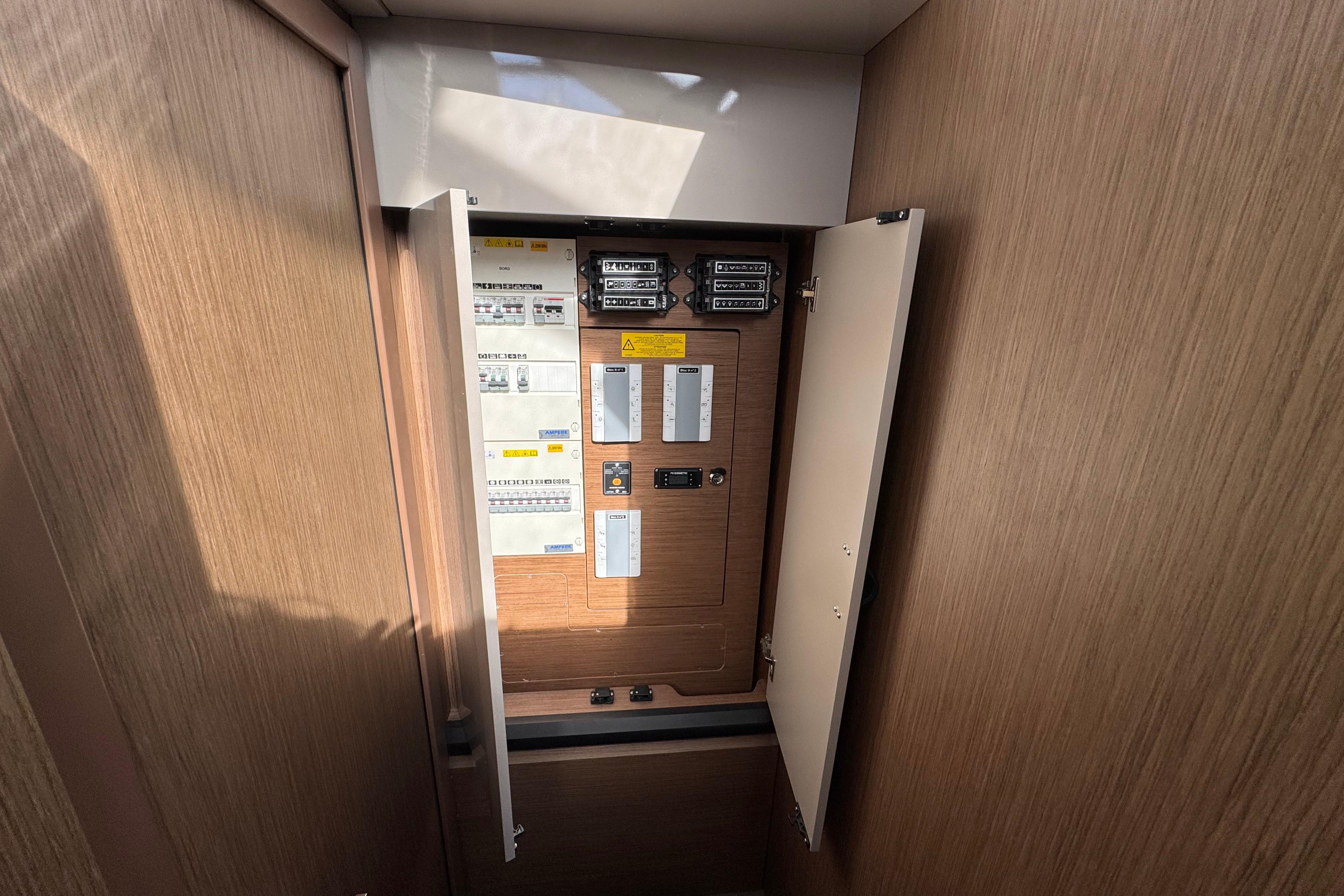 La nouvelle carène en V évolutif offre davantage de volume intérieur. Le très grand carré comme les somptueux espaces nouvellement configurés du fly, l’immense suite propriétaire, les trois cabines et les deux salles d’eau s’harmonisent dans un univers volontairement plus sobre, boiseries et vaigrages clairs, au diapason des tendances contemporaines les plus actuelles.