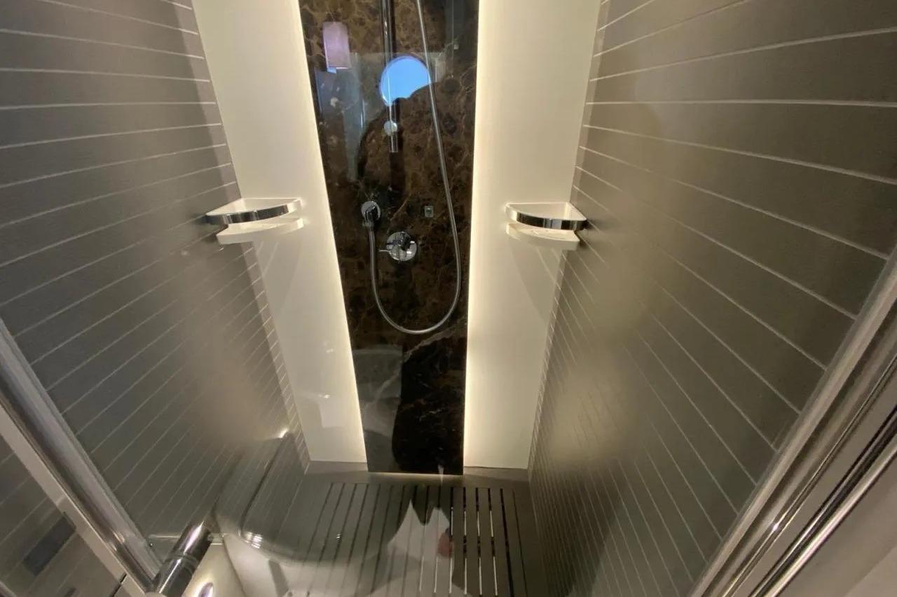 Access to the swim platform is available from both port and starboard sides, with shore power and fresh water connections when moored. The extendable and submersible hydraulic bathing platform conceals a garage with capacity for both a tender and a jet ski, complemented by full 360° exterior lighting.