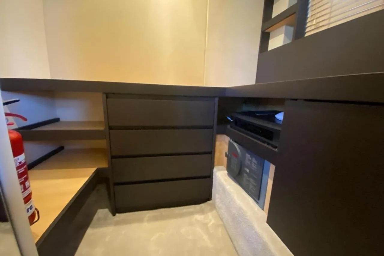 Main Deck InteriorEntry to the main salon is through a sliding glass door. The main deck offers a spacious relaxation area with sofas and a 55” TV that rises electronically (also controlled via the yacht’s domotics system). There is a dedicated coffee area, bar, refrigerator, wine cooler, and multiple storage compartments.