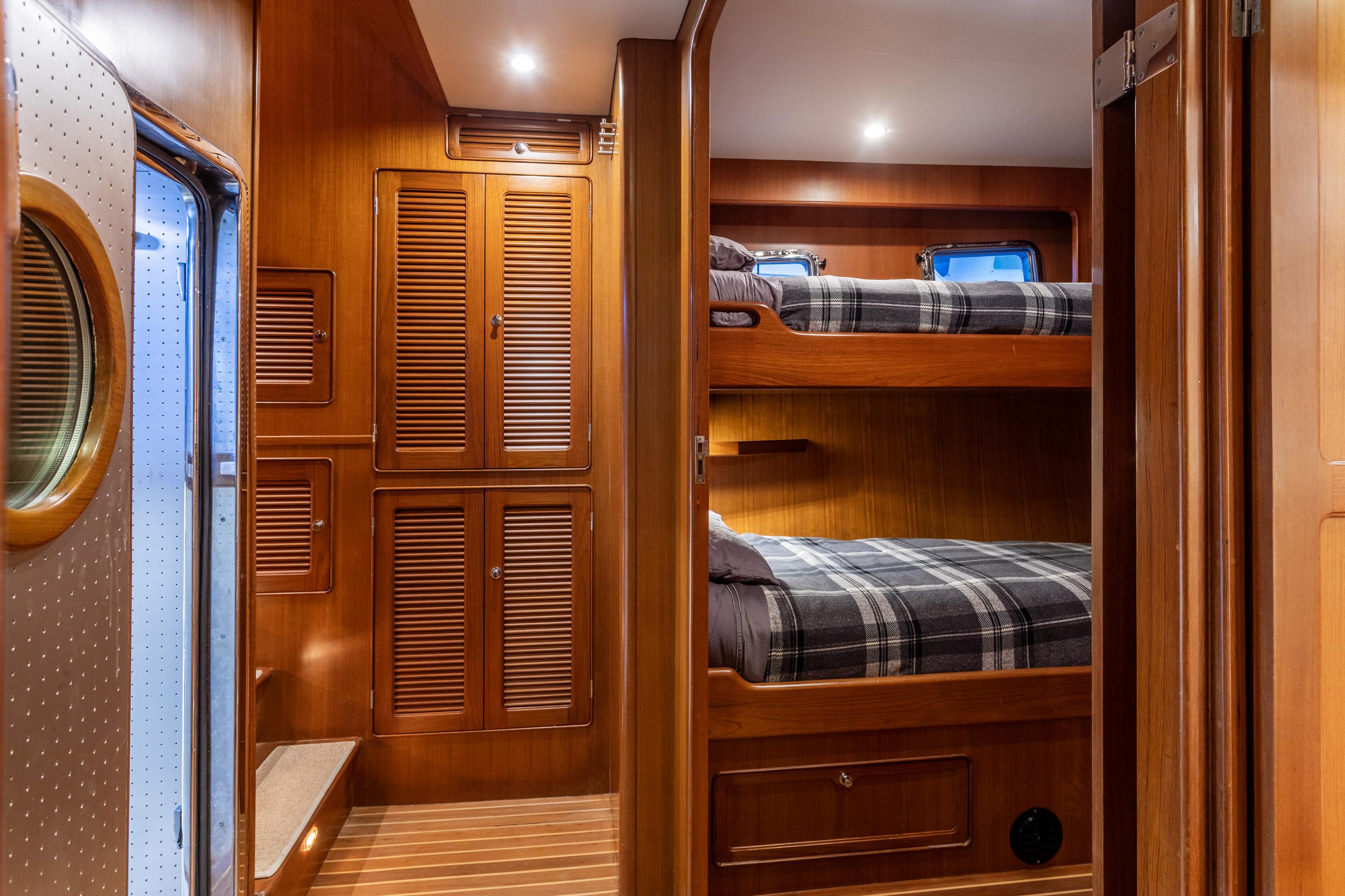 The guest cabin to port, located off the companionway, offers over-and-under bunks and unique bi-fold privacy doors that create a fully enclosed cabin when in use. Guests also enjoy easy access to their own dedicated head with stall shower. With a Kabola thermostat control, a large hanging locker, drawers, and two additional opening portlights, the guest cabin provides a comfortable and practical space for family or visitors.