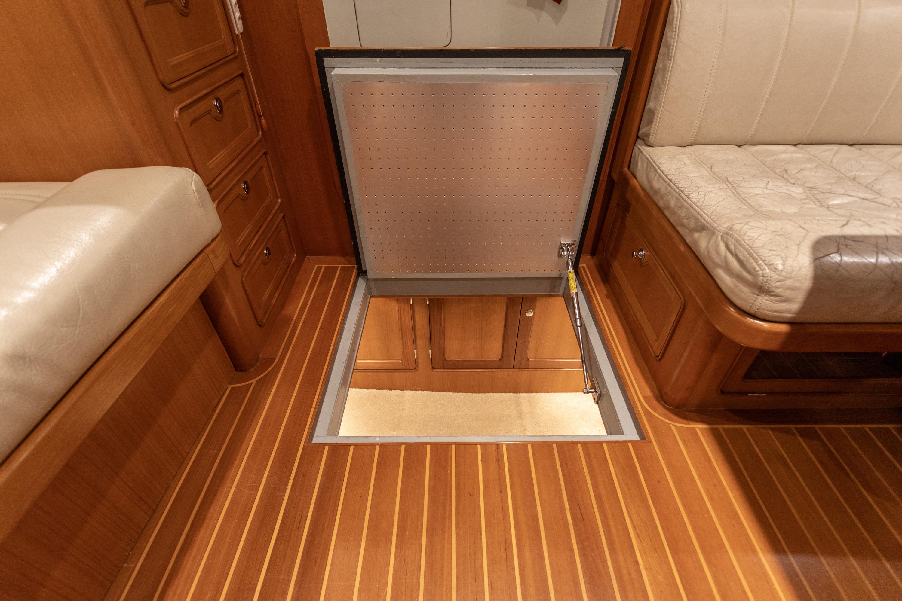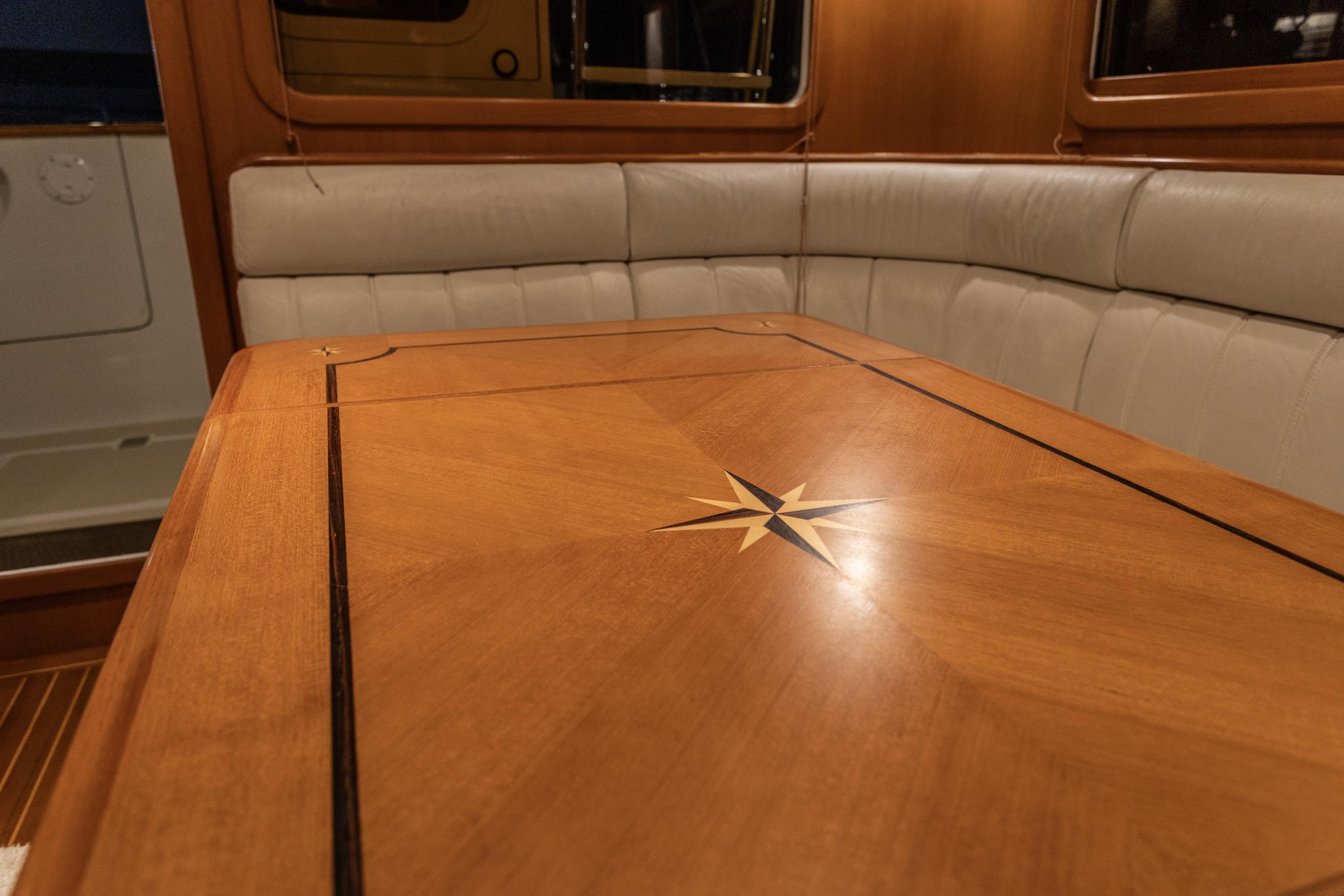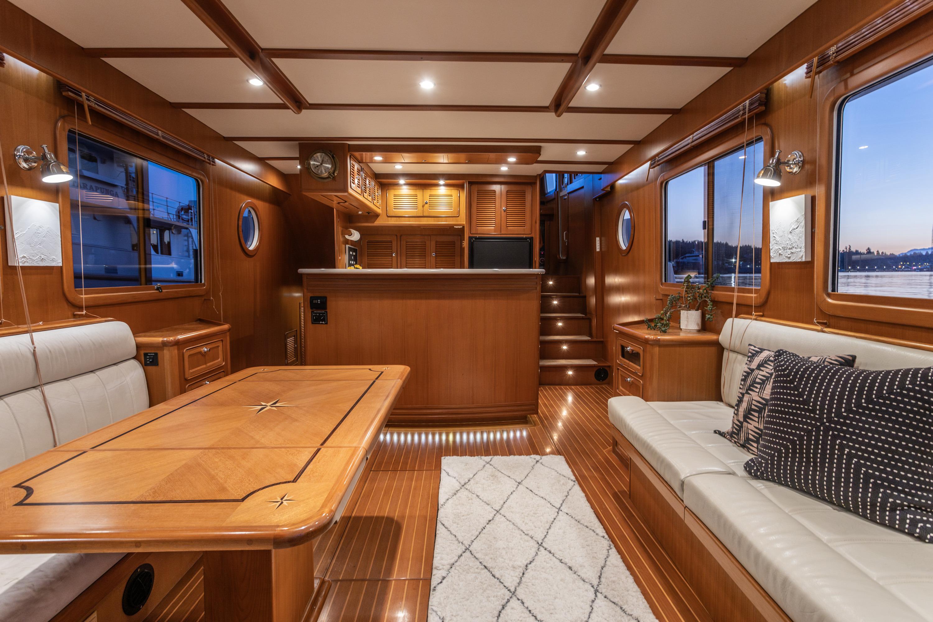 Step into the spacious salon, where comfort and elegance converge. You'll find a leather L-settee to port, while a teak dining table capable of accommodating six guests serves as the centerpiece for shared meals and conversation. On the starboard side, a custom teak straight settee offers additional seating along with concealed storage below.