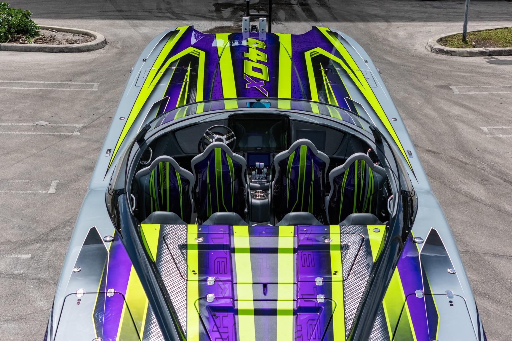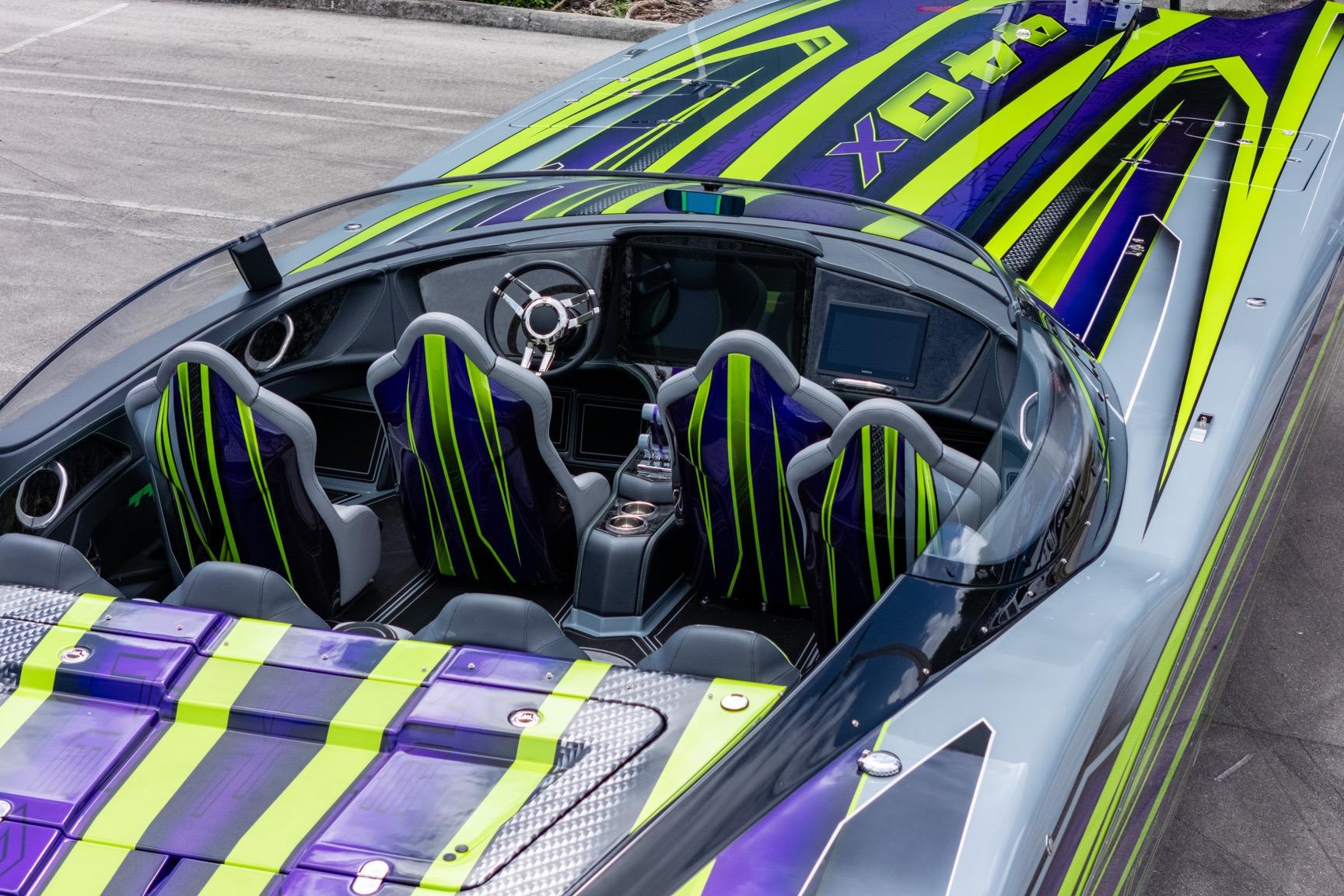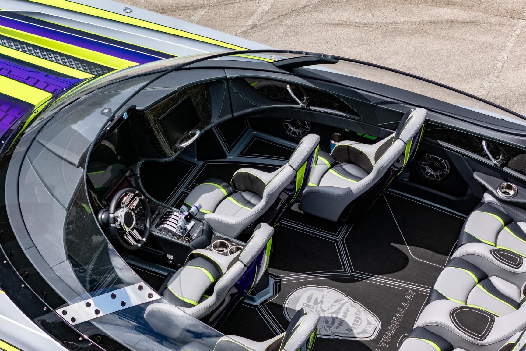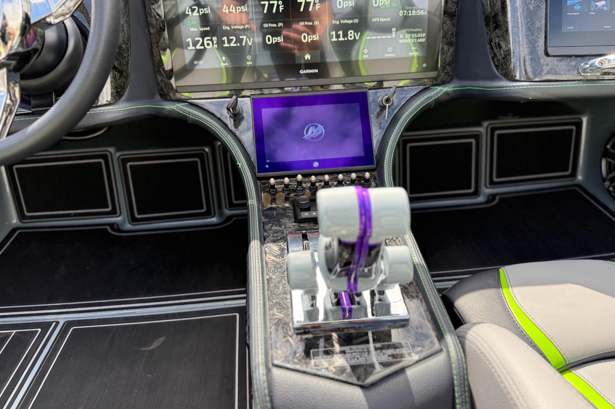 Carbon Fiber Hull and Deck. Custom Gel coat bottom and painted cockpit to match. Upholstered wrapped dash. Forged Carbon fiber dash panels. 8 Seat configuration. SeaDek flooring and Seadek inside the storage compartments. Garmin 22 inch in the center and a Garmin 12 inch on the passenger side. Stereo stage 2. Underwater lighting. Upgraded Seasmart Polished Stainless Steel Cleats. Cellphone docking charging pods.