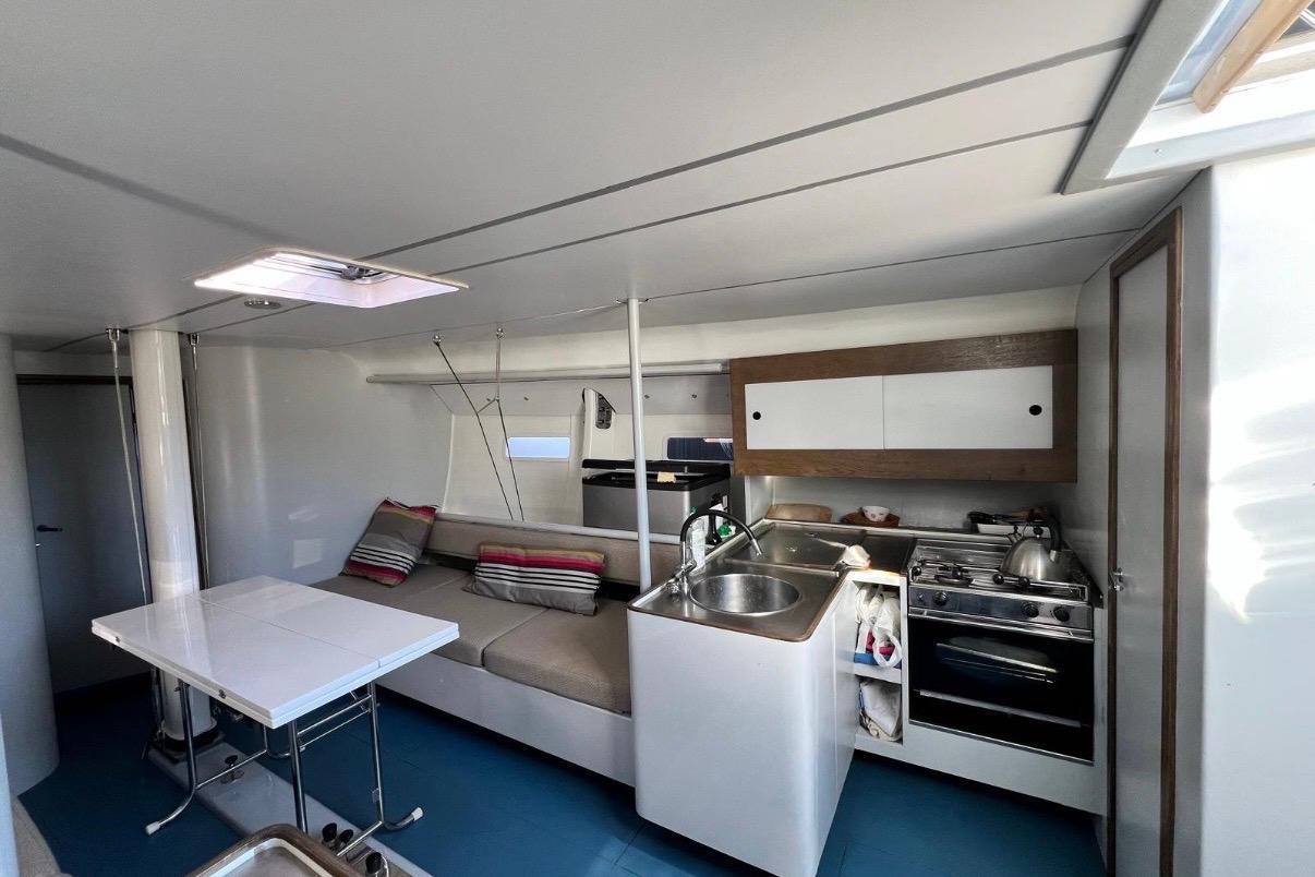 Son dessin moderne privilégie la performance : carène tendue, volumes équilibrés, plan de pont ergonomique pensé pour la navigation en équipage réduit comme pour un programme plus sportif. Puissant sous voiles, sûr à la mer et précis à la barre, il offre des sensations franches tout en conservant un excellent confort de navigation.