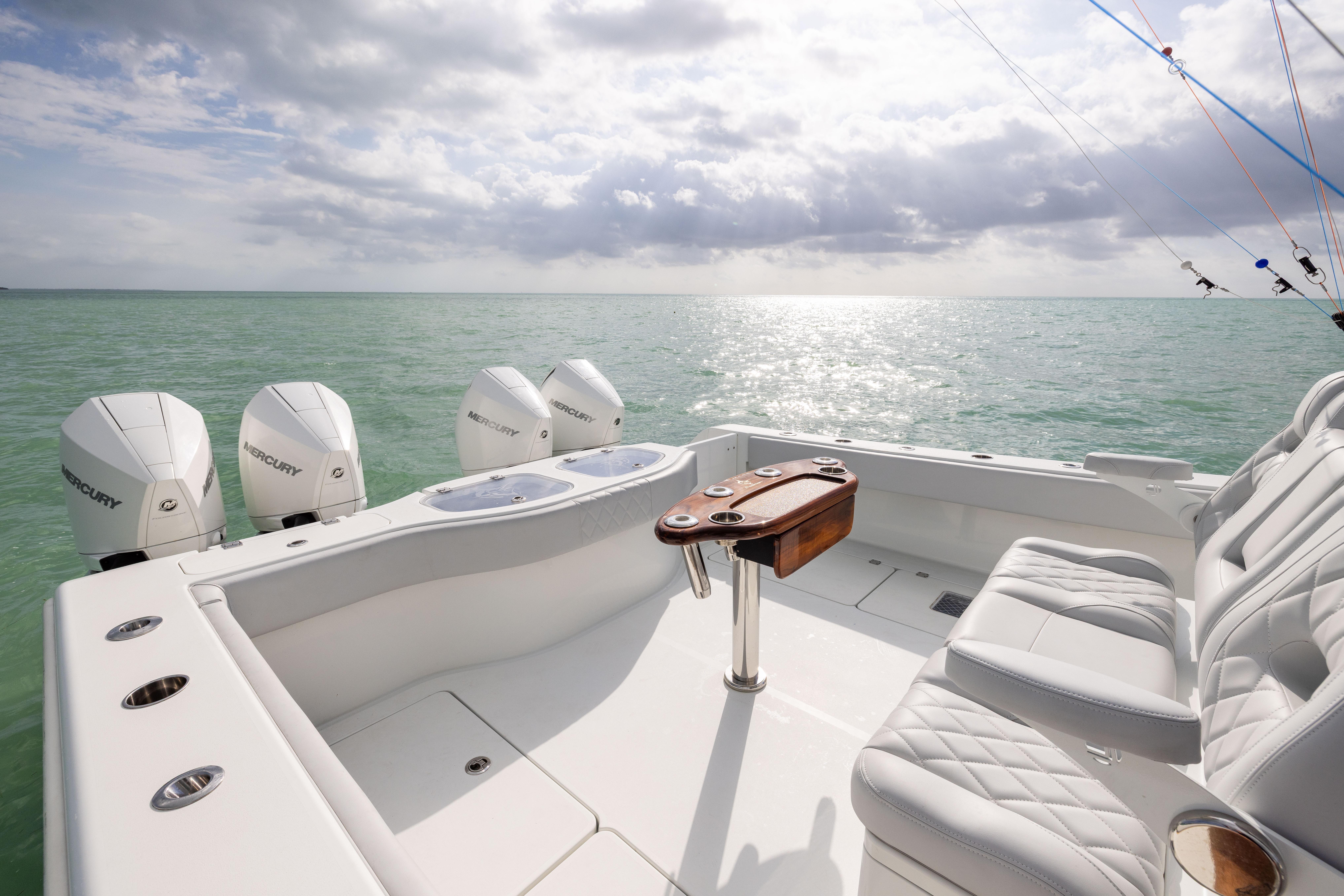 At the helm are twin Garmin 8624 displays supported by a full Garmin electronics suite, including open-array radar, dual Airmar transducers, FLIR night vision, and a powerful 50” Rigid light bar for confident navigation day or night. Fishing capability is enhanced with Gemlux Bluewater outrigger bases, 21’ Marsh Tacky carbon fiber outriggers, teak rocket launcher, multiple electric reel outlets, and dual in-floor livewells.