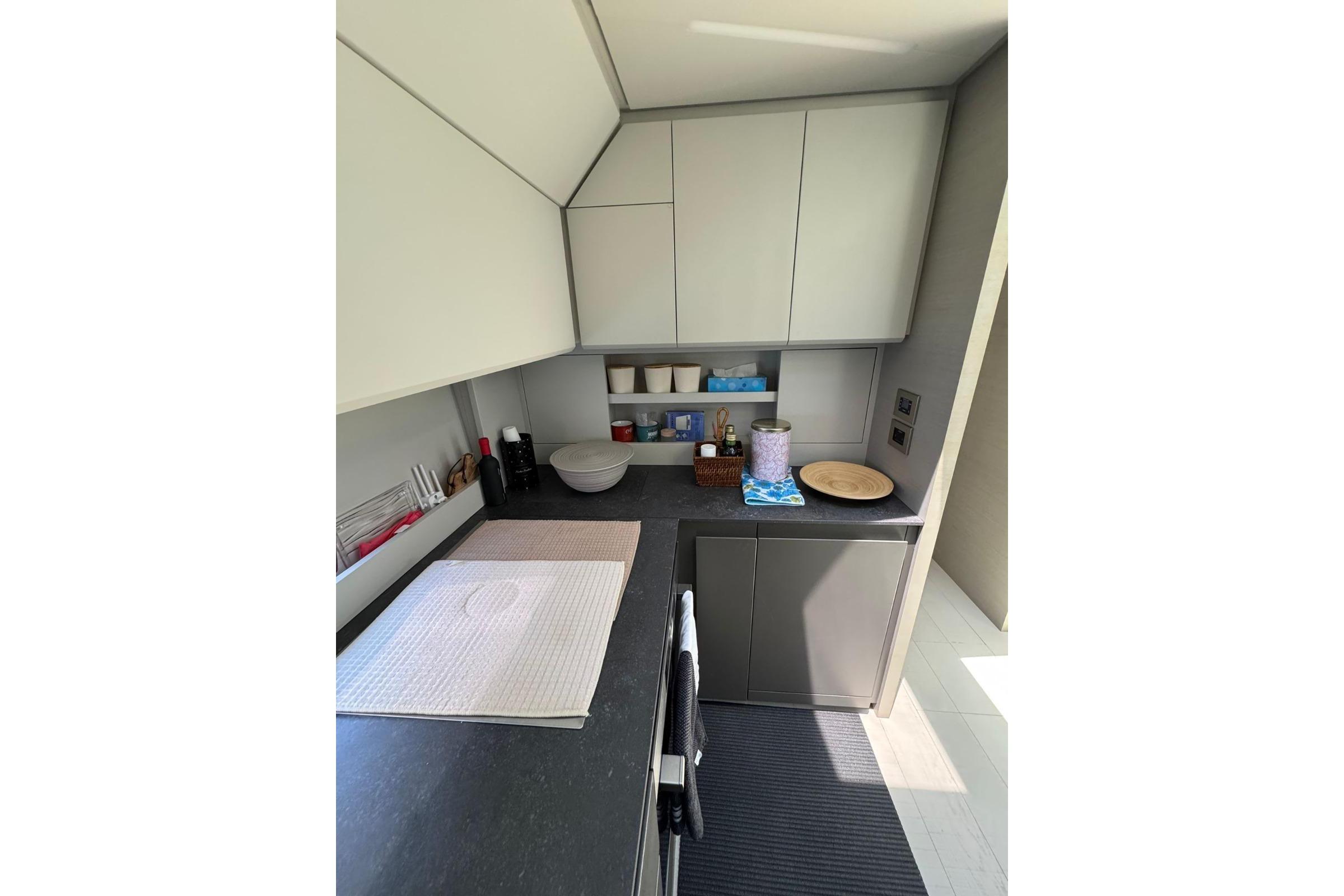 Realizzato con ampio utilizzo di fibra di carbonio, lo scafo garantisce leggerezza strutturale, rigidità e performance elevate, mantenendo al contempo uno stile inconfondibile firmato dal design italiano. Le ampie superfici vetrate e il tetto scorrevole in vetro creano un ambiente luminoso e moderno nel salone principale, in perfetta continuità con gli spazi esterni dedicati al relax e alla convivialità.
