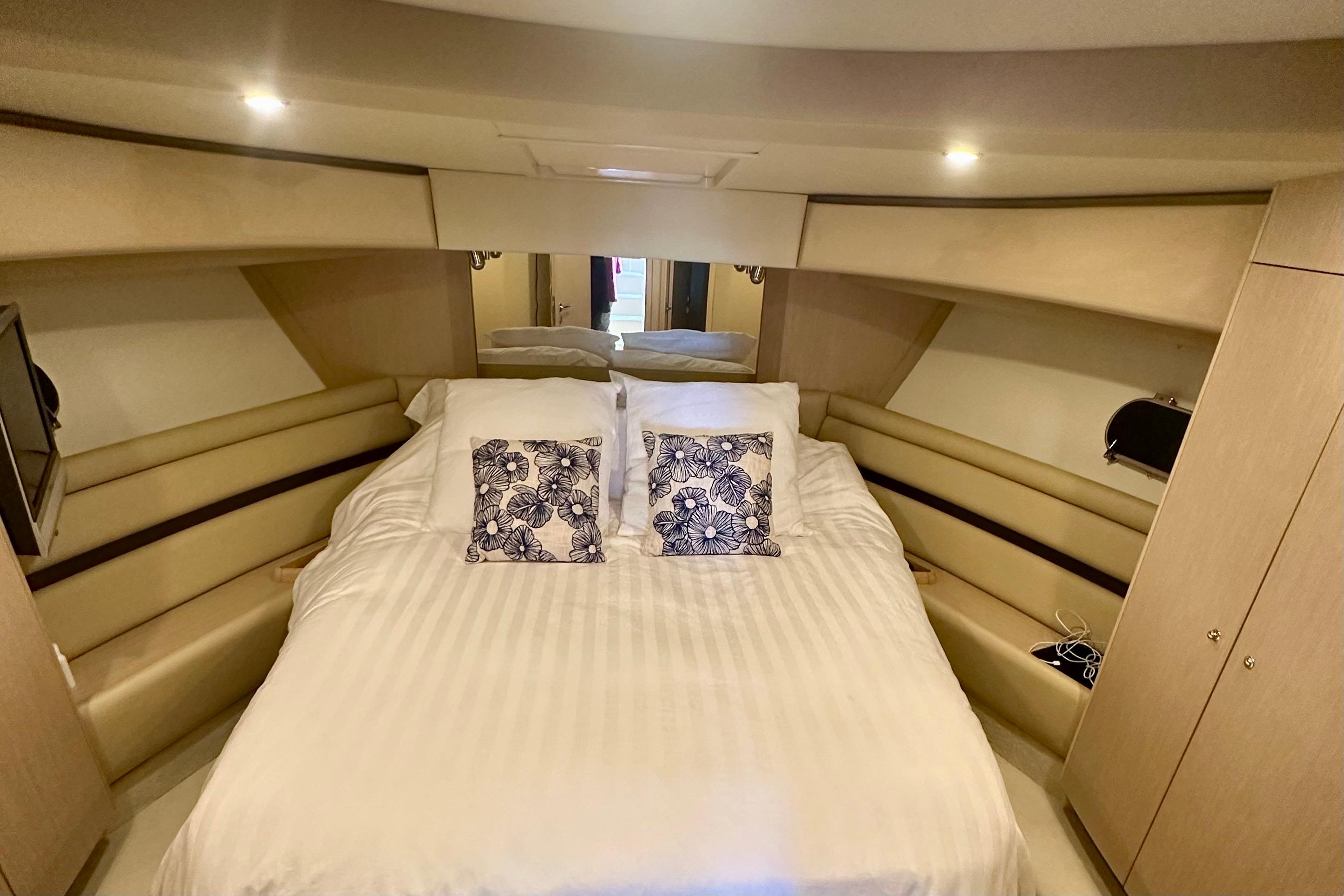 She has one private master stateroom and two separate guest cabins, each with private head and shower, and several indoor and outside choices for social gathering and private work or leisure.