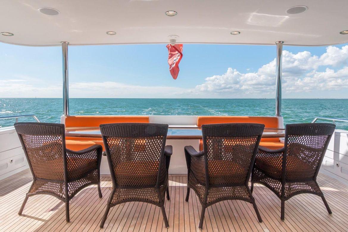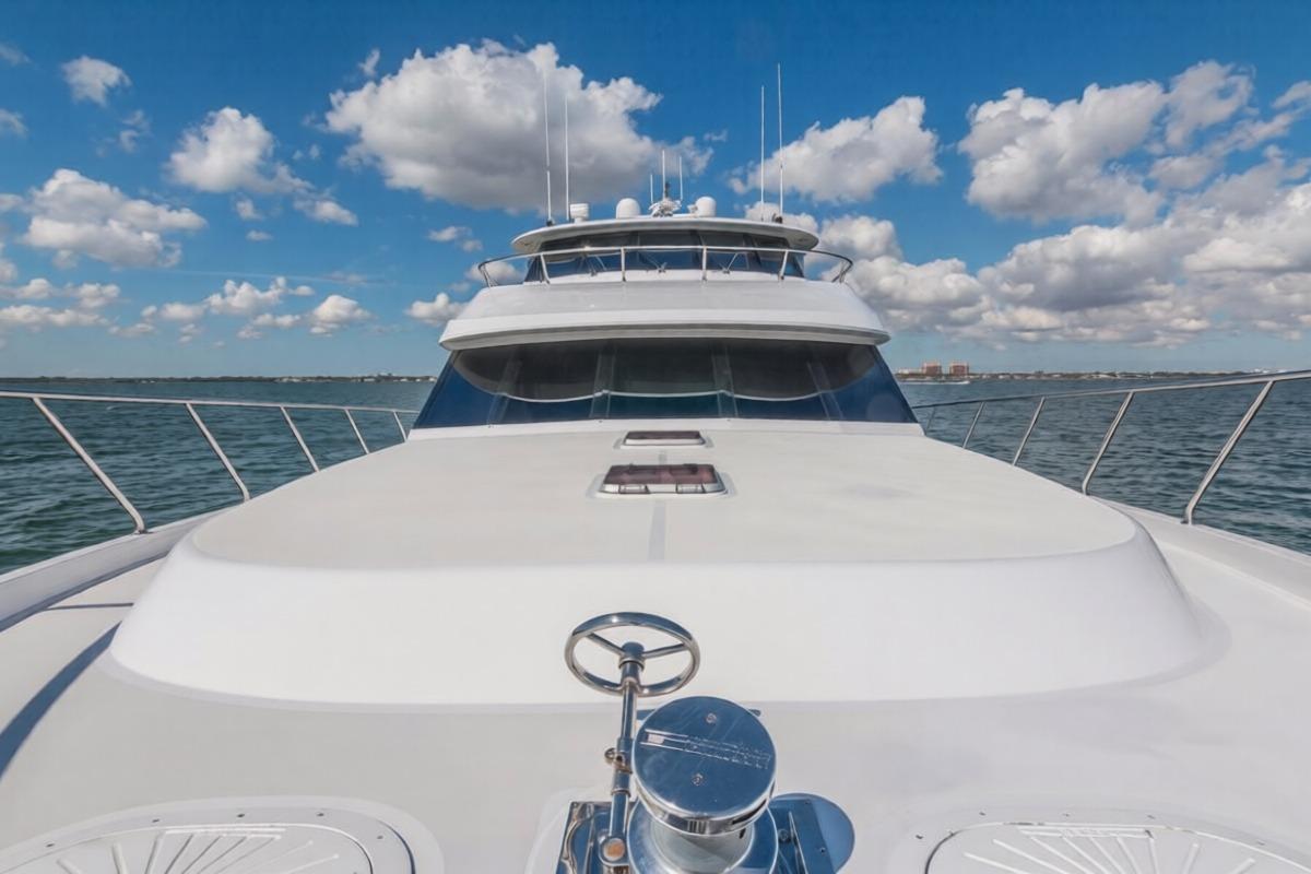 The vessel has teak overlay decks on the aft deck, side decks, and swim platform with painted non-skid decks on the bow and skylounge aft deck. She has polished stainless steel rails and deck hardware.