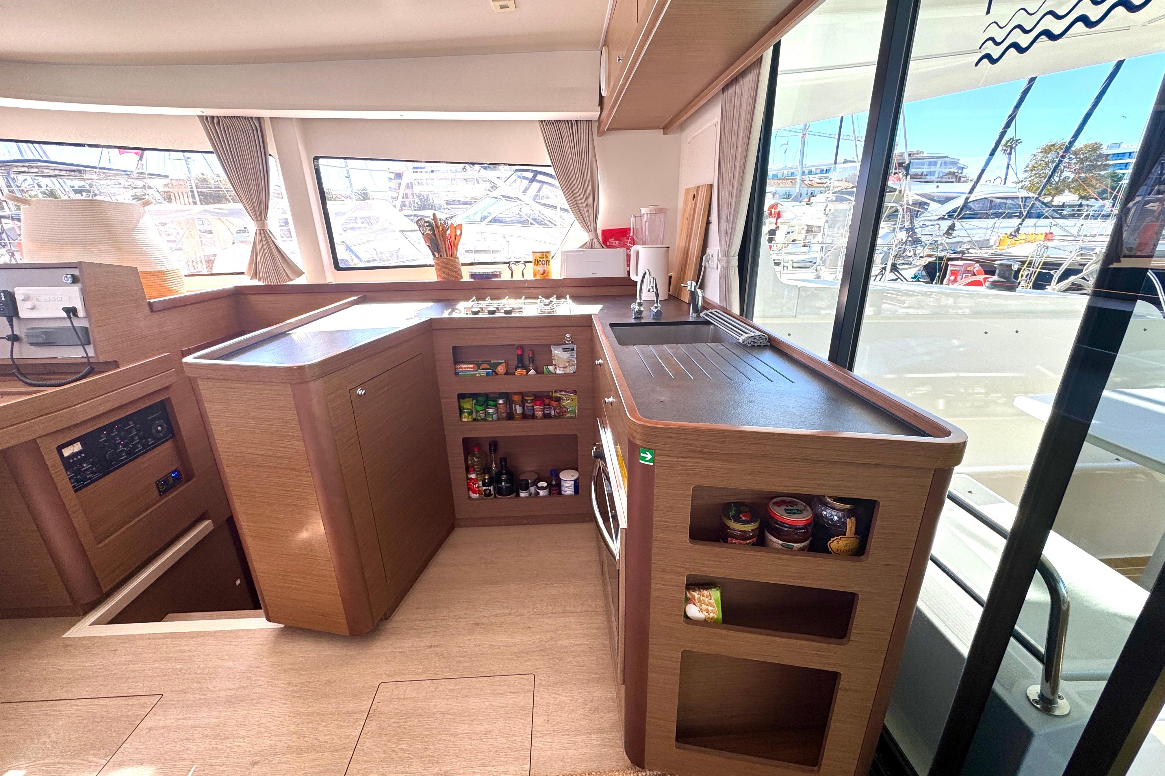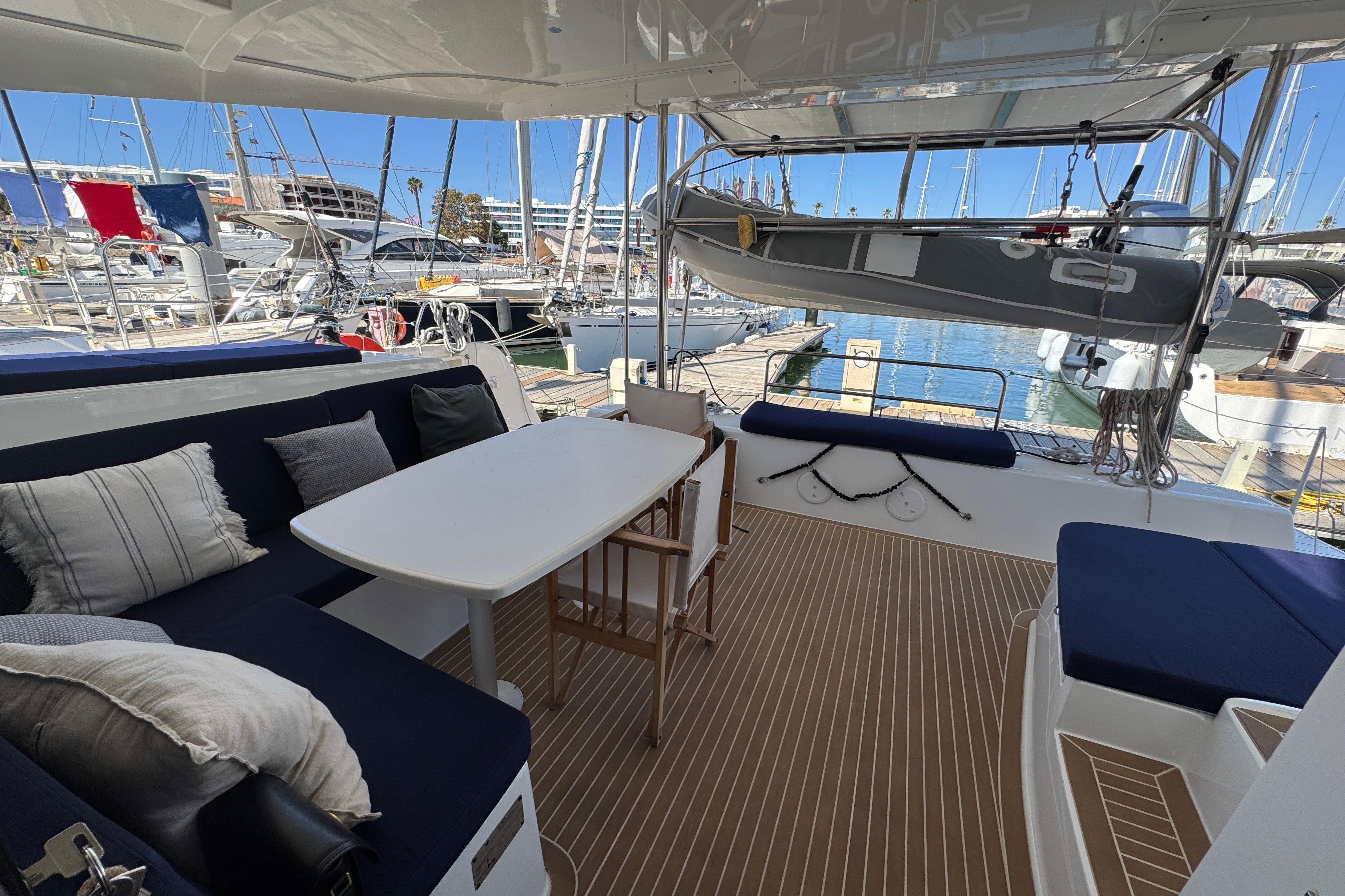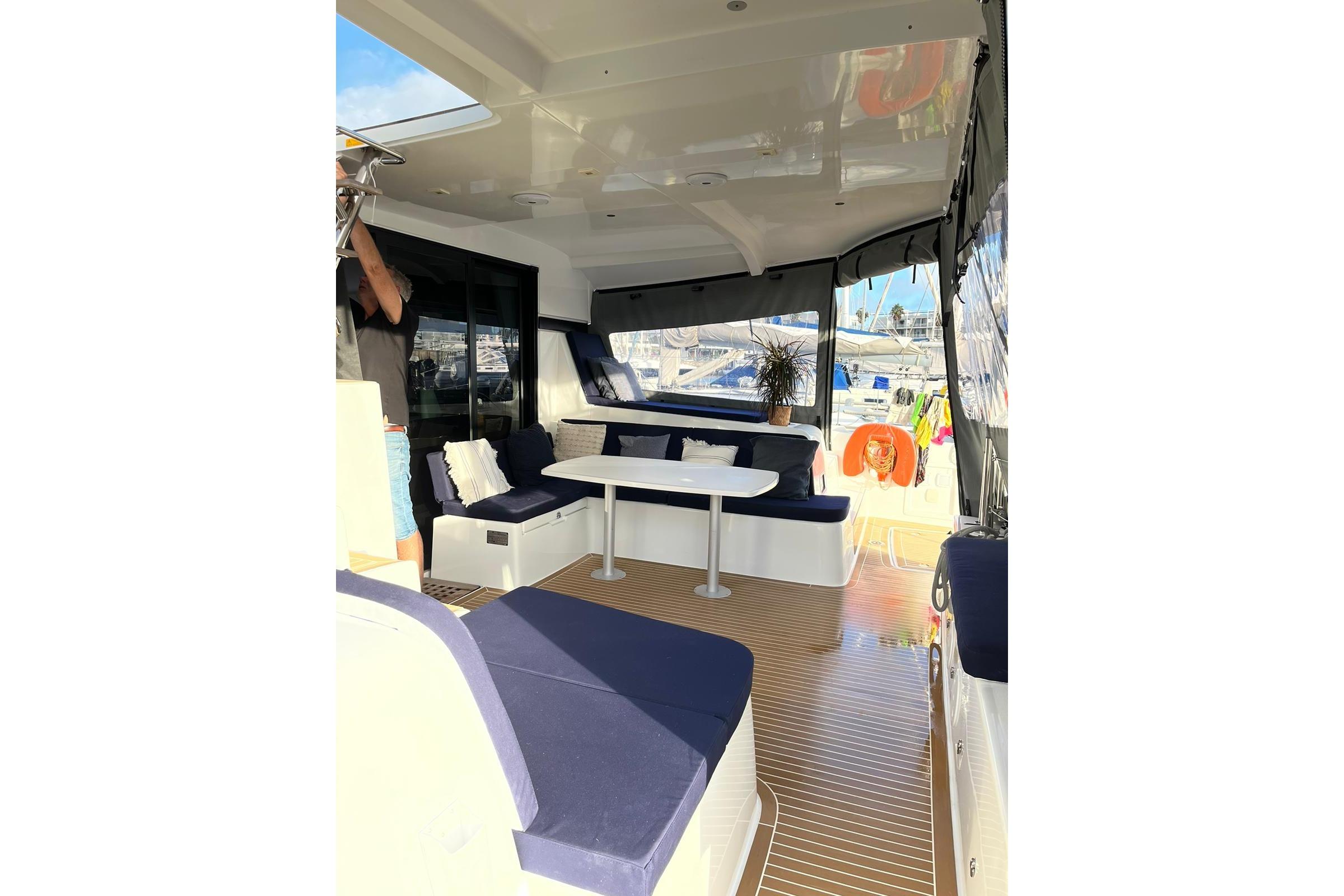 A small staircase from each pontoon leads up to the central grand salon. Once again, a space filled with light from the surrounding large windows on the sides and facing the front of the boat and the large sliding glass doors leading out to the aft deck. The saloon accommodates a large comfortable sofa group, navigation area, and the galley. In the galley you will find a 3-burner gas stove and oven, a fridge, a freezer and spacious cabinets for storage. From the grand salon, the sliding glass doors lead out to the aft deck where you find several relaxing seating areas and a sofa seating up to 6 people with a fixed table and a fridge for cold drinks. The aft deck floor is updated with Flexiteek that is both durable and easy to maintain. The whole aft deck is covered with a fixed hard top roof and can be fully enclosed with covers on all sides. Also located by the aft deck are the davits for hoisting and securely holding the dinghy when not used. Above the davits are the 1050W solar panels that also cover and protect the dinghy.