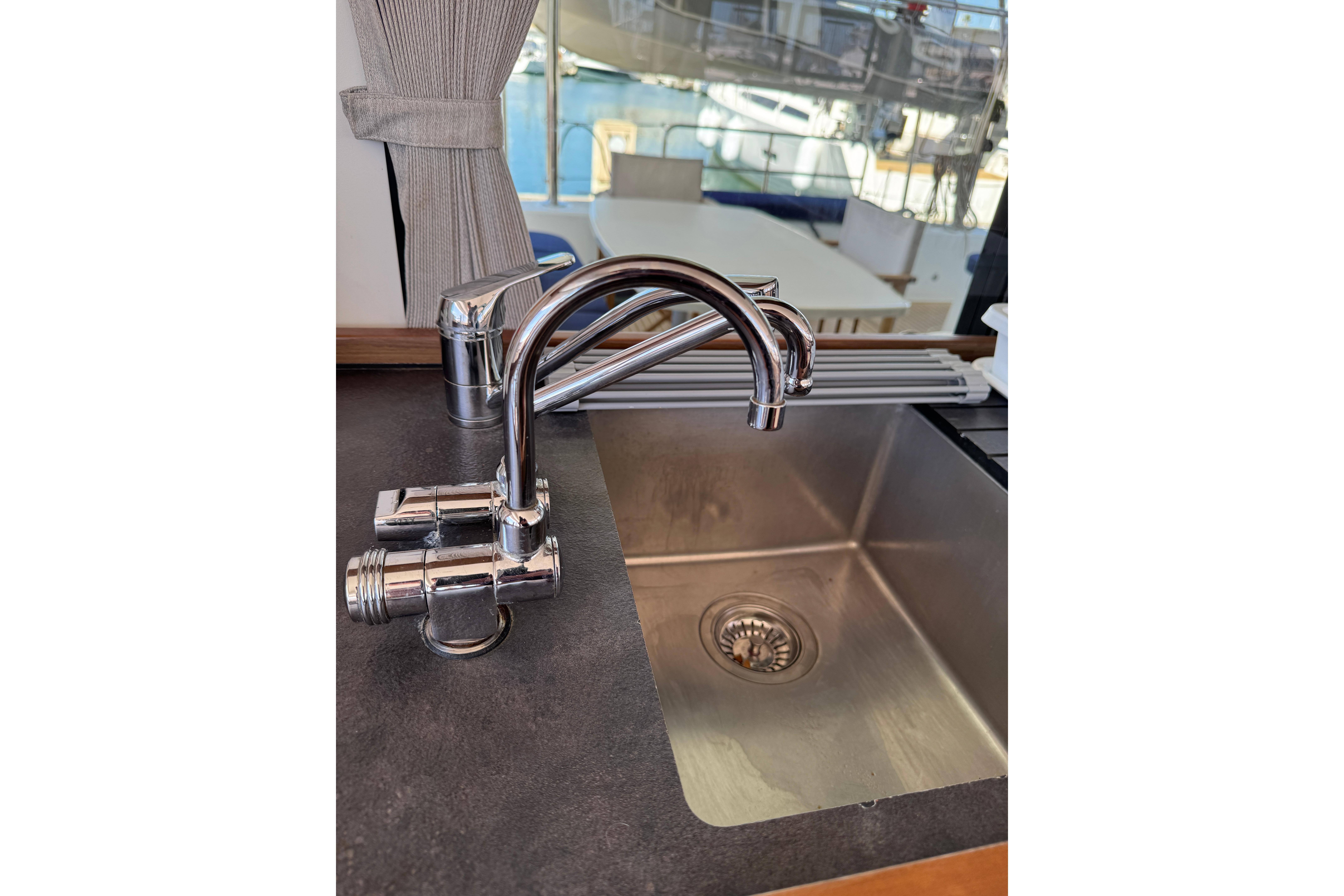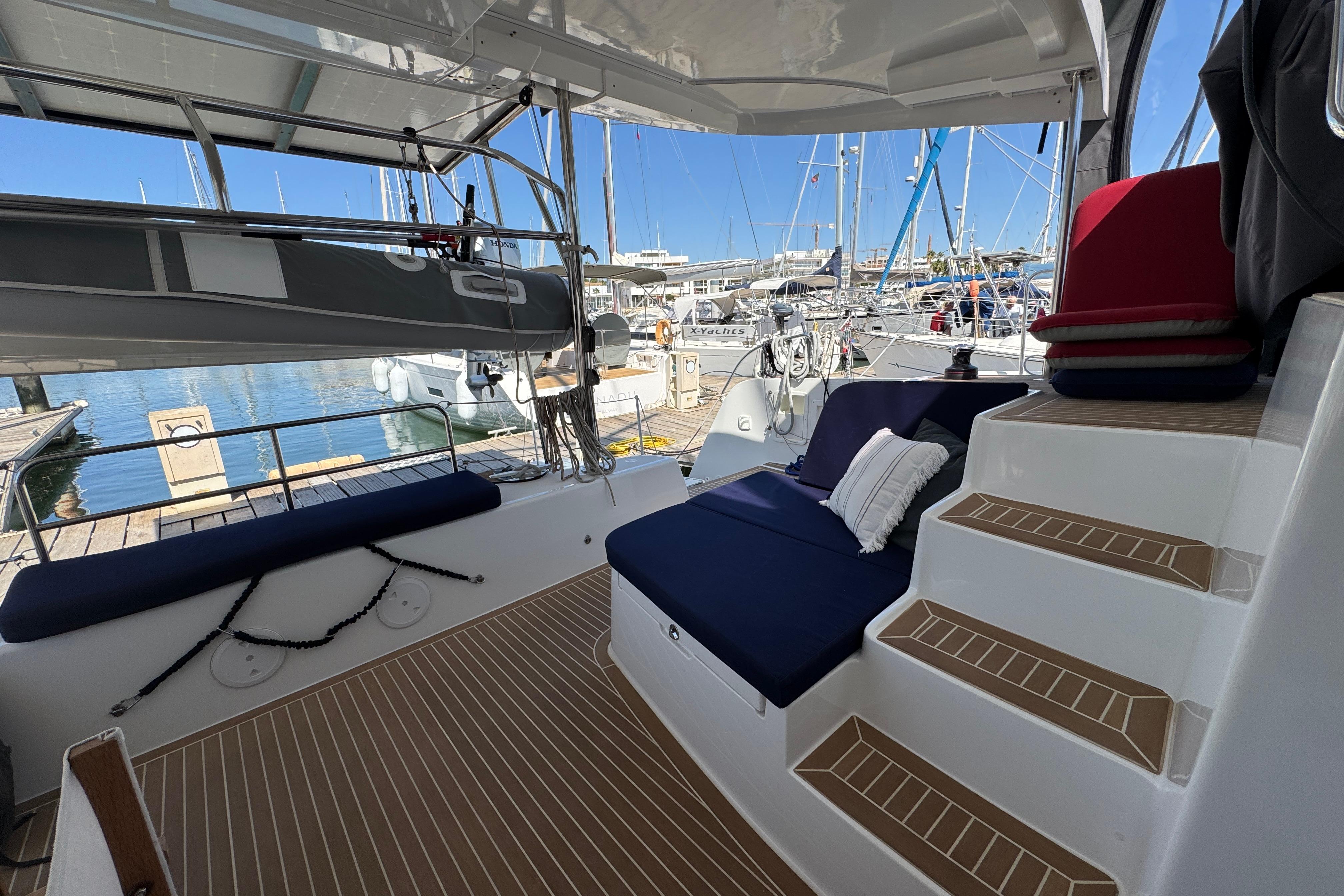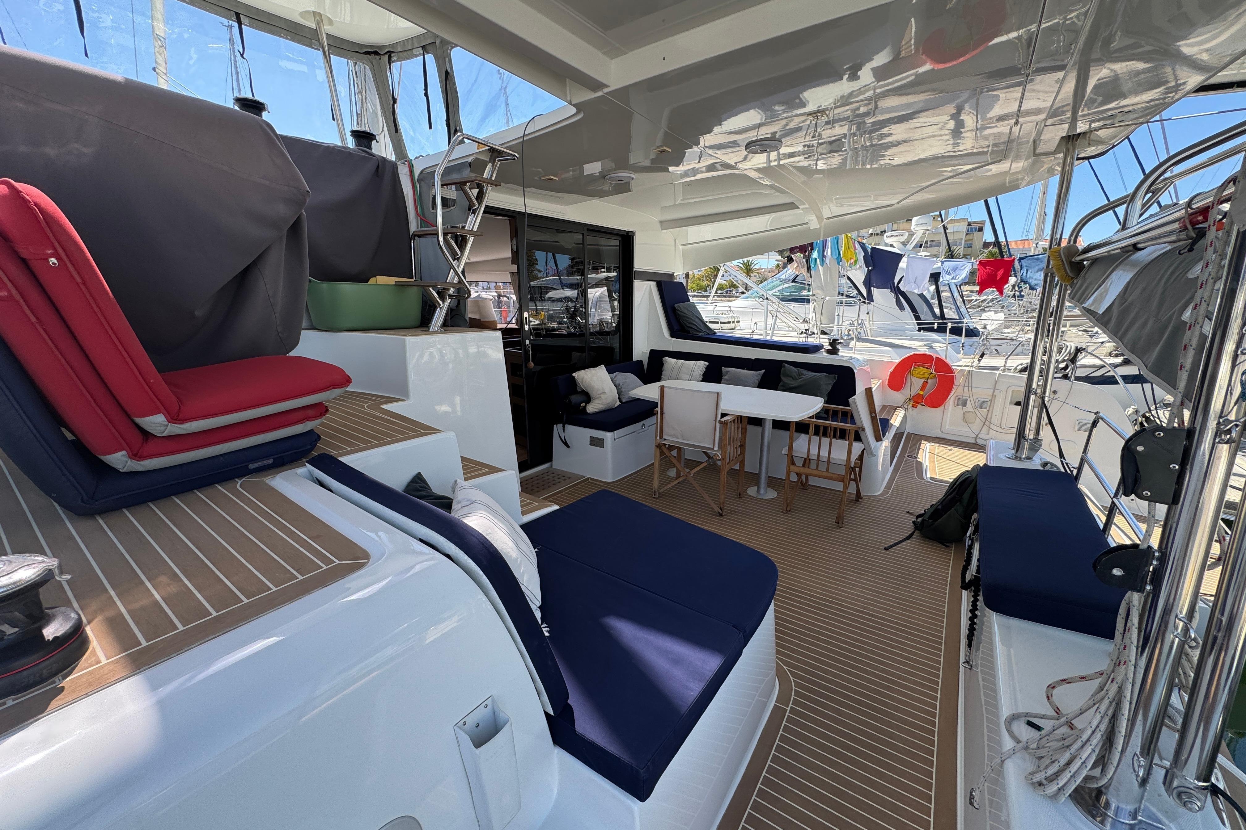 A small staircase from each pontoon leads up to the central grand salon. Once again, a space filled with light from the surrounding large windows on the sides and facing the front of the boat and the large sliding glass doors leading out to the aft deck. The saloon accommodates a large comfortable sofa group, navigation area, and the galley. In the galley you will find a 3-burner gas stove and oven, a fridge, a freezer and spacious cabinets for storage. From the grand salon, the sliding glass doors lead out to the aft deck where you find several relaxing seating areas and a sofa seating up to 6 people with a fixed table and a fridge for cold drinks. The aft deck floor is updated with Flexiteek that is both durable and easy to maintain. The whole aft deck is covered with a fixed hard top roof and can be fully enclosed with covers on all sides. Also located by the aft deck are the davits for hoisting and securely holding the dinghy when not used. Above the davits are the 1050W solar panels that also cover and protect the dinghy.