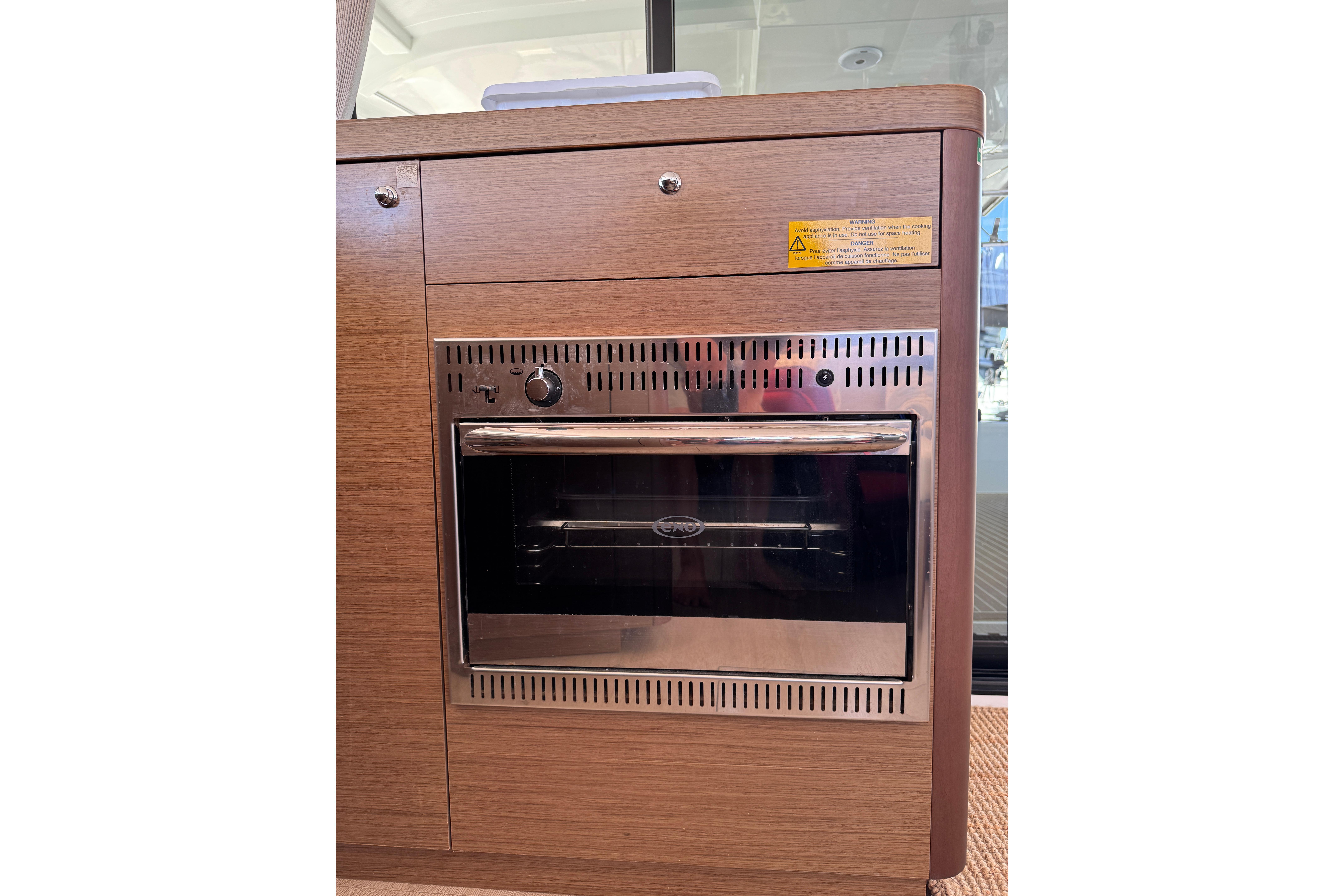 The steering cockpit is elevated and connected to the aft deck and can be fully enclosed with protecting see through covers all around. Whether enclosed or open, visibility is excellent, and you have a view of the entire boat while sailing and maneuvering it. From the steering cockpit you can access the hardtop roof over the aft deck for physical access to the boom and mast. In the front there is the classic catamaran trampoline between the pontoons for safety, relaxing and sunbathing.