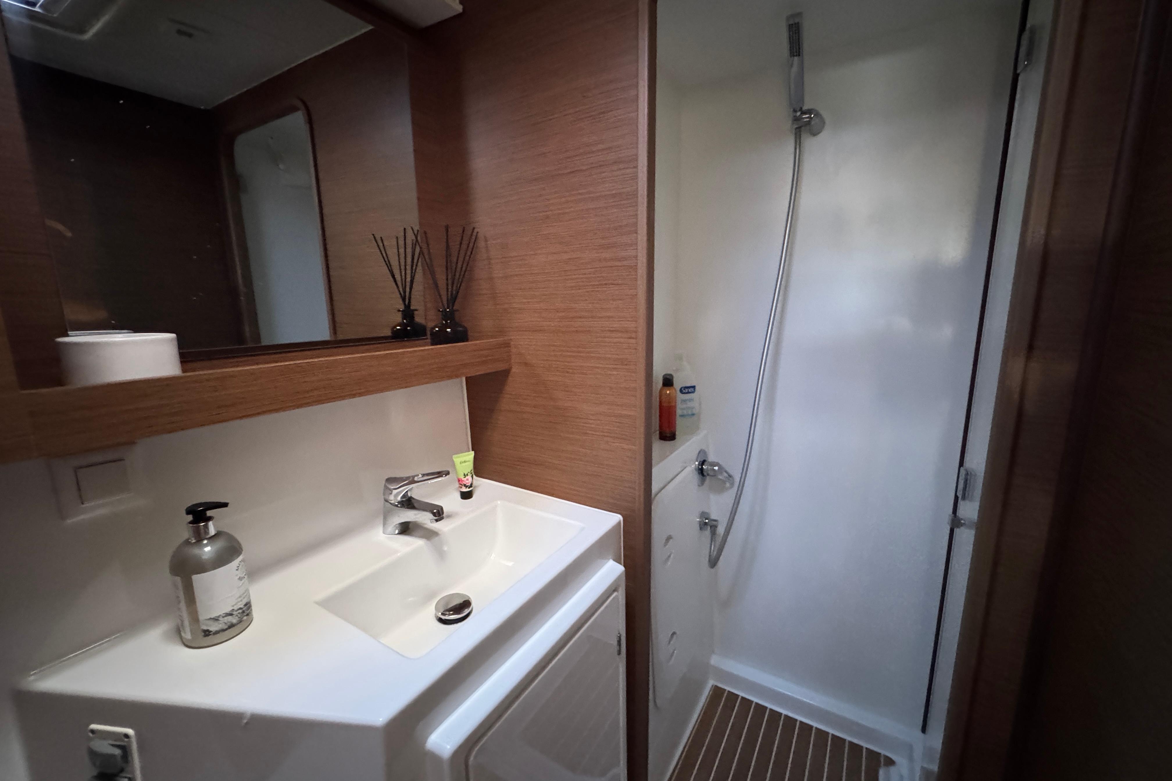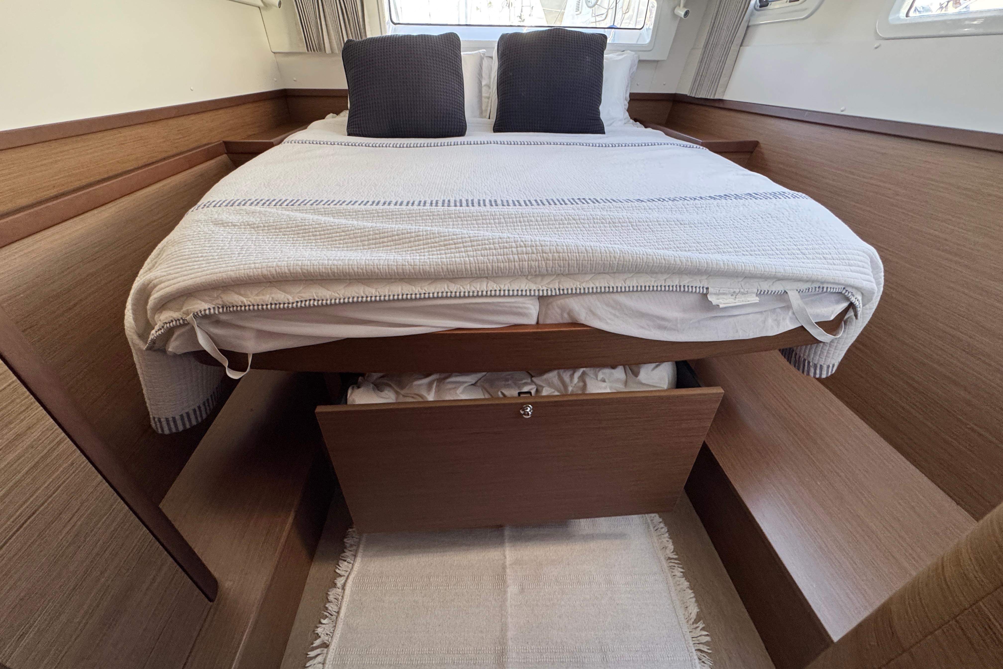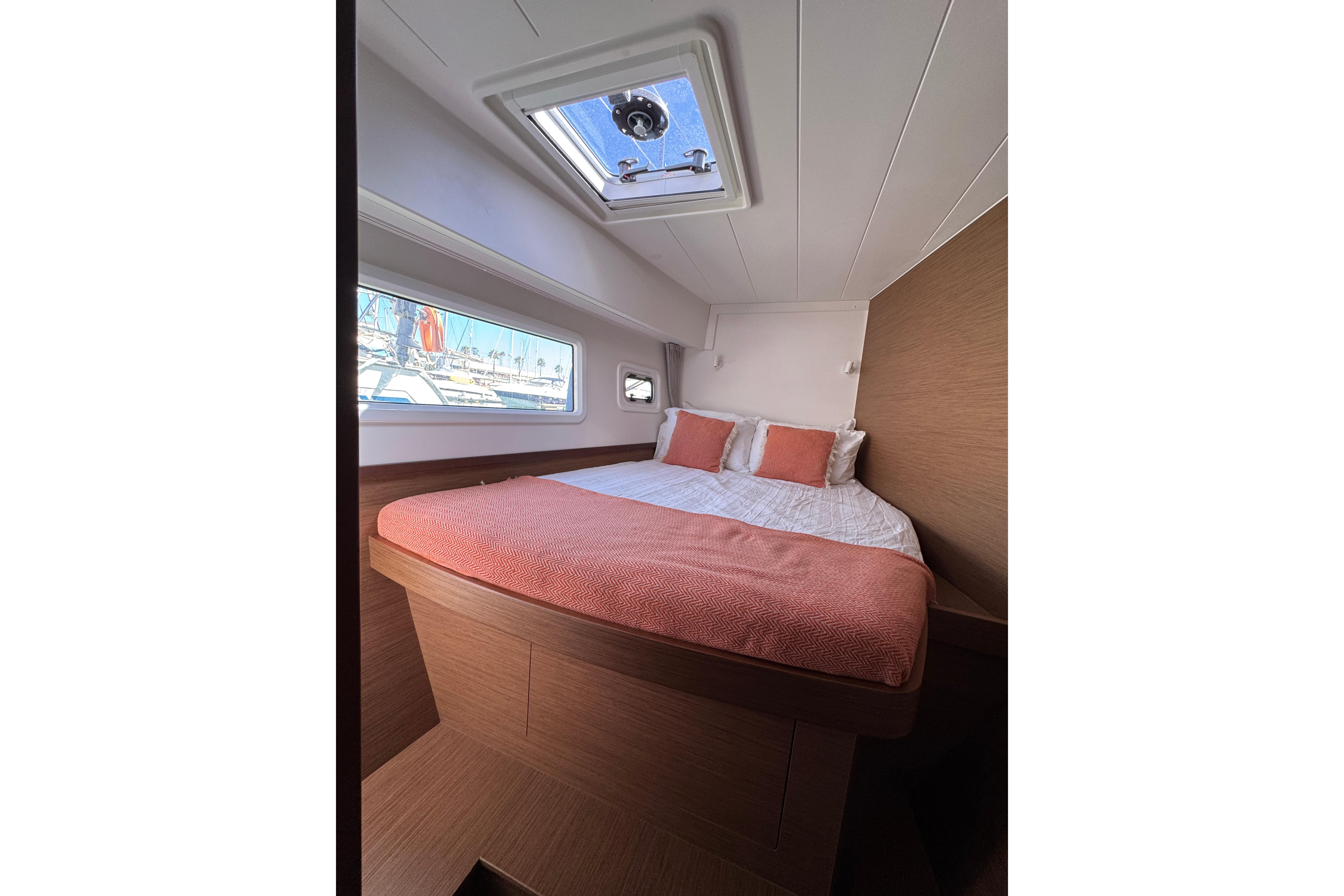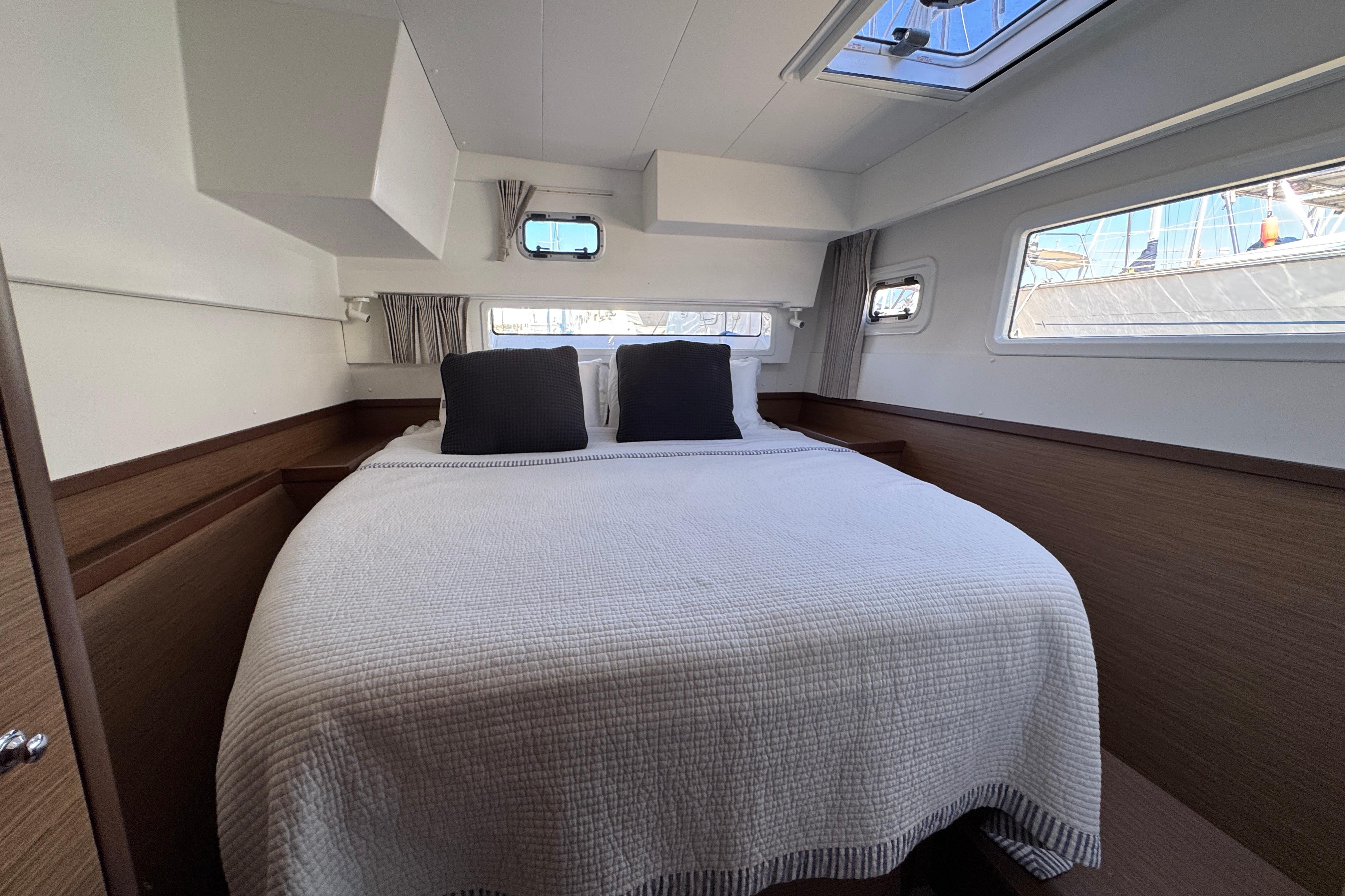 This Lagoon 42 Owner’s Version is meticulously maintained and in perfect condition! An absolute top-class yacht equipped with everything you need to sail in comfort and style. The owner’s version gives you a whole pontoon for a spacious private suite! The suite is located on the starboard side with the suite door by the stairs. The area is bright and airy with a comfortable double bed in the aft that continues to an open space containing a working area with a desk, plenty of storage and a washing machine. In the front part of the pontoon, there is a big bathroom with an electric toilet, washing basin, a separate shower and plenty of storage space. The portside pontoon consists of 2 double bed cabins at each end with with good storage and its own private head. The spacious and generous areas are ideal for family sailing and for inviting friends along.