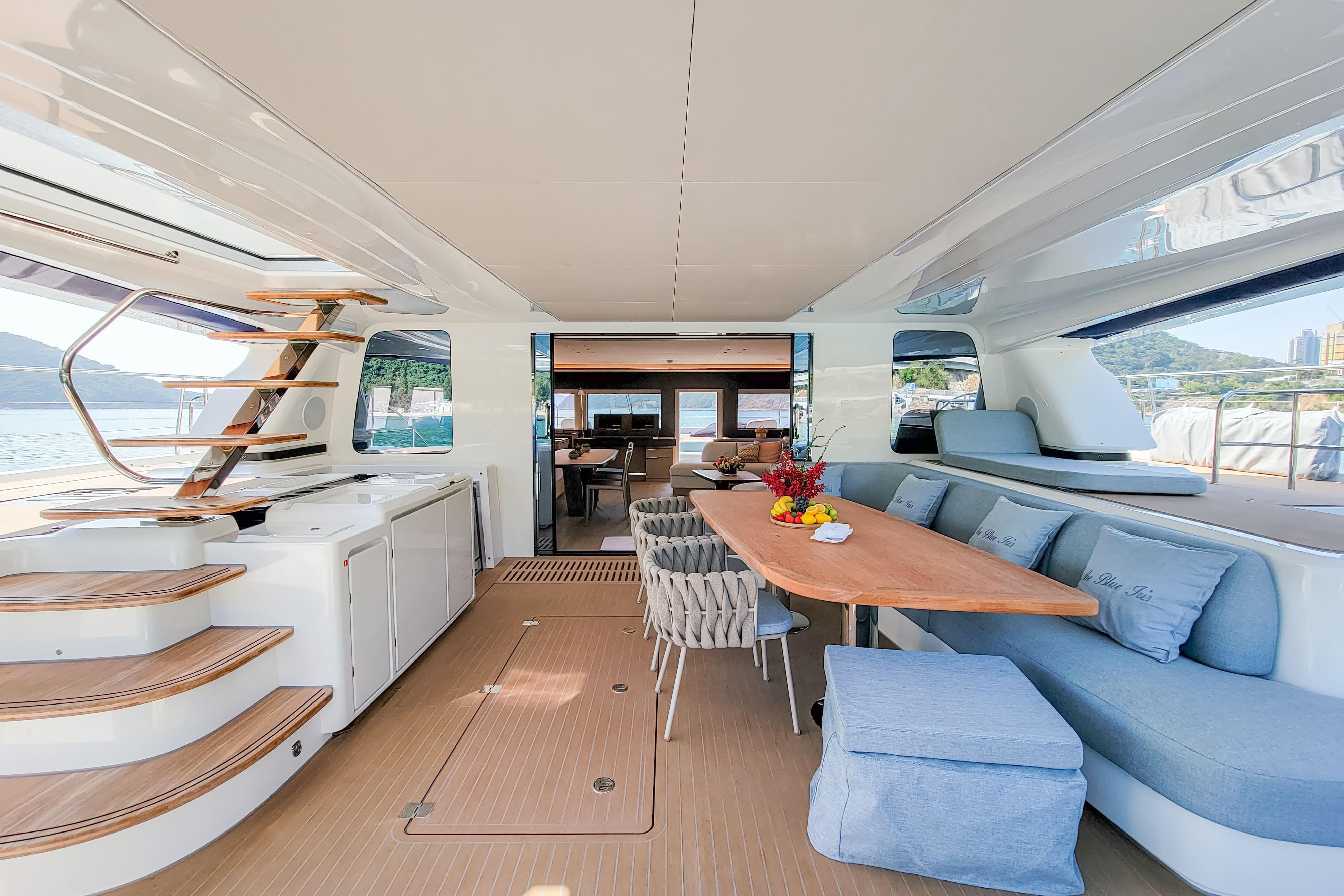 The outdoor spaces are impressive, featuring a spacious dining table and lounge area on the main deck and on the sundeck, perfect for al fresco meals and relaxation. The main deck also provides a perfect space for sunbathing, complete with plush seating for ultimate comfort while enjoying the sea breeze. Additionally, BLUE IRIS boasts an open-air movie theatre, offering a unique entertainment experience.