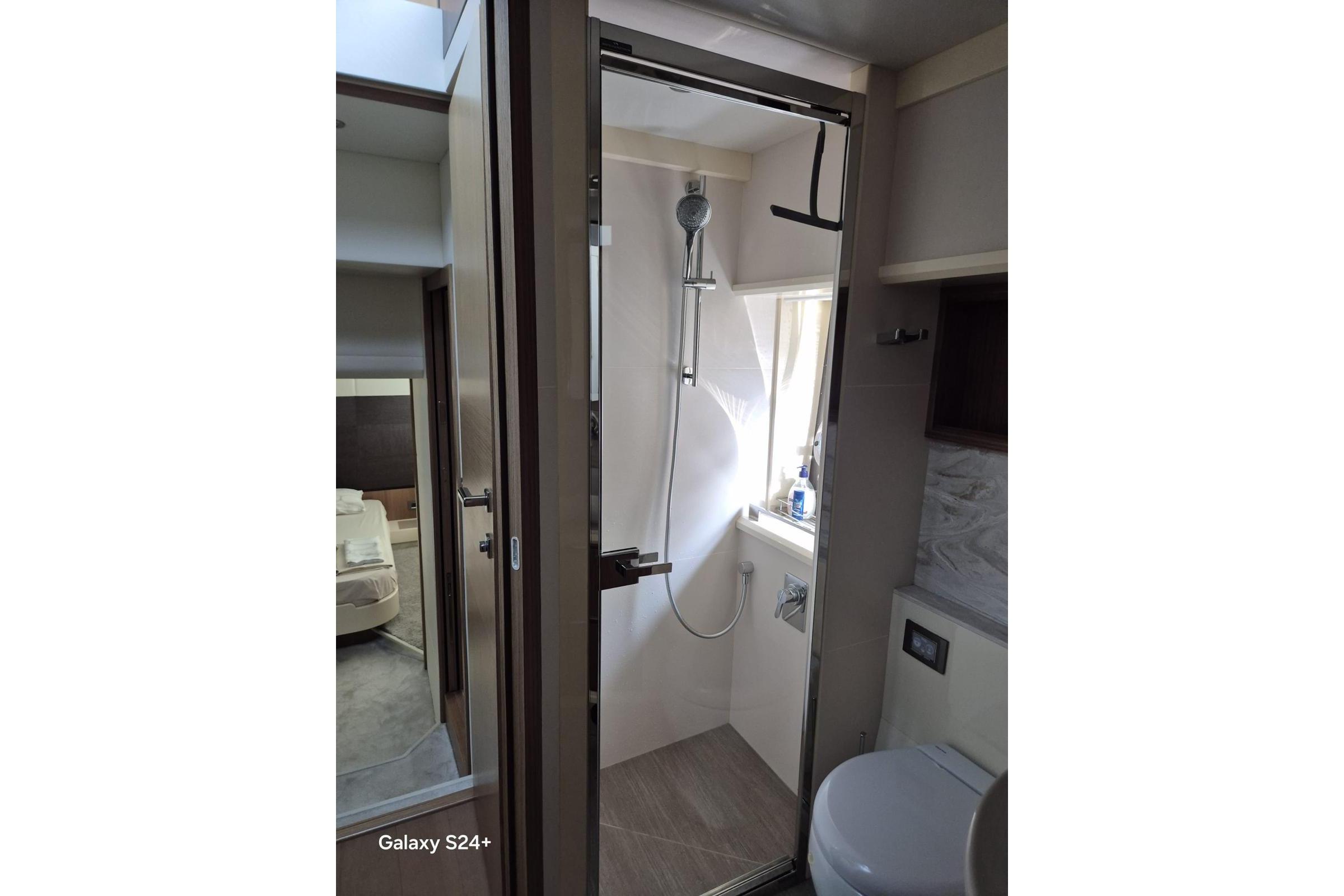 Below deck, the master cabin is placed midship and takes advantage of an area that measures 50 square feet and features a large double berth. The master suite has plenty of walk-around room, high ceilings, beautiful furniture, a large sofa, lots of storage space, and side windows for amazing morning sunrises.The en-suite head is considerably roomy and has a separate, full shower.
