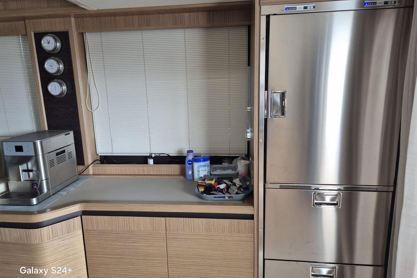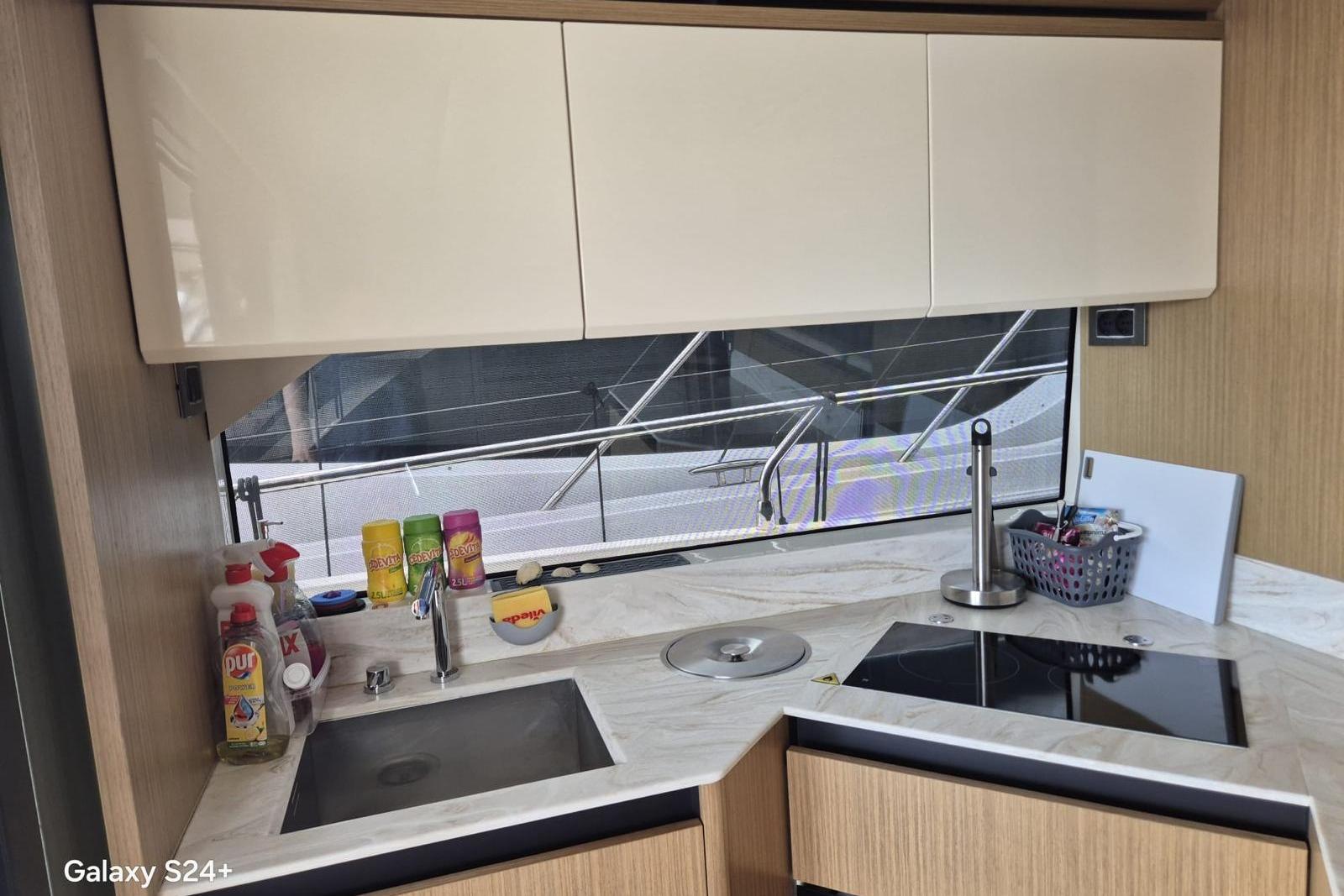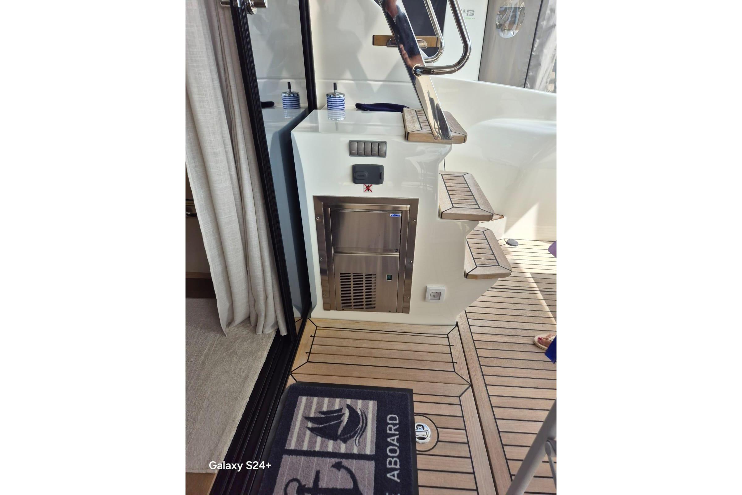 The ordered layout outlines a well-equipped galley that is cleverly connected to the cockpit, a salon with a double sofa, a dining table, and a technologically-advanced steering position. The helm is equipped with a side door to facilitate maneuvering operations with access directly the side walkway.